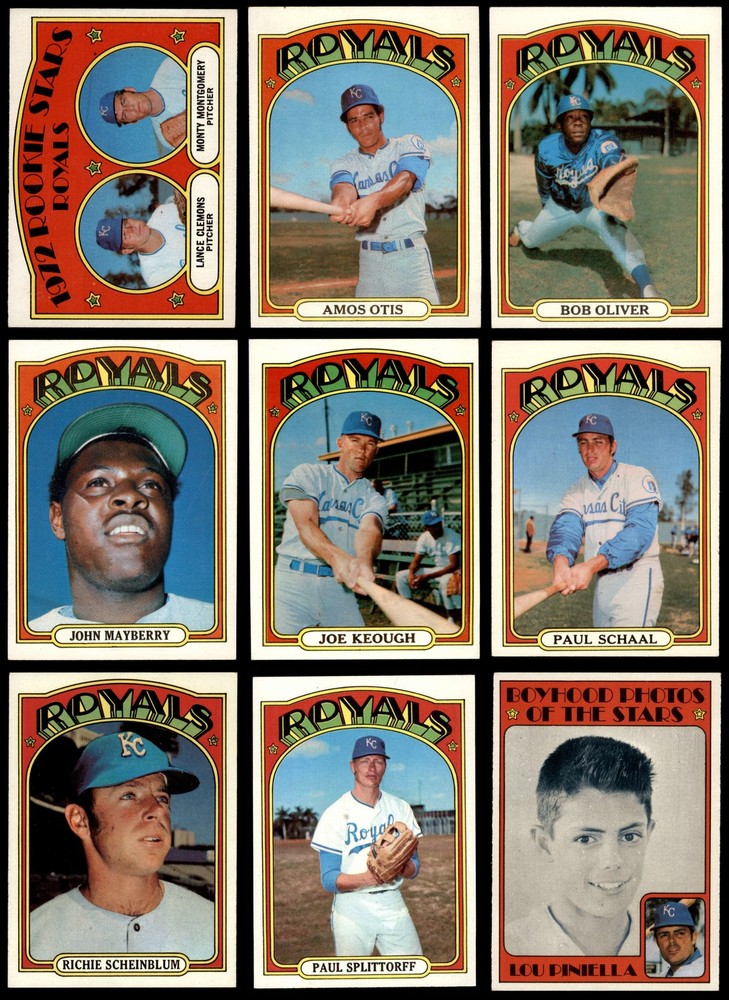This set contains the following cards 1972 Topps #10 Amos Otis 6 - EX/MT Front Back 1972 Topps #57 Bob Oliver 6 - EX/MT Front Back 1972 Topps #68 Jim York 4 - VG/EX Front Back 1972 Topps #81 Mike Hedlund 5 - EX Front Back 1972 Topps #109 Jerry May 6 - EX/MT Front Back 1972 Topps #133 Joe Keough 6 - EX/MT Front Back 1972 Topps #177 Paul Schaal 6 - EX/MT Front Back 1972 Topps #178 - Paul Schaal In Action 5 - EX Front Back 1972 Topps #205 Dick Drago 6 - EX/MT Front Back 1972 Topps #246 Tom Burgmeier 6 - EX/MT Front Back 1972 Topps #273 Bobby Floyd 6 - EX/MT Front Back 1972 Topps #315 Paul Splittorff 7 - NM Front Back 1972 Topps #332 Buck Martinez 6 - EX/MT Front Back 1972 Topps #349 Al Fitzmorris 6 - EX/MT Front Back 1972 Topps #372 - Lance Clemons / Monty Montgomery Royals Rookies 6 - EX/MT Front Back 1972 Topps #373 John Mayberry 6 - EX/MT Front Back 1972 Topps #415 Cookie Rojas 6 - EX/MT Front Back 1972 Topps #449 Bob Lemon 7 - NM Front Back 1972 Topps #468 Richie Scheinblum 6 - EX/MT Front Back 1972 Topps #491 - Lou Piniella Boyhood Photo 6 - EX/MT Front Back 1972 Topps #519 Ted Abernathy 6 - EX/MT Front Back 1972 Topps #531 Freddie Patek 7 - NM Front Back 1972 Topps #569 Ed Kirkpatrick 6 - EX/MT Front Back 1972 Topps #570 - Ed Kirkpatrick In Action 4 - VG/EX Front Back 1972 Topps #580 Lou Piniella 6 - EX/MT Front Back 1972 Topps #617 Royals Team 6 - EX/MT Front Back 1972 Topps #638 Ken Wright 6 - EX/MT Front Back 1972 Topps #664 Bobby Knoop PSA 7 - NM Front Back 1972 Topps #683 Steve Hovley 6 - EX/MT Front Back 1972 Topps #717 Bruce Dal Canton 6 - EX/MT Front Back 1972 Topps #728 Gail Hopkins 6 - EX/MT Front Back 1972 Topps #742 Jim Rooker 8 - NM/MT Front Back 1972 Topps #763 Ron Hansen 7 - NM Front Back This 1972 Topps Kansas City Royals Team Set contains the 1972 Topps Royals baseball cards and makes a great gift for any Royals fan. ?With an inventory of over 15,000 team sets, Dean's Cards has Team Sets & Near Team Sets for just about every team, in multiple conditions, for all sports, for most major sets issued between 1909 and 1979. Set breakdown by grade: Number of Cards in Set 33 Average Grade - Weighted by Value 6.55 - EX/MT+ Average Grade - Unweighted 6.03 - EX/MT Grade Breakdown 8 - NM/MT 1 PSA 7 - NM 1 7 - NM 4 6 - EX/MT 23 5 - EX 2 4 - VG/EX 2 Dean's Cards offers a 100% Money Back Satisfaction Guarantee on all purchases. Just contact us within 10 days of the purchase date and we will refund your money or, when possible, replace the cards. 1972 Topps Kansas City Royals Team Set 6.5 - EX/MT+ 6909967 If the scan in the listing says ACTUAL IMAGE, you will receive the card pictured. For cards issued after 1983, we will often use representative images and you will not receive the exact card pictured. Shipping Policy You only pay shipping on the first item. If you order multiple items on the same order, you will only be charged once for shipping. We do not combine shipping on multiple orders. To avoid multiple shipping charges we recommend using eBay's "Add to Cart" feature to check out multiple items in one transaction, or please request and allow for us to send an invoice to reflect the combined shipping charges. Canadian customers - We send all of our Canadian/International packages with tracking and cannot make any exceptions to this policy. Negotiating Prices All prices are final and we do not negotiate. This policy is to ensure that everyone knows that they are getting our best possible price. So please do not ask us to negotiate on price. Return Policy Dean's Cards has a 100% Money Back Satisfaction Guarantee on all purchases, as long as the product is returned within 30 days of receiving the product. Card Grading Each card is first reviewed by a member of our team, in order to detect any flaws that may not be visible on a scan, such as wrinkles, creases, print spots, or light stains. The vast majority of our vintage cards are professionally graded by the Dean's Cards Grading Software and include a 100% satisfaction guarantee. Our grading is on par with PSA standards when it comes to corners, centering and flaws - and tends to grade a bit tougher than PSA, on cards with a tilted image or rough edges. This grading software was developed to provide far better grading and consistency than can be achieved using the human eye. Determining the card's grade The sharpness of the corners and the degree to which a card was cut off-center determines the maximum possible grade that the card can receive. The card's grade is further reduced by any flaws or blemishes that it may have. Each card is evaluated on the following characteristics and assigned a score. Corners - Each corner of a card is individually analyzed, and then assigned a score on how square, sharp, and flawless it appears. Centering - The borders are measured, at multiple points along the edge, to determine the horizontal and vertical centering and tilt. Defects - The card is examined for imperfections, such as: size, print flaws, dings, stains, creases, or other wear which could lower its grade. Bonus for Perfect Centering - A vintage card, with near perfect centering, is given a one-half grade bonus. So when you buy one of our cards with a half-grade (e.g. 3.5 or 6.5) it will appear perfectly centered, both vertically and horizontally. Grading Criteria Worst Corner - A card can grade only as high as the worst corner will allow. Average Corner Tilt - The difference in width of a card border near the top, compared to the bottom. OCT - The sum of how far a card is Off-Center, plus its Tilt. Minimum Centering Requirements Eye Appeal - The combination of a card's centering, corners and tilt. Well-Centered - Cards that appear perfectly centered receive a bonus of one-half grade. Flaws, defects and other imperfections - can lower a card's grade. Card Backs - the above criteria is also considered, for the back of the cards, but does not inflict as severe of a penalty to its grade. Packaging Once scanned, the cards are placed in 