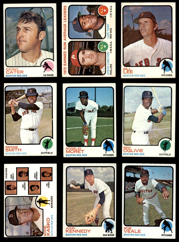 This set contains the following cards 1973 Topps #14 Sonny Siebert 3 - VG Front Back 1973 Topps #40 Reggie Smith 4 - VG/EX Front Back 1973 Topps #65 - Steve Carlton / Luis Tiant ERA Leaders 3 - VG Front Back 1973 Topps #69 Phil Gagliano 3 - VG Front Back 1973 Topps #96 Doug Griffin 3 - VG Front Back 1973 Topps #114 Lynn McGlothen 3 - VG Front Back 1973 Topps #131 BRN - Eddie Kasko / Doug Camilli / Don Lenhardt / Eddie Popowski / Lee Stange Red Sox Leaders 3 - VG Front Back 1973 Topps #143 John Curtis 3 - VG Front Back 1973 Topps #165 Luis Aparicio 3 - VG Front Back 1973 Topps #193 Carlton Fisk 2 - GOOD Front Back 1973 Topps #224 Bill Lee 4 - VG/EX Front Back 1973 Topps #245 Carl Yastrzemski 3 - VG Front Back 1973 Topps #270 Luis Tiant 4 - VG/EX Front Back 1973 Topps #291 Rogelio Moret 4 - VG/EX Front Back 1973 Topps #317 Danny Cater 3 - VG Front Back 1973 Topps #365 Rico Petrocelli 4 - VG/EX Front Back 1973 Topps #388 Ben Oglivie 4 - VG/EX Front Back 1973 Topps #415 Marty Pattin 5 - EX Front Back 1973 Topps #437 John Kennedy 4 - VG/EX Front Back 1973 Topps #463 Ken Tatum 4 - VG/EX Front Back 1973 Topps #491 Bob Montgomery 4 - VG/EX Front Back 1973 Topps #518 Bob Veale 4 - VG/EX Front Back 1973 Topps #541 Bobby Bolin 3 - VG Front Back 1973 Topps #566 Lew Krausse 6 - EX/MT Front Back 1973 Topps #596 Red Sox Team 4 - VG/EX Front Back 1973 Topps #614 - Dwight Evans / Al Bumbry / Charlie Spikes Rookie Outfielders 6 - EX/MT Front Back 1973 Topps #620 Tommy Harper 4 - VG/EX Front Back 1973 Topps Boston Red Sox Team Set has all of the standard cards. The cards not included are expensive multi-team rookie cards, that were left out of the team set to keep the cost down. The 1973 Topps was the first set to feature all of multi-player rookie cards by position, instead of by their respective teams. To make a bad idea even worse, Topps waited until 7th Series to issue this cards, making them expensive, as well as undesired. As a result, the 1973 Topps multi-player rookie cards are not considered part of 1973 Topps Team Sets. We feel that they do not offer enough value to team sets to offset the additional expense. If you dis-agree, the 1973 multi-team rookie cards can be purchased individually on our site. Set breakdown by grade: Number of Cards in Set 27 Average Grade - Weighted by Value 4.72 - VG/EX+ Average Grade - Unweighted 3.70 - VG+ Grade Breakdown 6 - EX/MT 2 5 - EX 1 4 - VG/EX 12 3 - VG 11 2 - GOOD 1 The following cards are omitted from this set: #616 Rookie Pitchers - Norm Angelini / Steve Blateric / Mike Garman, #477 All-Time Victory Leader - Cy Young and #607 Rookie Shortstops - Ray Busse / Pepe Frias / Mario Guerrero Dean's Cards offers a 100% Money Back Satisfaction Guarantee on all purchases. Just contact us within 10 days of the purchase date and we will refund your money or, when possible, replace the cards. 1973 Topps Boston Red Sox Team Set 4.5 - VG/EX+ 6910743 If the scan in the listing says ACTUAL IMAGE, you will receive the card pictured. For cards issued after 1983, we will often use representative images and you will not receive the exact card pictured. Shipping Policy You only pay shipping on the first item. If you order multiple items on the same order, you will only be charged once for shipping. We do not combine shipping on multiple orders. To avoid multiple shipping charges we recommend using eBay's "Add to Cart" feature to check out multiple items in one transaction, or please request and allow for us to send an invoice to reflect the combined shipping charges. Canadian customers - We send all of our Canadian/International packages with tracking and cannot make any exceptions to this policy. Negotiating Prices All prices are final and we do not negotiate. This policy is to ensure that everyone knows that they are getting our best possible price. So please do not ask us to negotiate on price. Return Policy Dean's Cards has a 100% Money Back Satisfaction Guarantee on all purchases, as long as the product is returned within 30 days of receiving the product. Card Grading Each card is first reviewed by a member of our team, in order to detect any flaws that may not be visible on a scan, such as wrinkles, creases, print spots, or light stains. The vast majority of our vintage cards are professionally graded by the Dean's Cards Grading Software and include a 100% satisfaction guarantee. Our grading is on par with PSA standards when it comes to corners, centering and flaws - and tends to grade a bit tougher than PSA, on cards with a tilted image or rough edges. This grading software was developed to provide far better grading and consistency than can be achieved using the human eye. Determining the card's grade The sharpness of the corners and the degree to which a card was cut off-center determines the maximum possible grade that the card can receive. The card's grade is further reduced by any flaws or blemishes that it may have. Each card is evaluated on the following characteristics and assigned a score. Corners - Each corner of a card is individually analyzed, and then assigned a score on how square, sharp, and flawless it appears. Centering - The borders are measured, at multiple points along the edge, to determine the horizontal and vertical centering and tilt. Defects - The card is examined for imperfections, such as: size, print flaws, dings, stains, creases, or other wear which could lower its grade. Bonus for Perfect Centering - A vintage card, with near perfect centering, is given a one-half grade bonus. So when you buy one of our cards with a half-grade (e.g. 3.5 or 6.5) it will appear perfectly centered, both vertically and horizontally. Grading Criteria Worst Corner - A card can grade only as high as the worst corner will allow. Average Corner Tilt - The difference in width of a card border near the top, compared to the bottom. OCT - The sum of how far a card is Off-Center, plus its Tilt. Minimum Centering Requirements Eye Appeal - The combination of a card's center