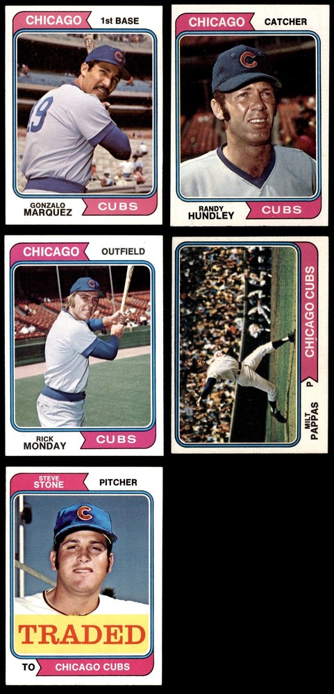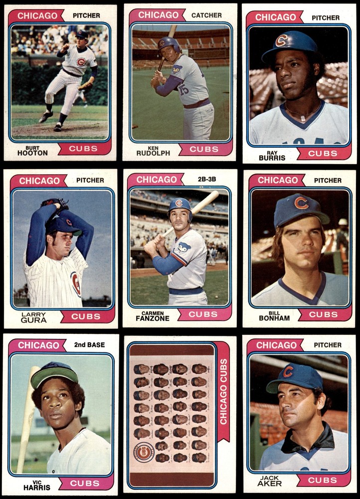This set contains the following cards 1974 Topps Red Team Checklist Chicago Cubs Red Team Checklist 5 - EX Front Back 1974 Topps #110 Billy Williams 6 - EX/MT Front Back 1974 Topps #157 Vic Harris 7 - NM Front Back 1974 Topps #161 Ray Burris 7 - NM Front Back 1974 Topps #211 Cubs Team 6 - EX/MT Front Back 1974 Topps Traded #249 T - George Mitterwald Traded 7 - NM Front Back 1974 Topps #258 Jerry Morales 7 - NM Front Back 1974 Topps #270 Ron Santo 7 - NM Front Back 1974 Topps #295 Rick Monday 8 - NM/MT Front Back 1974 Topps #319 Randy Hundley 7 - NM Front Back 1974 Topps #334 - Brooks Robinson / Ron Santo All-Star Third Baseman 6 - EX/MT Front Back 1974 Topps #354 - Whitey Lockman / Hank Aguirre / Jim Marshall / J.C. Martin / Al Spangler Cubs Leaders 5 - EX Front Back 1974 Topps #378 Burt Hooton 6 - EX/MT Front Back 1974 Topps #422 Gonzalo Marquez 7 - NM Front Back 1974 Topps #452 Gene Hiser 8 - NM/MT Front Back 1974 Topps #484 Carmen Fanzone 7 - NM Front Back 1974 Topps Traded #486 T - Steve Stone Traded 7 - NM Front Back 1974 Topps #502 Dave LaRoche 6 - EX/MT Front Back 1974 Topps Traded #516 T - Horacio Pina Traded 6 - EX/MT Front Back 1974 Topps #528 Bill Bonham 6 - EX/MT Front Back 1974 Topps #562 Jack Aker 7 - NM Front Back 1974 Topps #584 Ken Rudolph 7 - NM Front Back 1974 Topps #616 Larry Gura 7 - NM Front Back 1974 Topps #640 Milt Pappas 6 - EX/MT Front Back 1974 Topps #656 Adrian Garrett 7 - NM Front Back This is a 1974 Topps Chicago Cubs Near Team Set. Dean's Cards has designed our Near Complete Team Sets using the majority of cards for that team - leaving out the expensive super-star rookie cards, high numbers, short-prints, and multi-player rookie cards, reducing the price. the other cards can then be added, from our inventory of over a million cards, as your budget allows. For the exact cards contained in this set, as well as their front and back scans, please see the description below. Set breakdown by grade: Number of Cards in Set 25 Average Grade - Weighted by Value 6.80 - NM Average Grade - Unweighted 6.60 - EX/MT+ Grade Breakdown 8 - NM/MT 2 7 - NM 13 6 - EX/MT 8 5 - EX 2 . This near team set contains 25 cards out of the possible 37 cards. This is not a complete set. The following cards have been omitted, in order to keep the cost of the set reasonable, and can be purchased separately.#598 Rookie Outfielders - Ken Griffey / Dave Augustine / Steve Ontiveros / Jim Tyrone, #600 Rookie Infielders - Bill Madlock / Ron Cash / Jim Cox / Reggie Sanders, #603 Rookie Catchers - Charlie Moore / Barry Foote / Tom Lundstedt / Sergio Robles, #604 Rookie Infielders - Frank White / Andre Thornton / Terry Hughes / John Knox and #607 Rookie Shortstops - Frank Taveras / Leo Foster / Tom Heintzelman / Dave Rosello This set does not include the following cards: #14 Paul Popovich, #38 Don Kessinger, #62 Bob Locker, #136 Rick Reuschel, #185 Jose Cardenal, #338 All-Star Right Fielders - Reggie Jackson / Billy Williams, #399 Mike Paul Dean's Cards offers a 100% Money Back Satisfaction Guarantee on all purchases. Just contact us within 10 days of the purchase date and we will refund your money or, when possible, replace the cards. 1974 Topps Chicago Cubs Near Team Set 7 - NM 6909896 (25 / 37 cards) If the scan in the listing says ACTUAL IMAGE, you will receive the card pictured. For cards issued after 1983, we will often use representative images and you will not receive the exact card pictured. Shipping Policy You only pay shipping on the first item. If you order multiple items on the same order, you will only be charged once for shipping. We do not combine shipping on multiple orders. To avoid multiple shipping charges we recommend using eBay's "Add to Cart" feature to check out multiple items in one transaction, or please request and allow for us to send an invoice to reflect the combined shipping charges. Canadian customers - We send all of our Canadian/International packages with tracking and cannot make any exceptions to this policy. Negotiating Prices All prices are final and we do not negotiate. This policy is to ensure that everyone knows that they are getting our best possible price. So please do not ask us to negotiate on price. Return Policy Dean's Cards has a 100% Money Back Satisfaction Guarantee on all purchases, as long as the product is returned within 30 days of receiving the product. Card Grading Each card is first reviewed by a member of our team, in order to detect any flaws that may not be visible on a scan, such as wrinkles, creases, print spots, or light stains. The vast majority of our vintage cards are professionally graded by the Dean's Cards Grading Software and include a 100% satisfaction guarantee. Our grading is on par with PSA standards when it comes to corners, centering and flaws - and tends to grade a bit tougher than PSA, on cards with a tilted image or rough edges. This grading software was developed to provide far better grading and consistency than can be achieved using the human eye. Determining the card's grade The sharpness of the corners and the degree to which a card was cut off-center determines the maximum possible grade that the card can receive. The card's grade is further reduced by any flaws or blemishes that it may have. Each card is evaluated on the following characteristics and assigned a score. Corners - Each corner of a card is individually analyzed, and then assigned a score on how square, sharp, and flawless it appears. Centering - The borders are measured, at multiple points along the edge, to determine the horizontal and vertical centering and tilt. Defects - The card is examined for imperfections, such as: size, print flaws, dings, stains, creases, or other wear which could lower its grade. Bonus for Perfect Centering - A vintage card, with near perfect centering, is given a one-half grade bonus. So when you buy one of our cards with a half-grade (e.g. 3.5 or 6.5) it will appear perfectly centered, both vertically and horizontally. Grad