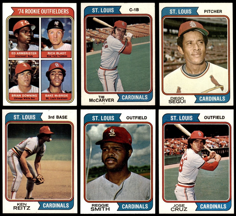 This set contains the following cards 1974 Topps #15 Joe Torre 7 - NM Front Back 1974 Topps Traded #51 T - Bob Heise Traded 7 - NM Front Back 1974 Topps #60 Lou Brock 6 - EX/MT Front Back 1974 Topps #108 Al Hrabosky 7 - NM Front Back 1974 Topps #151 Diego Segui 7 - NM Front Back 1974 Topps #175 Reggie Cleveland 7 - NM Front Back 1974 Topps #236 - Red Schoendienst / Vern Benson / George Kissell / Johnny Lewis / Barney Schultz Cardinals Leaders 6 - EX/MT Front Back 1974 Topps #260 Ted Simmons 6 - EX/MT Front Back 1974 Topps #285 Reggie Smith 7 - NM Front Back 1974 Topps #307 Luis Melendez 7 - NM Front Back 1974 Topps Traded #348 T - Pete Richert Traded 7 - NM Front Back 1974 Topps #372 Ken Reitz 8 - NM/MT Front Back 1974 Topps Traded #373 T - John Curtis Traded 7 - NM Front Back 1974 Topps #393 Orlando Pena 7 - NM Front Back 1974 Topps #417 Rich Folkers 6 - EX/MT Front Back 1974 Topps #442 Alan Foster 7 - NM Front Back 1974 Topps #464 Jose Cruz 7 - NM Front Back 1974 Topps #496 Tom Murphy 7 - NM Front Back 1974 Topps #520 Tim McCarver 6 - EX/MT Front Back 1974 Topps #548 Sonny Siebert 7 - NM Front Back 1974 Topps #576 Scipio Spinks 7 - NM Front Back 1974 Topps #601 - Bake McBride / Brian Downing / Ed Armbrister / Rich Bladt Rookie Outfielders 7 - NM Front Back 1974 Topps #630 Tommie Agee 6 - EX/MT Front Back 1974 Topps #655 Mike Tyson 6 - EX/MT Front Back This is a 1974 Topps St. Louis Cardinals Near Team Set. Dean's Cards has designed our Near Complete Team Sets using the majority of cards for that team - leaving out the expensive super-star rookie cards, high numbers, short-prints, and multi-player rookie cards, reducing the price. the other cards can then be added, from our inventory of over a million cards, as your budget allows. For the exact cards contained in this set, as well as their front and back scans, please see the description below. Set breakdown by grade: Number of Cards in Set 24 Average Grade - Weighted by Value 6.81 - NM Average Grade - Unweighted 6.75 - NM Grade Breakdown 8 - NM/MT 1 7 - NM 16 6 - EX/MT 7 . This near team set contains 24 cards out of the possible 32 cards. This is not a complete set. This set does not include the following cards: St. Louis Cardinals Red Team Checklist, #36 Cardinals Team, #204 SB Leaders - Tommy Harper / Lou Brock, #209 Ted Sizemore, #339 All-Star Pitchers - Catfish Hunter / Rick Wise, #350 Bob Gibson, #604 Rookie Infielders - Frank White / Andre Thornton / Terry Hughes / John Knox, #607 Rookie Shortstops - Frank Taveras / Leo Foster / Tom Heintzelman / Dave Rosello Dean's Cards offers a 100% Money Back Satisfaction Guarantee on all purchases. Just contact us within 10 days of the purchase date and we will refund your money or, when possible, replace the cards. 1974 Topps St. Louis Cardinals Near Team Set 7 - NM 6909895 (24 / 32 cards) If the scan in the listing says ACTUAL IMAGE, you will receive the card pictured. For cards issued after 1983, we will often use representative images and you will not receive the exact card pictured. Shipping Policy You only pay shipping on the first item. If you order multiple items on the same order, you will only be charged once for shipping. We do not combine shipping on multiple orders. To avoid multiple shipping charges we recommend using eBay's "Add to Cart" feature to check out multiple items in one transaction, or please request and allow for us to send an invoice to reflect the combined shipping charges. Canadian customers - We send all of our Canadian/International packages with tracking and cannot make any exceptions to this policy. Negotiating Prices All prices are final and we do not negotiate. This policy is to ensure that everyone knows that they are getting our best possible price. So please do not ask us to negotiate on price. Return Policy Dean's Cards has a 100% Money Back Satisfaction Guarantee on all purchases, as long as the product is returned within 30 days of receiving the product. Card Grading Each card is first reviewed by a member of our team, in order to detect any flaws that may not be visible on a scan, such as wrinkles, creases, print spots, or light stains. The vast majority of our vintage cards are professionally graded by the Dean's Cards Grading Software and include a 100% satisfaction guarantee. Our grading is on par with PSA standards when it comes to corners, centering and flaws - and tends to grade a bit tougher than PSA, on cards with a tilted image or rough edges. This grading software was developed to provide far better grading and consistency than can be achieved using the human eye. Determining the card's grade The sharpness of the corners and the degree to which a card was cut off-center determines the maximum possible grade that the card can receive. The card's grade is further reduced by any flaws or blemishes that it may have. Each card is evaluated on the following characteristics and assigned a score. Corners - Each corner of a card is individually analyzed, and then assigned a score on how square, sharp, and flawless it appears. Centering - The borders are measured, at multiple points along the edge, to determine the horizontal and vertical centering and tilt. Defects - The card is examined for imperfections, such as: size, print flaws, dings, stains, creases, or other wear which could lower its grade. Bonus for Perfect Centering - A vintage card, with near perfect centering, is given a one-half grade bonus. So when you buy one of our cards with a half-grade (e.g. 3.5 or 6.5) it will appear perfectly centered, both vertically and horizontally. Grading Criteria Worst Corner - A card can grade only as high as the worst corner will allow. Average Corner Tilt - The difference in width of a card border near the top, compared to the bottom. OCT - The sum of how far a card is Off-Center, plus its Tilt. Minimum Centering Requirements Eye Appeal - The combination of a card's centering, corners and tilt. Well-Centered - Cards that appear perfectly centered recei