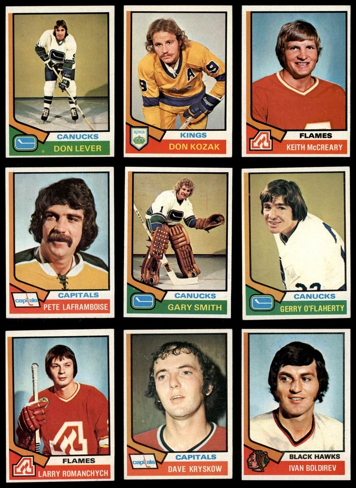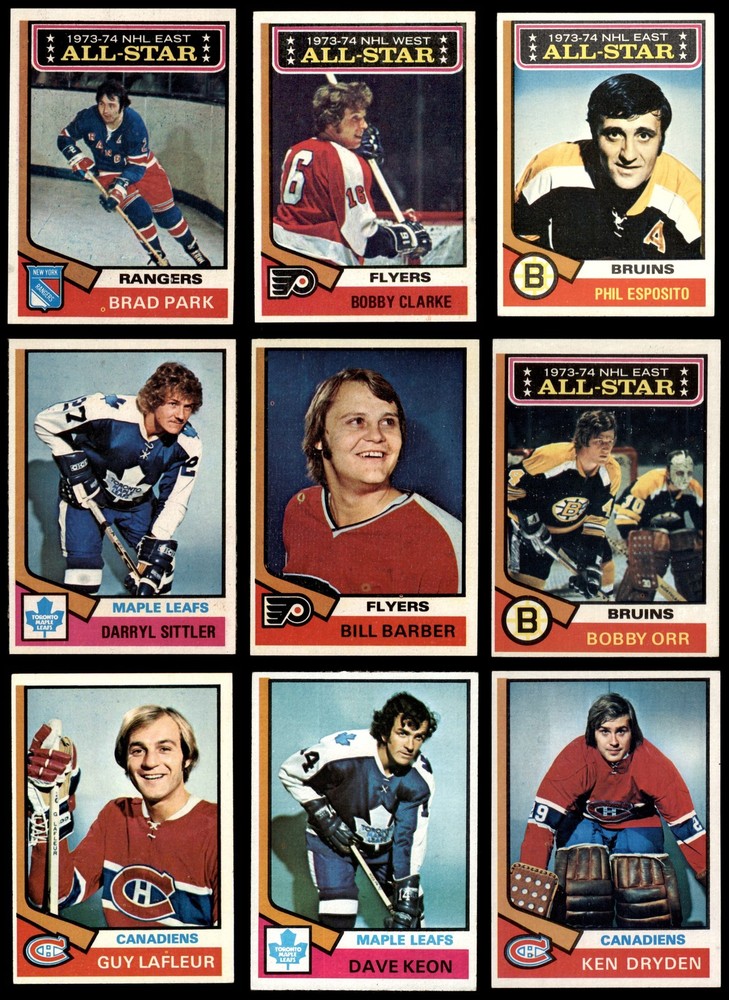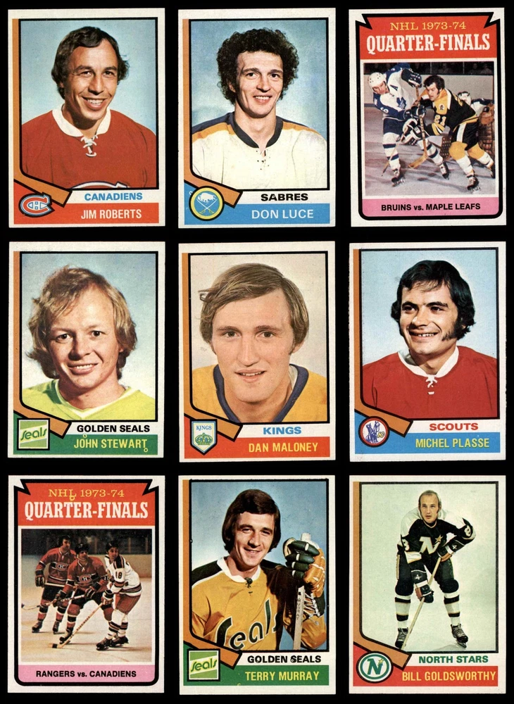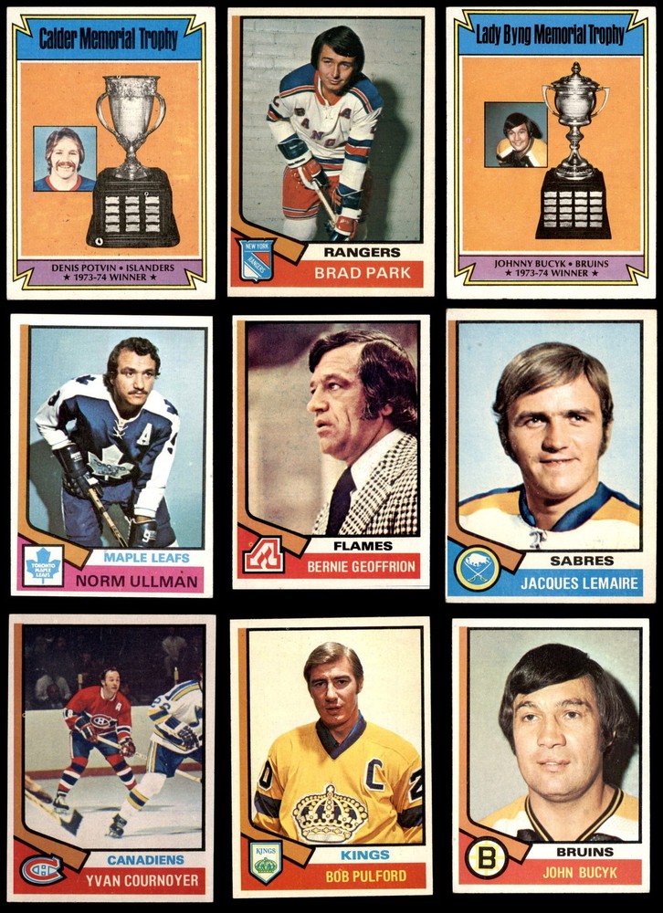 This set contains the following cards 1974 Topps #1 - Phil Esposito / Bill Goldsworthy Goals Leaders 5 - EX Front Back 1974 Topps #2 - Bobby Orr / Dennis Hextall Assists Leaders 4 - VG/EX Front Back 1974 Topps #3 - Phil Esposito / Bobby Clarke Scoring Leaders 5 - EX Front Back 1974 Topps #4 - Doug Favell / Bernie Parent Goals Against Leaders 5 - EX Front Back 1974 Topps #5 - Bryan Watson / Dave Schultz Penalty Minute Leaders 7 - NM Front Back 1974 Topps #6 - Mickey Redmond / Rick MacLeish Power Play Goal Leaders 6 - EX/MT Front Back 1974 Topps #7 Gary Bromley 5 - EX Front Back 1974 Topps #8 Bill Barber 5 - EX Front Back 1974 Topps #9 Emile Francis 5 - EX Front Back 1974 Topps #10 Gilles Gilbert 5 - EX Front Back 1974 Topps #11 John Davidson 6 - EX/MT Front Back 1974 Topps #12 Ron Ellis 5 - EX Front Back 1974 Topps #13 Syl Apps 5 - EX Front Back 1974 Topps #14 - Jacques Richard / Tom Lysiak / Keith McCreary Flames Leaders 5 - EX Front Back 1974 Topps #15 Dan Bouchard 6 - EX/MT Front Back 1974 Topps #16 Ivan Boldirev 5 - EX Front Back 1974 Topps #17 Gary Coalter 4 - VG/EX Front Back 1974 Topps #18 Bob Berry 5 - EX Front Back 1974 Topps #19 Red Berenson 6 - EX/MT Front Back 1974 Topps #20 Stan Mikita 5 - EX Front Back 1974 Topps #21 Fred Shero 6 - EX/MT Front Back 1974 Topps #22 Gary Smith 5 - EX Front Back 1974 Topps #23 Bill Mikkelson 5 - EX Front Back 1974 Topps #24 Jacques Lemaire 3 - VG Front Back 1974 Topps #25 Gilbert Perreault 5 - EX Front Back 1974 Topps #26 Cesare Maniago 5 - EX Front Back 1974 Topps #27 Bobby Schmautz 5 - EX Front Back 1974 Topps #28 - Phil Esposito / Bobby Orr / Johnny Bucyk Bruins Leaders 6 - EX/MT Front Back 1974 Topps #29 Steve Vickers 5 - EX Front Back 1974 Topps #30 Lowell MacDonald 6 - EX/MT Front Back 1974 Topps #31 Fred Stanfield 6 - EX/MT Front Back 1974 Topps #32 Ed Westfall 6 - EX/MT Front Back 1974 Topps #33 Curt Bennett 5 - EX Front Back 1974 Topps #34 Bep Guidolin 5 - EX Front Back 1974 Topps #35 Cliff Koroll 5 - EX Front Back 1974 Topps #36 Gary Croteau 4 - VG/EX Front Back 1974 Topps #37 Mike Corrigan 5 - EX Front Back 1974 Topps #38 Henry Boucha 4 - VG/EX Front Back 1974 Topps #39 Ron Low 5 - EX Front Back 1974 Topps #40 Darryl Sittler 6 - EX/MT Front Back 1974 Topps #41 Tracy Pratt 5 - EX Front Back 1974 Topps #42 - Richard Martin / Rene Robert Sabres Leaders 5 - EX Front Back 1974 Topps #43 Larry Carriere 6 - EX/MT Front Back 1974 Topps #44 Gary Dornhoefer 3 - VG Front Back 1974 Topps #45 Denis Herron 6 - EX/MT Front Back 1974 Topps #46 Doug Favell 6 - EX/MT Front Back 1974 Topps #47 Dave Gardner 5 - EX Front Back 1974 Topps #48 Morris Mott 5 - EX Front Back 1974 Topps #49 Marc Boileau 6 - EX/MT Front Back 1974 Topps #50 Brad Park 5 - EX Front Back 1974 Topps #51 Bob Leiter 5 - EX Front Back 1974 Topps #52 Tom Reid 5.5 - EX+ Front Back 1974 Topps #53 Serge Savard 6 - EX/MT Front Back 1974 Topps #54 Checklist PSA 7 - NM Front Back 1974 Topps #55 Terry Harper 5.5 - EX+ Front Back 1974 Topps #56 - Joey Johnston / Walt McKechnie Seals Leaders 5 - EX Front Back 1974 Topps #57 Guy Charron 6 - EX/MT Front Back 1974 Topps #58 Pit Martin 5 - EX Front Back 1974 Topps #59 Chris Evans 5 - EX Front Back 1974 Topps #60 Bernie Parent 5.5 - EX+ Front Back 1974 Topps #61 Jim Lorentz 5 - EX Front Back 1974 Topps #62 Dave Kryshow 5 - EX Front Back 1974 Topps #63 Lou Angotti 5 - EX Front Back 1974 Topps #64 Bill Flett 5 - EX Front Back 1974 Topps #65 Vic Hadfield 5 - EX Front Back 1974 Topps #66 Wayne Merrick 4 - VG/EX Front Back 1974 Topps #67 Andre Dupont 4 - VG/EX Front Back 1974 Topps #68 Tom Lysiak 5 - EX Front Back 1974 Topps #69 - Jim Pappin / Stan Mikita / J.P. Bordeleau Blackhawks Leaders 5 - EX Front Back 1974 Topps #70 Guy Lapointe 5 - EX Front Back 1974 Topps #71 Gerry O'Flaherly 5 - EX Front Back 1974 Topps #72 Marcel Dionne 6 - EX/MT Front Back 1974 Topps #73 Butch Deadmarsh 5 - EX Front Back 1974 Topps #74 Butch Goring 5 - EX Front Back 1974 Topps #75 Keith Magnuson 5 - EX Front Back 1974 Topps #76 Red Kelly 5 - EX Front Back 1974 Topps #77 Pete Stemkowski 6 - EX/MT Front Back 1974 Topps #78 Jim Roberts 5 - EX Front Back 1974 Topps #79 Don Luce 5 - EX Front Back 1974 Topps #80 Don Awrey 7 - NM Front Back 1974 Topps #81 Rick Kehoe 5 - EX Front Back 1974 Topps #82 Billy Smith 6 - EX/MT Front Back 1974 Topps #83 Jean Parise 4 - VG/EX Front Back 1974 Topps #84 - Mickey Redmond / Marcel Dionne / Bill Hogaboam Red Wings Leaders 5 - EX Front Back 1974 Topps #85 Ed Van Impe 6 - EX/MT Front Back 1974 Topps #86 Randy Manery 5 - EX Front Back 1974 Topps #87 Barclay Plager 5 - EX Front Back 1974 Topps #88 Inge Hammarstrom 6 - EX/MT Front Back 1974 Topps #89 Ab DeMarco 5 - EX Front Back 1974 Topps #90 Bill White 6.5 - EX/MT+ Front Back 1974 Topps #91 Al Arbour 4 - VG/EX Front Back 1974 Topps #92 Bob Stewart 5 - EX Front Back 1974 Topps #93 Jack Egers 6 - EX/MT Front Back 1974 Topps #94 Don Lever 5 - EX Front Back 1974 Topps #95 Reggie Leach 5.5 - EX+ Front Back 1974 Topps #96 Dennis O'Brien 5 - EX Front Back 1974 Topps #97 Peter Mahovlich 5 - EX Front Back 1974 Topps #98 - Butch Goring / Frank St. Marseille / Don Kozak Kings Leaders 5 - EX Front Back 1974 Topps #99 Gerry Meehan 5 - EX Front Back 1974 Topps #100 Bobby Orr 5 - EX Front Back 1974 Topps #101 Jean Potvin 5 - EX Front Back 1974 Topps #102 Rod Seiling 6 - EX/MT Front Back 1974 Topps #103 Keith McCreary 5 - EX Front Back 1974 Topps #104 Phil Maloney 6 - EX/MT Front Back 1974 Topps #105 Denis Dupere 5 - EX Front Back 1974 Topps #106 Steve Durbano 5 - EX Front Back 1974 Topps #107 Bob Plager 5 - EX Front Back 1974 Topps #108 Chris Oddleifson 5 - EX Front Back 1974 Topps #109 Jim Neilson 5 - EX Front Back 1974 Topps #110 Jean Pronovost 5 - EX Front Back 1974 Topps #111 Don Kozak 5 - EX Front Back 1974 Topps #112 - Bill Goldsworthy / Dennis Hextall / Danny Grant North Stars Leaders 5 - EX Front Back 1974 Topps #113 Jim Pappin 6 - EX/MT Front Back 1974 Topps #114 Richard Lemieux 5 - EX Front Back 1974 Topps