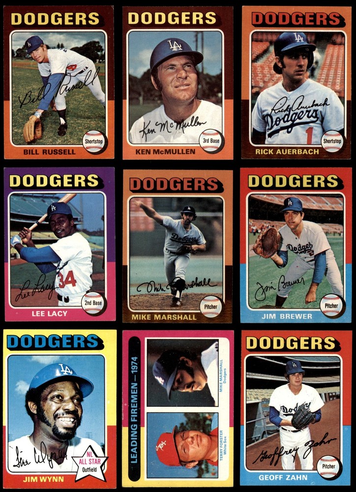 This set contains the following cards 1975 Topps #6 - Mike Marshall Marshall Hurls In 106 Games 3 - VG Front Back 1975 Topps #23 Bill Russell 6 - EX/MT Front Back 1975 Topps #93 Davey Lopes 7 - NM Front Back 1975 Topps #115 Joe Ferguson 7 - NM Front Back 1975 Topps #163 Jim Brewer 6 - EX/MT Front Back 1975 Topps #186 Willie Crawford 5 - EX Front Back 1975 Topps #212 - Jeff Burroughs / Steve Garvey 1974 MVPs 5 - EX Front Back 1975 Topps #220 Don Sutton 3 - VG Front Back 1975 Topps #269 Doug Rau 3 - VG Front Back 1975 Topps #294 Geoff Zahn 6 - EX/MT Front Back 1975 Topps #313 - Mike Marshall / Terry Forster Leading Firemen 4 - VG/EX Front Back 1975 Topps #330 Mike Marshall 6 - EX/MT Front Back 1975 Topps #361 - Walter Alston Dodgers Team Checklist 6 - EX/MT Front Back 1975 Topps #376 Steve Yeager 7 - NM Front Back 1975 Topps #390 Ron Cey 5 - EX Front Back 1975 Topps #414 Manny Mota 6.5 - EX/MT+ Front Back 1975 Topps #440 Andy Messersmith 3 - VG Front Back 1975 Topps #460 - Steve Garvey / Frank Taveras 1974 NL Championships 5 - EX Front Back 1975 Topps #473 Ken McMullen 5 - EX Front Back 1975 Topps #498 Al Downing 4.5 - VG/EX+ Front Back 1975 Topps #523 Tom Paciorek 3 - VG Front Back 1975 Topps #547 Von Joshua 3 - VG Front Back 1975 Topps #570 Jim Wynn 5 - EX Front Back 1975 Topps #588 Rick Auerbach 6 - EX/MT Front Back 1975 Topps #631 Lee Lacy 5 - EX Front Back This is a 1975 Topps Los Angeles Dodgers Near Team Set. Included are the 1974 World Series cards. Set breakdown by grade: Number of Cards in Set 25 Average Grade - Weighted by Value 5.47 - EX+ Average Grade - Unweighted 5.00 - EX Grade Breakdown 7 - NM 3 6.5 - EX/MT+ 1 6 - EX/MT 6 5 - EX 7 4.5 - VG/EX+ 1 4 - VG/EX 1 3 - VG 6 . This near team set contains 25 cards out of the possible 44 cards. This is not a complete set. "The following cards are omitted, in order to keep the cost of the set reasonable: "#189 1951 MVPs - Yogi Berra / Roy Campanella, #191 1953 MVPs - Roy Campanella / Al Rosen, #193 1955 MVPs - Yogi Berra / Roy Campanella, #194 1956 MVPs - Mickey Mantle / Don Newcombe, #200 1962 MVPs - Mickey Mantle / Maury Wills, #201 1963 MVPs - Sandy Koufax / Elston Howard, #310 Pitching Leaders - Catfish Hunter / Ferguson Fergie Jenkins / Andy Messersmith / Phil Niekro, #461 1974 World Series - Game #1 - Reggie Jackson, #462 1974 World Series - Game #2 - Walter Alston / Joe Ferguson, #463 1974 World Series - Game #3 - Rollie Fingers, #464 1974 World Series - Game #4 - Ken Holtzman / Steve Yeager, #465 1974 World Series - Game #5 - Joe Rudi / Ron Cey, #466 1974 World Series - Summary - A's Do it Again - Rollie Fingers / Reggie Jackson / Dick Williams, #618 Rookie Pitchers - Scott McGregor / Rick Rhoden / Jamie Easterly / Tom Johnson and #624 Rookie Pitchers - Gary Lavelle / Doug Konieczny / Jim Otten / Eddie Solomon This set does not include the following cards: #47 Tommy John, #71 Charlie Hough, #140 Steve Garvey, #244 Bill Buckner Dean's Cards offers a 100% Money Back Satisfaction Guarantee on all purchases. Just contact us within 10 days of the purchase date and we will refund your money or, when possible, replace the cards. 1975 Topps Los Angeles Dodgers Near Team Set 5.5 - EX+ 6902023 (25 / 44 cards) If the scan in the listing says ACTUAL IMAGE, you will receive the card pictured. For cards issued after 1983, we will often use representative images and you will not receive the exact card pictured. Shipping Policy You only pay shipping on the first item. If you order multiple items on the same order, you will only be charged once for shipping. We do not combine shipping on multiple orders. To avoid multiple shipping charges we recommend using eBay's "Add to Cart" feature to check out multiple items in one transaction, or please request and allow for us to send an invoice to reflect the combined shipping charges. Canadian customers - We send all of our Canadian/International packages with tracking and cannot make any exceptions to this policy. Negotiating Prices All prices are final and we do not negotiate. This policy is to ensure that everyone knows that they are getting our best possible price. So please do not ask us to negotiate on price. Return Policy Dean's Cards has a 100% Money Back Satisfaction Guarantee on all purchases, as long as the product is returned within 30 days of receiving the product. Card Grading Each card is first reviewed by a member of our team, in order to detect any flaws that may not be visible on a scan, such as wrinkles, creases, print spots, or light stains. The vast majority of our vintage cards are professionally graded by the Dean's Cards Grading Software and include a 100% satisfaction guarantee. Our grading is on par with PSA standards when it comes to corners, centering and flaws - and tends to grade a bit tougher than PSA, on cards with a tilted image or rough edges. This grading software was developed to provide far better grading and consistency than can be achieved using the human eye. Determining the card's grade The sharpness of the corners and the degree to which a card was cut off-center determines the maximum possible grade that the card can receive. The card's grade is further reduced by any flaws or blemishes that it may have. Each card is evaluated on the following characteristics and assigned a score. Corners - Each corner of a card is individually analyzed, and then assigned a score on how square, sharp, and flawless it appears. Centering - The borders are measured, at multiple points along the edge, to determine the horizontal and vertical centering and tilt. Defects - The card is examined for imperfections, such as: size, print flaws, dings, stains, creases, or other wear which could lower its grade. Bonus for Perfect Centering - A vintage card, with near perfect centering, is given a one-half grade bonus. So when you buy one of our cards with a half-grade (e.g. 3.5 or 6.5) it will appear perfectly centered, both vertically and horizontally. Grading Criteria Worst Corner - A ca