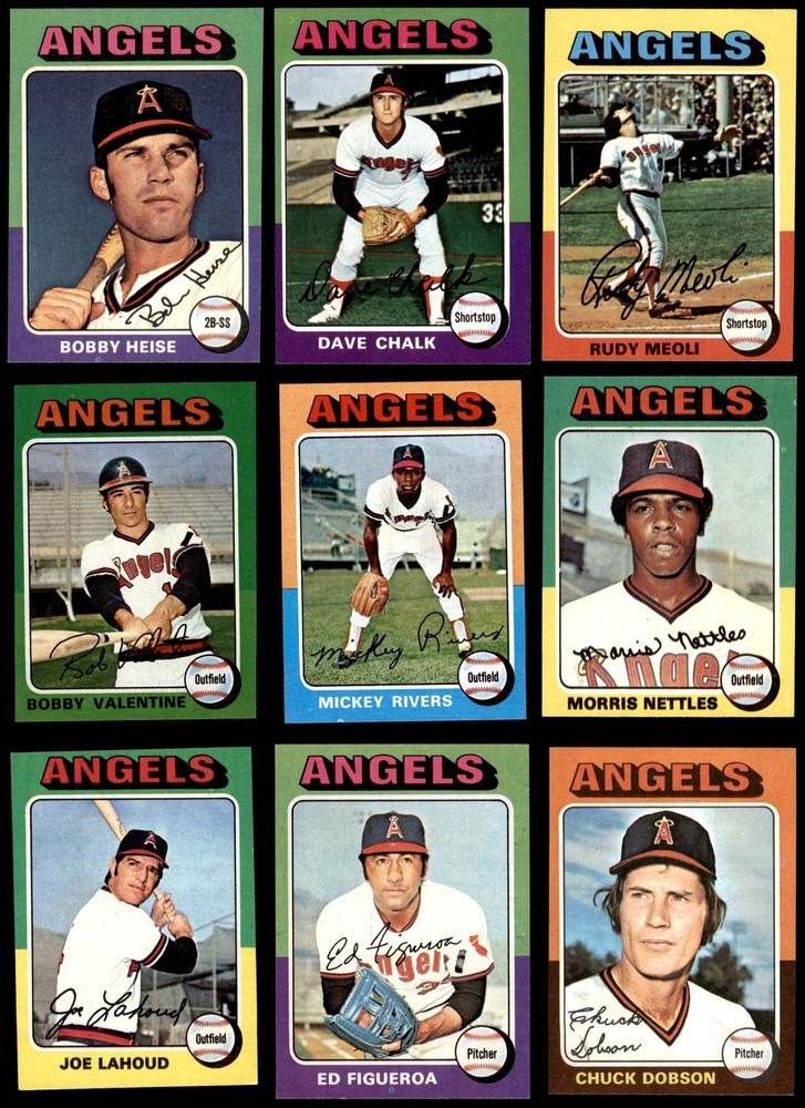 This set contains the following cards 1975 Topps Mini #40 Bill Singer 5 - EX Front Back 1975 Topps Mini #64 Dave Chalk 6 - EX/MT Front Back 1975 Topps Mini #88 Tom Egan 7 - NM Front Back 1975 Topps Mini #164 Mickey Rivers 6 - EX/MT Front Back 1975 Topps Mini #215 Bobby Valentine 6 - EX/MT Front Back 1975 Topps Mini #261 Andy Hassler 6 - EX/MT Front Back 1975 Topps Mini #285 Ellie Rodriguez 7 - NM Front Back 1975 Topps Mini #317 Joe Lahoud 7 - NM Front Back 1975 Topps Mini #342 Leroy Stanton 6 - EX/MT Front Back 1975 Topps Mini #417 Skip Lockwood 5 - EX Front Back 1975 Topps Mini #441 Bob Heise 7 - NM Front Back 1975 Topps Mini #476 Ed Figueroa 8 - NM/MT Front Back 1975 Topps Mini #524 John Doherty 6 - EX/MT Front Back 1975 Topps Mini #533 Rudy Meoli 8 - NM/MT Front Back 1975 Topps Mini #548 Charlie Sands 7 - NM Front Back 1975 Topps Mini #573 Orlando Pena 7 - NM Front Back 1975 Topps Mini #597 Winston Llenas 7 - NM Front Back 1975 Topps Mini #632 Morris Nettles 7 - NM Front Back 1975 Topps Mini #635 Chuck Dobson 7 - NM Front Back This 1975 Topps MINI California Angels Near Team Set contains the majority of the 1975 Topps Mini Angels baseball cards and makes a great gift for any Angels fan. ?With an inventory of over 20,000 team sets, Dean's Cards has Team Sets & Near Team Sets in multiple conditions. The 1975 Topps Mini Baseball Cards are a miniature replica of the regular 1975 Topps Baseball Set with each card measuring 2 1/4 by 3 1/8. For the exact cards contained in this set, as well as their front and back scans, please see the description below.