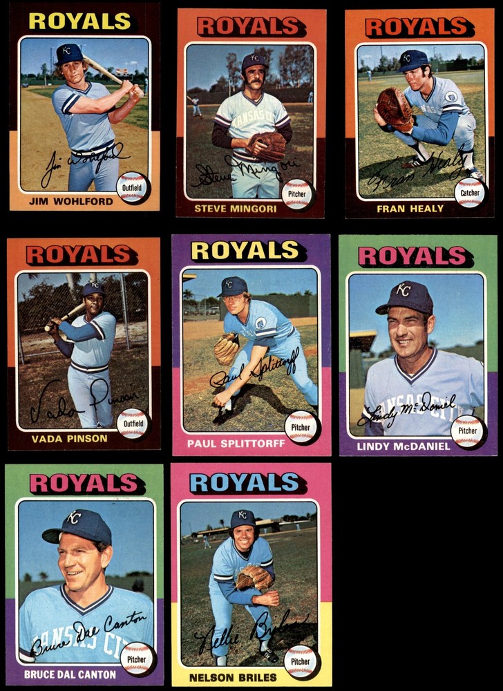 This set contains the following cards 1975 Topps Mini #24 Al Fitzmorris 6 - EX/MT Front Back 1975 Topps Mini #95 John Mayberry 5 - EX Front Back 1975 Topps Mini #120 Steve Busby 5 - EX Front Back 1975 Topps Mini #144 Jim Wohlford 7 - NM Front Back 1975 Topps Mini #169 Cookie Rojas 6 - EX/MT Front Back 1975 Topps Mini #251 Fran Healy 7 - NM Front Back 1975 Topps Mini #295 Vada Pinson 8 - NM/MT Front Back 1975 Topps Mini #314 Buck Martinez 6 - EX/MT Front Back 1975 Topps Mini #340 Paul Splittorff 6 - EX/MT Front Back 1975 Topps Mini #364 Doug Bird 6 - EX/MT Front Back 1975 Topps Mini #413 Marty Pattin 6 - EX/MT Front Back 1975 Topps Mini #437 Al Cowens 6 - EX/MT Front Back 1975 Topps Mini #472 Bruce Dal Canton 6 - EX/MT Front Back 1975 Topps Mini #495 Nelson Briles 7 - NM Front Back 1975 Topps Mini #544 Steve Mingori 7 - NM Front Back 1975 Topps Mini #629 Joe Hoerner 6 - EX/MT Front Back 1975 Topps Mini #652 Lindy McDaniel 7 - NM Front Back This 1975 Topps MINI Kansas City Royals Near Team Set contains the majority of the 1975 Topps Mini Royals baseball cards and makes a great gift for any Royals fan. ?With an inventory of over 20,000 team sets, Dean's Cards has Team Sets & Near Team Sets in multiple conditions. The 1975 Topps Mini Baseball Cards are a miniature replica of the regular 1975 Topps Baseball Set with each card measuring 2 1/4 by 3 1/8. For the exact cards contained in this set, as well as their front and back scans, please see the description below.