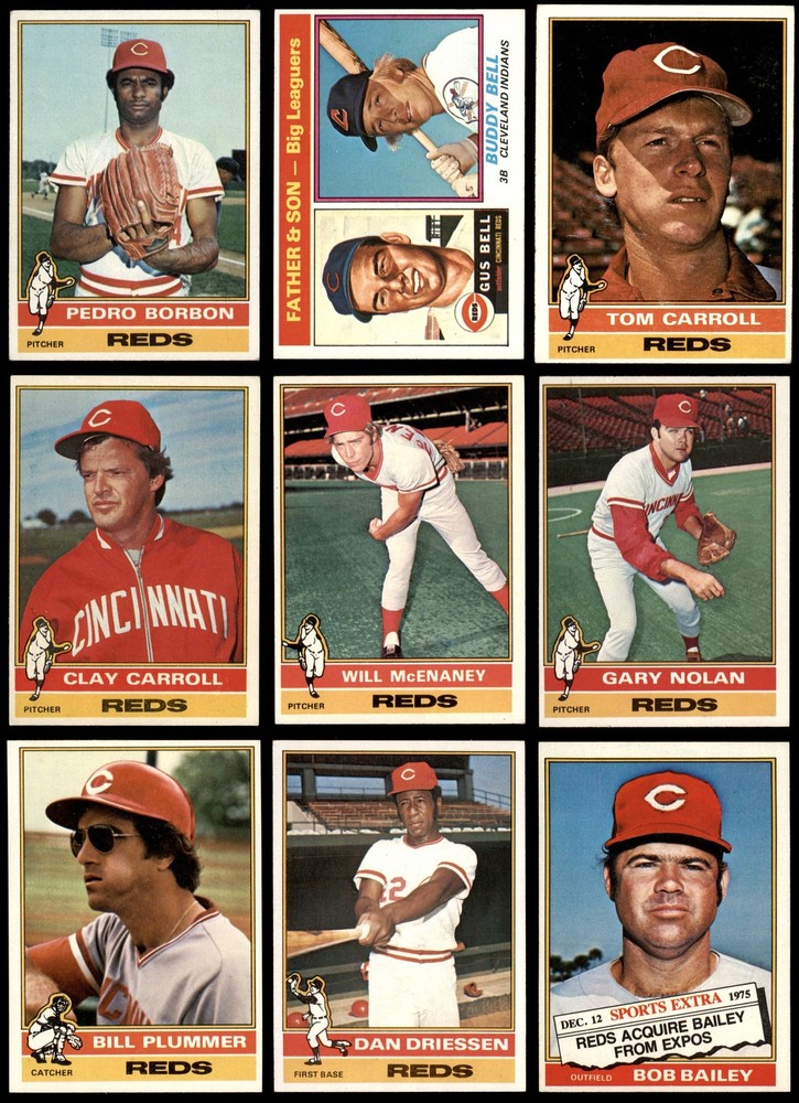 This set contains the following cards 1976 Topps #24 Cesar Geronimo 5 - EX Front Back 1976 Topps #48 Dave Concepcion 3 - VG Front Back 1976 Topps #66 - Gus Bell / Buddy Bell Father & Son 5 - EX Front Back 1976 Topps #77 Pedro Borbon 3 - VG Front Back 1976 Topps #104 - Sparky Anderson Reds Team Checklist 5 - EX Front Back 1976 Topps #128 Ken Griffey 5 - EX Front Back 1976 Topps #155 Jack Billingham 6 - EX/MT Front Back 1976 Topps #179 George Foster 5 - EX Front Back 1976 Topps #195 - Johnny Bench / Tony Perez / Greg Luzinski NL RBI Leaders 6 - EX/MT Front Back 1976 Topps #197 - Joe Morgan / Lou Brock / Dave Lopes NL SB Leaders 6 - EX/MT Front Back 1976 Topps Traded #208 T Mike Lum 5 - EX Front Back 1976 Topps #211 Clay Carroll 5 - EX Front Back 1976 Topps #240 Pete Rose 6 - EX/MT Front Back 1976 Topps #259 Darrel Chaney 5 - EX Front Back 1976 Topps #283 Merv Rettenmund 4 - VG/EX Front Back 1976 Topps #300 Johnny Bench 6 - EX/MT Front Back 1976 Topps #325 Tony Perez 5 - EX Front Back 1976 Topps Traded #338 T Bob Bailey 5 - EX Front Back 1976 Topps #362 Will McEnaney 5 - EX Front Back 1976 Topps #390 Don Gullett 4 - VG/EX Front Back 1976 Topps #420 Joe Morgan 6 - EX/MT Front Back 1976 Topps #444 Gary Nolan 5 - EX Front Back 1976 Topps #461 Luis Tiant NL & AL Championships 5 - EX Front Back 1976 Topps #462 1975 World Series - Reds Champs 4 - VG/EX Front Back 1976 Topps #469 Rawly Eastwick 5 - EX Front Back 1976 Topps #491 Terry Crowley 5 - EX Front Back 1976 Topps #514 Dan Driessen 5 - EX Front Back 1976 Topps #518 Doug Flynn 5 - EX Front Back 1976 Topps #538 Pat Darcy 5 - EX Front Back 1976 Topps #561 Tom Carroll 4 - VG/EX Front Back 1976 Topps #579 Clay Kirby 5 - EX Front Back 1976 Topps #589 - Santo Alcala / Mike Flanagan / Joe Pactwa / Pablo Torrealba Rookie Pitchers 5 - EX Front Back 1976 Topps #599 - Ron Guidry / Rob Dressler / Bob McClure / Pat Zachry Rookie Pitchers 5 - EX Front Back 1976 Topps #609 Fred Norman 5 - EX Front Back 1976 Topps #627 Bill Plummer 6 - EX/MT Front Back 1976 Topps #652 Ed Armbrister 5 - EX Front Back This 1976 Topps Cincinnati Reds Team Set Team Set contains Reds baseball cards and makes a great gift for any fan. ?With an inventory of over 15,000 team sets, Dean's Cards has Team Sets & Near Team Sets for just about every team, in multiple conditions, for all sports, for most major sets issued between 1909 and 1979. There is also a 1976 Team Set available from SSPC. Set breakdown by grade: Number of Cards in Set 36 Average Grade - Weighted by Value 5.49 - EX+ Average Grade - Unweighted 4.97 - EX Grade Breakdown 6 - EX/MT 7 5 - EX 23 4 - VG/EX 4 3 - VG 2 Dean's Cards offers a 100% Money Back Satisfaction Guarantee on all purchases. Just contact us within 10 days of the purchase date and we will refund your money or, when possible, replace the cards. 1976 Topps Cincinnati Reds Team Set 1976 World Series Champs! - 1975 World Series Champs! 5.5 - EX+ 6908786 If the scan in the listing says ACTUAL IMAGE, you will receive the card pictured. For cards issued after 1983, we will often use representative images and you will not receive the exact card pictured. Shipping Policy You only pay shipping on the first item. If you order multiple items on the same order, you will only be charged once for shipping. We do not combine shipping on multiple orders. To avoid multiple shipping charges we recommend using eBay's "Add to Cart" feature to check out multiple items in one transaction, or please request and allow for us to send an invoice to reflect the combined shipping charges. Canadian customers - We send all of our Canadian/International packages with tracking and cannot make any exceptions to this policy. Negotiating Prices All prices are final and we do not negotiate. This policy is to ensure that everyone knows that they are getting our best possible price. So please do not ask us to negotiate on price. Return Policy Dean's Cards has a 100% Money Back Satisfaction Guarantee on all purchases, as long as the product is returned within 30 days of receiving the product. Card Grading Each card is first reviewed by a member of our team, in order to detect any flaws that may not be visible on a scan, such as wrinkles, creases, print spots, or light stains. The vast majority of our vintage cards are professionally graded by the Dean's Cards Grading Software and include a 100% satisfaction guarantee. Our grading is on par with PSA standards when it comes to corners, centering and flaws - and tends to grade a bit tougher than PSA, on cards with a tilted image or rough edges. This grading software was developed to provide far better grading and consistency than can be achieved using the human eye. Determining the card's grade The sharpness of the corners and the degree to which a card was cut off-center determines the maximum possible grade that the card can receive. The card's grade is further reduced by any flaws or blemishes that it may have. Each card is evaluated on the following characteristics and assigned a score. Corners - Each corner of a card is individually analyzed, and then assigned a score on how square, sharp, and flawless it appears. Centering - The borders are measured, at multiple points along the edge, to determine the horizontal and vertical centering and tilt. Defects - The card is examined for imperfections, such as: size, print flaws, dings, stains, creases, or other wear which could lower its grade. Bonus for Perfect Centering - A vintage card, with near perfect centering, is given a one-half grade bonus. So when you buy one of our cards with a half-grade (e.g. 3.5 or 6.5) it will appear perfectly centered, both vertically and horizontally. Grading Criteria Worst Corner - A card can grade only as high as the worst corner will allow. Average Corner Tilt - The difference in width of a card border near the top, compared to the bottom. OCT - The sum of how far a card is Off-Center, plus its Tilt. Minimum Centering Requirements Eye Appeal - The combination of
