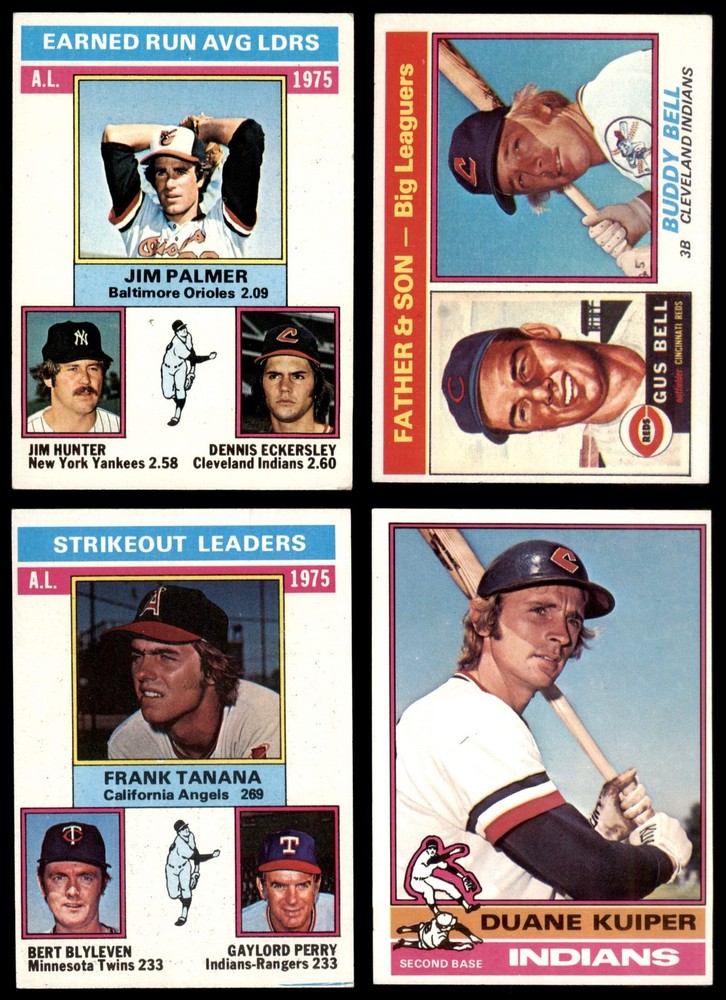 This set contains the following cards 1976 Topps #21 Dave LaRoche 3 - VG Front Back 1976 Topps #45 Boog Powell 3 - VG Front Back 1976 Topps #66 - Gus Bell / Buddy Bell Father & Son 5 - EX Front Back 1976 Topps #69 - Jim Hegan / Mike Hegan Father & Son 2 - GOOD Front Back 1976 Topps #74 Oscar Gamble 4 - VG/EX Front Back 1976 Topps #98 Dennis Eckersley 3 - VG Front Back 1976 Topps #132 Don Hood 3 - VG Front Back 1976 Topps #156 Rico Carty 4 - VG/EX Front Back 1976 Topps #178 Tom Buskey 4 - VG/EX Front Back 1976 Topps #202 - Jim Palmer / Catfish Hunter / Dennis Eckersley AL ERA Leaders 3 - VG Front Back 1976 Topps #204 - Frank Tanana / Bert Blyleven / Gaylord Perry AL Strikeout Leaders 4 - VG/EX Front Back 1976 Topps #209 Alan Ashby 4 - VG/EX Front Back 1976 Topps #232 Frank Duffy 4 - VG/EX Front Back 1976 Topps #255 Fritz Peterson 4 - VG/EX Front Back 1976 Topps #275 Rick Manning 4 - VG/EX Front Back 1976 Topps Traded #296 T Pat Dobson 3 - VG Front Back 1976 Topps #301 Jackie Brown 2 - GOOD Front Back 1976 Topps #324 Jim Bibby 4 - VG/EX Front Back 1976 Topps #358 Buddy Bell 3 - VG Front Back 1976 Topps #383 John Ellis 3 - VG Front Back 1976 Topps #408 Charlie Spikes 3 - VG Front Back 1976 Topps #433 Rick Waits 4 - VG/EX Front Back 1976 Topps #457 Ed Crosby 3 - VG Front Back 1976 Topps #477 - Frank Robinson Indians Team Checklist 3 - VG Front Back 1976 Topps #484 Eric Raich 4 - VG/EX Front Back 1976 Topps #508 Duane Kuiper 4 - VG/EX Front Back 1976 Topps #547 Roric Harrison 4 - VG/EX Front Back 1976 Topps Traded #554 T Ray Fosse 3 - VG Front Back 1976 Topps #570 George Hendrick 3 - VG Front Back 1976 Topps #618 Jack Brohamer 3 - VG Front Back 1976 Topps #646 John Lowenstein 4 - VG/EX Front Back This 1976 Topps Cleveland Indians Team Set Team Set contains Indians baseball cards and makes a great gift for any fan. ?With an inventory of over 15,000 team sets, Dean's Cards has Team Sets & Near Team Sets for just about every team, in multiple conditions, for all sports, for most major sets issued between 1909 and 1979. There is also a 1976 Team Set available from SSPC. Set breakdown by grade: Number of Cards in Set 31 Average Grade - Weighted by Value 3.31 - VG+ Average Grade - Unweighted 3.45 - VG+ Grade Breakdown 5 - EX 1 4 - VG/EX 14 3 - VG 14 2 - GOOD 2 Dean's Cards offers a 100% Money Back Satisfaction Guarantee on all purchases. Just contact us within 10 days of the purchase date and we will refund your money or, when possible, replace the cards. 1976 Topps Cleveland Indians Team Set 3.5 - VG+ 6908787 If the scan in the listing says ACTUAL IMAGE, you will receive the card pictured. For cards issued after 1983, we will often use representative images and you will not receive the exact card pictured. Shipping Policy You only pay shipping on the first item. If you order multiple items on the same order, you will only be charged once for shipping. We do not combine shipping on multiple orders. To avoid multiple shipping charges we recommend using eBay's "Add to Cart" feature to check out multiple items in one transaction, or please request and allow for us to send an invoice to reflect the combined shipping charges. Canadian customers - We send all of our Canadian/International packages with tracking and cannot make any exceptions to this policy. Negotiating Prices All prices are final and we do not negotiate. This policy is to ensure that everyone knows that they are getting our best possible price. So please do not ask us to negotiate on price. Return Policy Dean's Cards has a 100% Money Back Satisfaction Guarantee on all purchases, as long as the product is returned within 30 days of receiving the product. Card Grading Each card is first reviewed by a member of our team, in order to detect any flaws that may not be visible on a scan, such as wrinkles, creases, print spots, or light stains. The vast majority of our vintage cards are professionally graded by the Dean's Cards Grading Software and include a 100% satisfaction guarantee. Our grading is on par with PSA standards when it comes to corners, centering and flaws - and tends to grade a bit tougher than PSA, on cards with a tilted image or rough edges. This grading software was developed to provide far better grading and consistency than can be achieved using the human eye. Determining the card's grade The sharpness of the corners and the degree to which a card was cut off-center determines the maximum possible grade that the card can receive. The card's grade is further reduced by any flaws or blemishes that it may have. Each card is evaluated on the following characteristics and assigned a score. Corners - Each corner of a card is individually analyzed, and then assigned a score on how square, sharp, and flawless it appears. Centering - The borders are measured, at multiple points along the edge, to determine the horizontal and vertical centering and tilt. Defects - The card is examined for imperfections, such as: size, print flaws, dings, stains, creases, or other wear which could lower its grade. Bonus for Perfect Centering - A vintage card, with near perfect centering, is given a one-half grade bonus. So when you buy one of our cards with a half-grade (e.g. 3.5 or 6.5) it will appear perfectly centered, both vertically and horizontally. Grading Criteria Worst Corner - A card can grade only as high as the worst corner will allow. Average Corner Tilt - The difference in width of a card border near the top, compared to the bottom. OCT - The sum of how far a card is Off-Center, plus its Tilt. Minimum Centering Requirements Eye Appeal - The combination of a card's centering, corners and tilt. Well-Centered - Cards that appear perfectly centered receive a bonus of one-half grade. Flaws, defects and other imperfections - can lower a card's grade. Card Backs - the above criteria is also considered, for the back of the cards, but does not inflict as severe of a penalty to its grade. Packaging Once scanned, the cards are placed in "soft" slee
