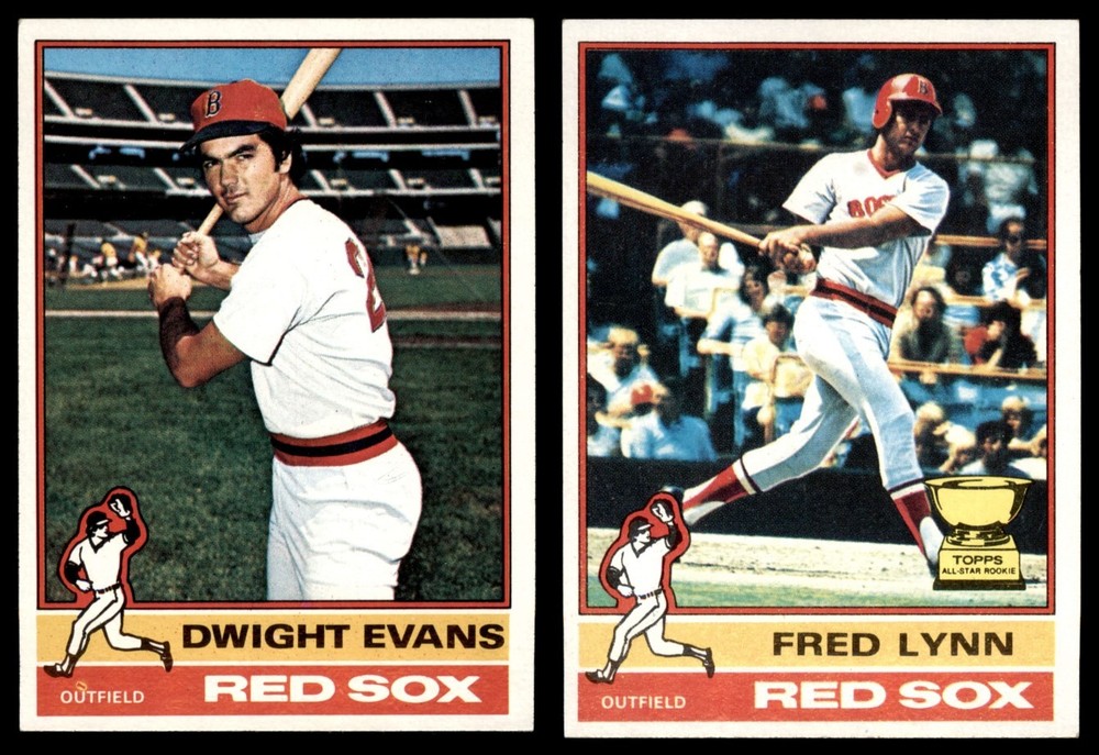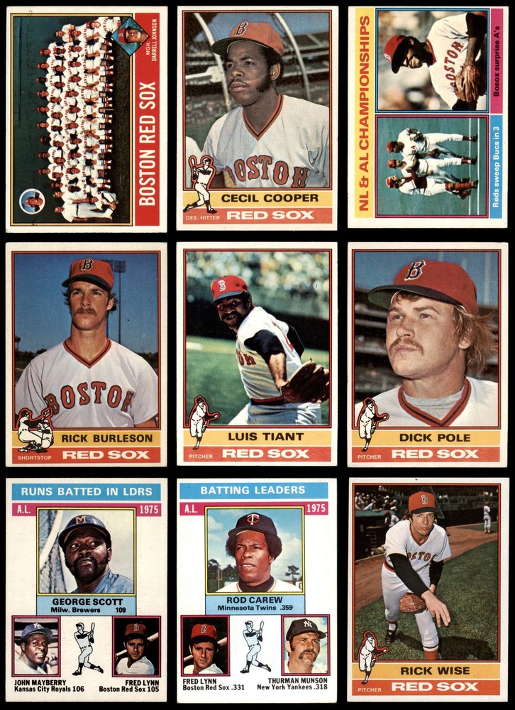 This set contains the following cards 1976 Topps #29 Rick Burleson 4 - VG/EX Front Back 1976 Topps #50 Fred Lynn 5 - EX Front Back 1976 Topps #78 Cecil Cooper 5 - EX Front Back 1976 Topps #102 Jim Willoughby 4 - VG/EX Front Back 1976 Topps #118 - Darrell Johnson Red Sox Team Checklist 4 - VG/EX Front Back 1976 Topps #130 Luis Tiant 4 - VG/EX Front Back 1976 Topps #142 Dick Drago 5 - EX Front Back 1976 Topps #170 Rick Wise 5 - EX Front Back 1976 Topps #192 - Rod Carew / Fred Lynn / Thurman Munson AL Batting Leaders 4 - VG/EX Front Back 1976 Topps #196 - George Scott / John Mayberry / Fred Lynn AL RBI Leaders 5 - EX Front Back 1976 Topps #230 Carl Yastrzemski 5 - EX Front Back 1976 Topps Traded #231 T Tom House 4 - VG/EX Front Back 1976 Topps Traded #250 T Fergie Jenkins 4 - VG/EX Front Back 1976 Topps #278 Bernie Carbo 5 - EX Front Back 1976 Topps #302 Rick Miller 4 - VG/EX Front Back 1976 Topps #326 Dick Pole 4 - VG/EX Front Back 1976 Topps #340 Jim Rice 4 - VG/EX Front Back 1976 Topps #365 Carlton Fisk 5 - EX Front Back 1976 Topps #381 Denny Doyle 3 - VG Front Back 1976 Topps #396 Bill Lee 5 - EX Front Back 1976 Topps #419 Reggie Cleveland 2 - GOOD Front Back 1976 Topps #445 Rico Petrocelli 4 - VG/EX Front Back 1976 Topps #461 Luis Tiant NL & AL Championships 4 - VG/EX Front Back 1976 Topps #471 Jim Burton 4 - VG/EX Front Back 1976 Topps #523 Bob Montgomery 4 - VG/EX Front Back 1976 Topps #529 Deron Johnson 5 - EX Front Back 1976 Topps #575 Dwight Evans 5 - EX Front Back 1976 Topps #632 Rogelio Moret 4 - VG/EX Front Back 1976 Topps #654 Doug Griffin 5 - EX Front Back This 1976 Topps Boston Red Sox Team Set Team Set contains Red Sox baseball cards and makes a great gift for any fan. ?With an inventory of over 15,000 team sets, Dean's Cards has Team Sets & Near Team Sets for just about every team, in multiple conditions, for all sports, for most major sets issued between 1909 and 1979. There is also a 1976 Team Set available from SSPC. Set breakdown by grade: Number of Cards in Set 29 Average Grade - Weighted by Value 4.54 - VG/EX+ Average Grade - Unweighted 4.31 - VG/EX+ Grade Breakdown 5 - EX 12 4 - VG/EX 15 3 - VG 1 2 - GOOD 1 "The following cards are omitted, in order to keep the cost of the set reasonable: "#347 All-Time All-Stars - Ted Williams, #462 1975 World Series - Reds Champs, #594 Rookie Catchers and Outfielders - Andy Merchant / Ed Ott / Royle Stillman / Jerry White and #597 Rookie Pitchers - Don Aase / Jack Kucek / Frank LaCorte / Mike Pazik Dean's Cards offers a 100% Money Back Satisfaction Guarantee on all purchases. Just contact us within 10 days of the purchase date and we will refund your money or, when possible, replace the cards. 1976 Topps Boston Red Sox Team Set 4.5 - VG/EX+ 6908782 If the scan in the listing says ACTUAL IMAGE, you will receive the card pictured. For cards issued after 1983, we will often use representative images and you will not receive the exact card pictured. Shipping Policy You only pay shipping on the first item. If you order multiple items on the same order, you will only be charged once for shipping. We do not combine shipping on multiple orders. To avoid multiple shipping charges we recommend using eBay's "Add to Cart" feature to check out multiple items in one transaction, or please request and allow for us to send an invoice to reflect the combined shipping charges. Canadian customers - We send all of our Canadian/International packages with tracking and cannot make any exceptions to this policy. Negotiating Prices All prices are final and we do not negotiate. This policy is to ensure that everyone knows that they are getting our best possible price. So please do not ask us to negotiate on price. Return Policy Dean's Cards has a 100% Money Back Satisfaction Guarantee on all purchases, as long as the product is returned within 30 days of receiving the product. Card Grading Each card is first reviewed by a member of our team, in order to detect any flaws that may not be visible on a scan, such as wrinkles, creases, print spots, or light stains. The vast majority of our vintage cards are professionally graded by the Dean's Cards Grading Software and include a 100% satisfaction guarantee. Our grading is on par with PSA standards when it comes to corners, centering and flaws - and tends to grade a bit tougher than PSA, on cards with a tilted image or rough edges. This grading software was developed to provide far better grading and consistency than can be achieved using the human eye. Determining the card's grade The sharpness of the corners and the degree to which a card was cut off-center determines the maximum possible grade that the card can receive. The card's grade is further reduced by any flaws or blemishes that it may have. Each card is evaluated on the following characteristics and assigned a score. Corners - Each corner of a card is individually analyzed, and then assigned a score on how square, sharp, and flawless it appears. Centering - The borders are measured, at multiple points along the edge, to determine the horizontal and vertical centering and tilt. Defects - The card is examined for imperfections, such as: size, print flaws, dings, stains, creases, or other wear which could lower its grade. Bonus for Perfect Centering - A vintage card, with near perfect centering, is given a one-half grade bonus. So when you buy one of our cards with a half-grade (e.g. 3.5 or 6.5) it will appear perfectly centered, both vertically and horizontally. Grading Criteria Worst Corner - A card can grade only as high as the worst corner will allow. Average Corner Tilt - The difference in width of a card border near the top, compared to the bottom. OCT - The sum of how far a card is Off-Center, plus its Tilt. Minimum Centering Requirements Eye Appeal - The combination of a card's centering, corners and tilt. Well-Centered - Cards that appear perfectly centered receive a bonus of one-half grade. Flaws, defects and other imperfections - can lower a 