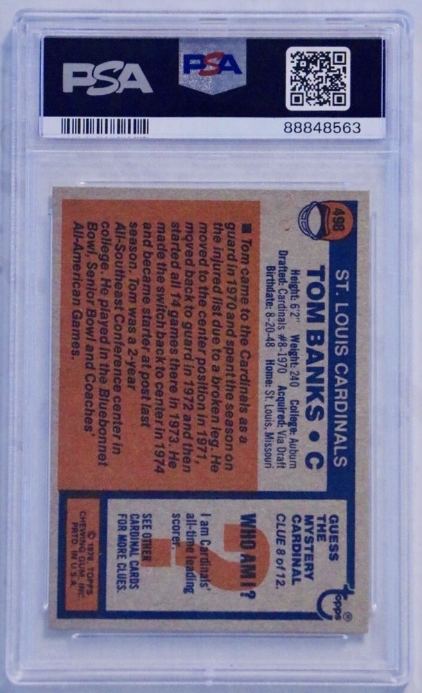 Sport:FootballFeatures:Rookie, Base SetManufacturer:ToppsSeason:1976brand:ToppsSeries:ToppsCard Number:498Player/Athlete:Tom BanksLeague:National Football League (NFL)Team:St. Louis CardinalsSet:1976 ToppsParallel/Variety:[Base]