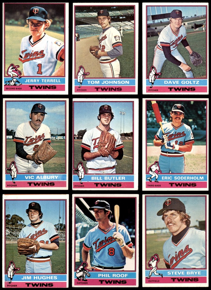 This set contains the following cards 1976 Topps #11 Jim Hughes 2 - GOOD Front Back 1976 Topps #35 Tony Oliva 4 - VG/EX Front Back 1976 Topps #59 Larry Hisle 2 - GOOD Front Back 1976 Topps #87 Tom Burgmeier 4 - VG/EX Front Back 1976 Topps #111 Danny Thompson 4 - VG/EX Front Back 1976 Topps #136 Dave Goltz 4 - VG/EX Front Back 1976 Topps #159 Jerry Terrell 4 - VG/EX Front Back 1976 Topps #183 Steve Braun 4 - VG/EX Front Back 1976 Topps #192 - Rod Carew / Fred Lynn / Thurman Munson AL Batting Leaders 3 - VG Front Back 1976 Topps #204 - Frank Tanana / Bert Blyleven / Gaylord Perry AL Strikeout Leaders 4 - VG/EX Front Back 1976 Topps #214 Eric Soderholm 4 - VG/EX Front Back 1976 Topps #235 Bert Blyleven 4 - VG/EX Front Back 1976 Topps #263 Lyman Bostock 3 - VG Front Back 1976 Topps #288 Bill Campbell 3 - VG Front Back 1976 Topps #313 Dan Ford 3 - VG Front Back 1976 Topps #336 Vic Albury 4 - VG/EX Front Back 1976 Topps #373 Johnny Briggs 4 - VG/EX Front Back 1976 Topps #400 Rod Carew 3 - VG Front Back 1976 Topps #424 Phil Roof 3 - VG Front Back 1976 Topps #448 Tom Johnson 4 - VG/EX Front Back 1976 Topps #474 Ray Corbin 4 - VG/EX Front Back 1976 Topps #498 Glenn Borgmann 3 - VG Front Back 1976 Topps #519 Steve Brye 4 - VG/EX Front Back 1976 Topps #556 - Gene Mauch Twins Team Checklist 1.5 - FAIR Front Back 1976 Topps #592 - Willlie Randolph / Jerry Royster / Dave McKay / Roy Staiger Rookie Infielders 3 - VG Front Back 1976 Topps #597 - Don Aase / Jack Kucek / Frank LaCorte / Mike Pazik Rookie Pitchers 4 - VG/EX Front Back 1976 Topps #619 Bill Butler 3 - VG Front Back 1976 Topps #636 Joe Decker 4 - VG/EX Front Back This 1976 Topps Minnesota Twins Team Set Team Set contains Twins baseball cards and makes a great gift for any fan. ?With an inventory of over 15,000 team sets, Dean's Cards has Team Sets & Near Team Sets for just about every team, in multiple conditions, for all sports, for most major sets issued between 1909 and 1979. There is also a 1976 Team Set available from SSPC. Set breakdown by grade: Number of Cards in Set 28 Average Grade - Weighted by Value 3.37 - VG+ Average Grade - Unweighted 3.45 - VG+ Grade Breakdown 4 - VG/EX 16 3 - VG 9 2 - GOOD 2 1.5 - FAIR 1 The following card is omitted, in order to keep the cost of the set reasonable. It can be purchased separately: Dean's Cards offers a 100% Money Back Satisfaction Guarantee on all purchases. Just contact us within 10 days of the purchase date and we will refund your money or, when possible, replace the cards. 1976 Topps Minnesota Twins Team Set 3.5 - VG+ 6908788 If the scan in the listing says ACTUAL IMAGE, you will receive the card pictured. For cards issued after 1983, we will often use representative images and you will not receive the exact card pictured. Shipping Policy You only pay shipping on the first item. If you order multiple items on the same order, you will only be charged once for shipping. We do not combine shipping on multiple orders. To avoid multiple shipping charges we recommend using eBay's "Add to Cart" feature to check out multiple items in one transaction, or please request and allow for us to send an invoice to reflect the combined shipping charges. Canadian customers - We send all of our Canadian/International packages with tracking and cannot make any exceptions to this policy. Negotiating Prices All prices are final and we do not negotiate. This policy is to ensure that everyone knows that they are getting our best possible price. So please do not ask us to negotiate on price. Return Policy Dean's Cards has a 100% Money Back Satisfaction Guarantee on all purchases, as long as the product is returned within 30 days of receiving the product. Card Grading Each card is first reviewed by a member of our team, in order to detect any flaws that may not be visible on a scan, such as wrinkles, creases, print spots, or light stains. The vast majority of our vintage cards are professionally graded by the Dean's Cards Grading Software and include a 100% satisfaction guarantee. Our grading is on par with PSA standards when it comes to corners, centering and flaws - and tends to grade a bit tougher than PSA, on cards with a tilted image or rough edges. This grading software was developed to provide far better grading and consistency than can be achieved using the human eye. Determining the card's grade The sharpness of the corners and the degree to which a card was cut off-center determines the maximum possible grade that the card can receive. The card's grade is further reduced by any flaws or blemishes that it may have. Each card is evaluated on the following characteristics and assigned a score. Corners - Each corner of a card is individually analyzed, and then assigned a score on how square, sharp, and flawless it appears. Centering - The borders are measured, at multiple points along the edge, to determine the horizontal and vertical centering and tilt. Defects - The card is examined for imperfections, such as: size, print flaws, dings, stains, creases, or other wear which could lower its grade. Bonus for Perfect Centering - A vintage card, with near perfect centering, is given a one-half grade bonus. So when you buy one of our cards with a half-grade (e.g. 3.5 or 6.5) it will appear perfectly centered, both vertically and horizontally. Grading Criteria Worst Corner - A card can grade only as high as the worst corner will allow. Average Corner Tilt - The difference in width of a card border near the top, compared to the bottom. OCT - The sum of how far a card is Off-Center, plus its Tilt. Minimum Centering Requirements Eye Appeal - The combination of a card's centering, corners and tilt. Well-Centered - Cards that appear perfectly centered receive a bonus of one-half grade. Flaws, defects and other imperfections - can lower a card's grade. Card Backs - the above criteria is also considered, for the back of the cards, but does not inflict as severe of a penalty to its grade. Packaging Once scanned, the cards a