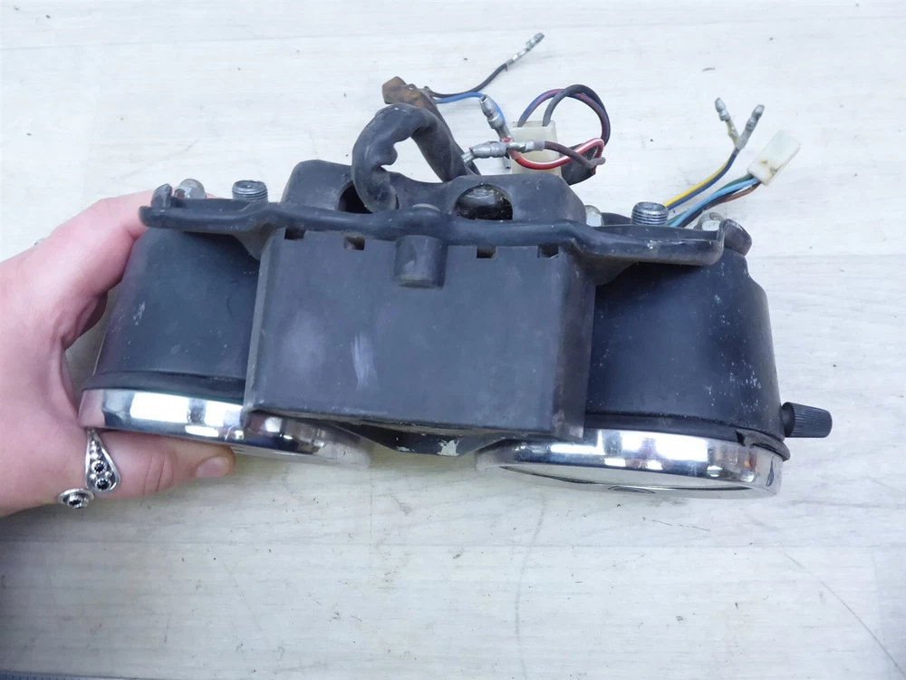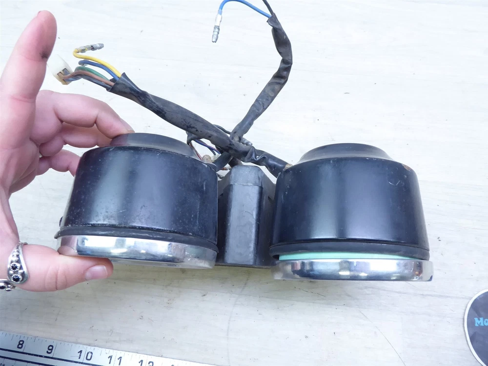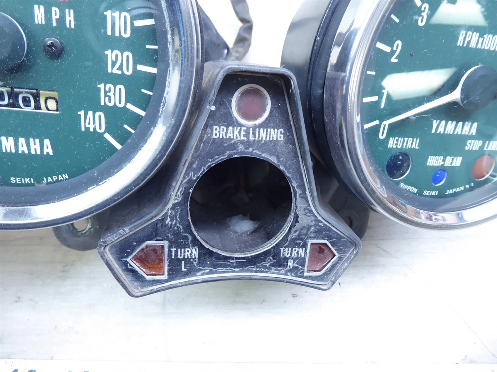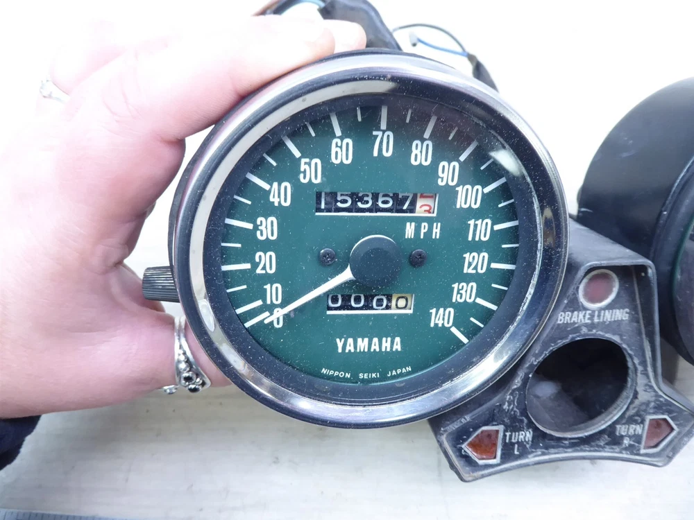 FOR SALE: gauge cluster ORIGIN: 1976 Yamaha XS650 with 15,367 miles. May fit other years and models, contact your local dealer to confirm fitment. CONDITION/DESCRIPTION: the gauges were tested and the speedo gauge is in working condition but the tach gauge moves slow making the assembly for parts or repair, the reset knob spins well and moves the odometer, we are unable to test the light panel so the working condition is unknown, the dial faces have some light fading but are still clean and readable, the glass has no cracks or holes, the cable fitting threads are not stripped but may have some light stress from use, the mounts look good, the wire ends and connectors are in good shape, the panel appears to have no bends or warping, the backs have no dents but some small dings may be present, the assembly has some scratches light rust and wear from use, please see the pictures for additional details. MRC INVENTORY NUMBER: Y393-1 OUR PROMISE 1. Our parts are QUALITY USED PARTS and we are a LICENSED motorcycle salvage dealer by the state of Wisconsin. 2. Any major flaws in any parts are DISCLOSED to YOU, to the best of our ability. 3. We try our best to give YOU a smooth and easy transaction. 4. We ship PROMPTLY - so YOU don't have to wait - normal delivery occurs 1 to 7 business days to anywhere the continental US. SHIPPING • Shipment will be processed 1 business day after payment is received. • International- please contact us for a quote • We will combine shipping • Please ensure your address is correct in PayPal before purchasing your item RETURNS If not satisfied, we will accept a return and offer a 100% refund FEEDBACK Please contact us to resolve a problem before leaving negative feedback. All issues can be worked out. SEARCH STORE Parts being sold are taken from used motorcycles that were not totaled or subjected to water damage. Please check our store for any other items you may want, all of our items for sale are listed on eBay. eBay STORE CONTACT Powered by SixBit's eCommerce Solution