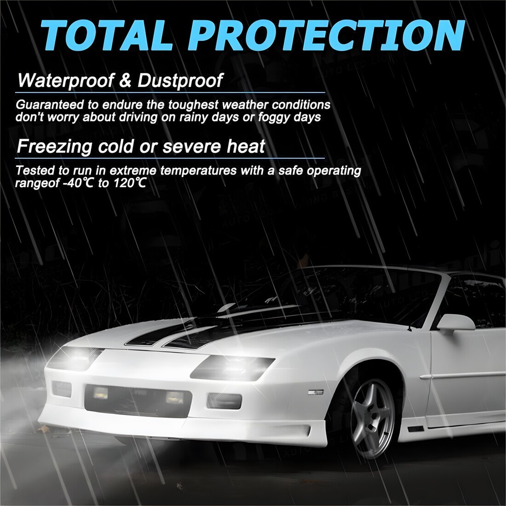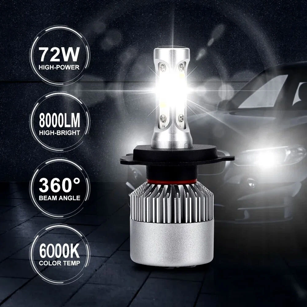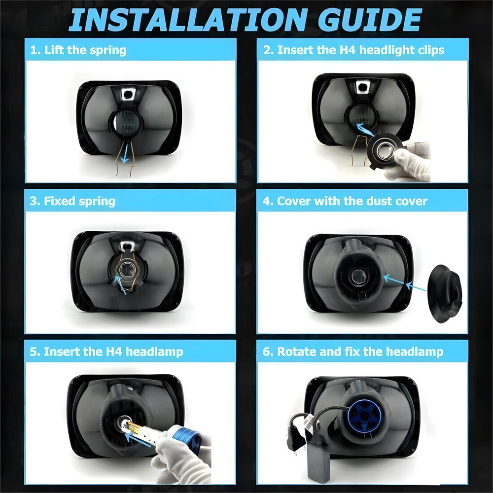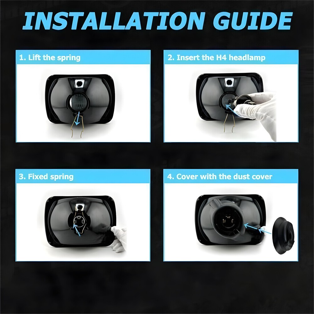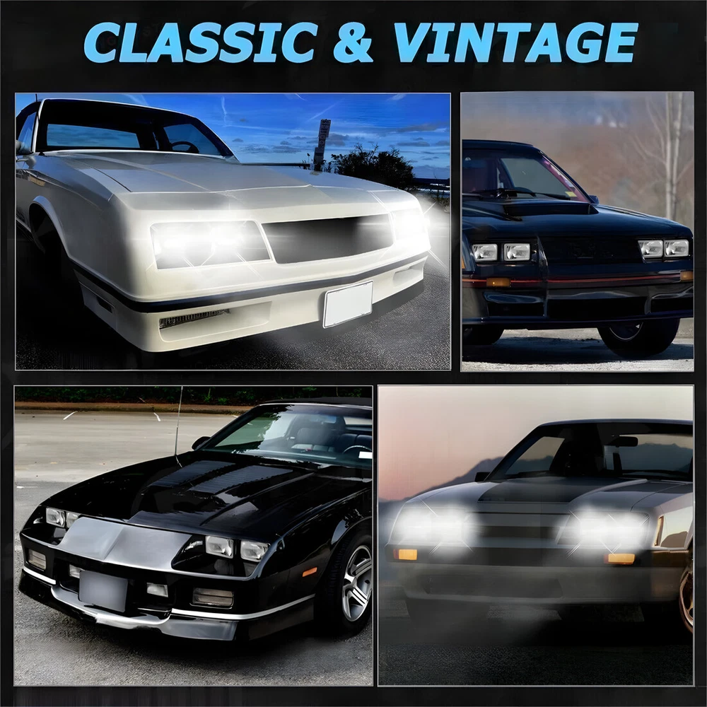 4"x6" Stock Style H4 Headlights w/ LED Bulbs - Set of 4 THESE ARE H4 CONVERSION HEADLIGHTS WITH A STOCK STYLE GLASS LENS AND METAL HOUSING! INCLUDES (4) HIGH INTENSITY LED H4 WHITE LIGHT BULBS! 4X6 INCH SQUARE HEADLIGHT - SET OF 4 Made from real glass and not cheap plastic Come with a H4 plug In-stock STOCK STYLE GLASS LENS / METAL BACKSIDE FITS STOCK BUCKETS,( Some models may require minor modifications) LOW BEAM AND HIGH BEAM BRIGHTER AND WHITER THAN STOCK LIGHTS BULBS ARE REMOVABLE AND REPLACEABLE INCLUDES 6000k WHITE LED LIGHT BULBS LOW AND HIGH BEAM FUNCTION PLUGS INTO FACTORY WIRING PLUGS DOT / SAE APPROVED THIS LISTING IS FOR A NEW SET OF 4 - 4x6" STOCK STYLE GLASS LENS / METAL BACKSIDE H4 CONVERSION HEADLIGHTS WITH WHITE LED LIGHT BULBS. THIS SET INCLUDES 2 HIGH BEAM & 2 HIGH / LOW BEAM HEADLIGHTS. THESE HAVE THE ORIGINAL SHAPED PRONGS ON THE BACK SO THEY WILL PLUG RIGHT INTO YOUR ORIGINAL WIRING HARNESS PLUGS. THESE ARE BRIGHTER AND WHITER THAN THE STOCK STYLE INCANDESCENT SEALED BEAM HEADLIGHTS. IN RARE CIRCUMSTANCES, WIRING MODIFICATION MAY BE REQUIRED. THESE ARE FOR ANY CAR OR TRUCK THAT HAS 4 SQUARE 4x6" HEADLIGHTS. DOT / SAE APPROVED. FEATURES: Bulb Size: 9003 / H4 / HB2 Application: Headlight High Beam And Low Beam LED replacement bulbs are engineered for superior performance, exceptional looks, and increased safety. 3570 CSP LED chip high power 100W per bulb Color Temperature: 6000K- White Lumens: 6000 lumens per bulb,no blind zone Working Voltage: DC 12V to 24V No delay to light up, Faster on/off response time Lifespan: 50,000 working hours, stable quality, long service life Aluminum heat sink design,built-in automotive circuit to prevent electronic interference. The model is the same as factory light, no need to change car wire rute,just Plug and Play, NO modification required Energy saving, environmental protection, Stable performance, through strict test, Use safer driving in the car
