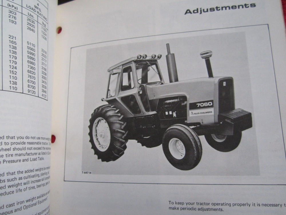 THIS IS A 1977 ALLIS CHALMERS MODEL 7060 DIESEL TRACTOR OPERATORS MANUAL. SOME COVER WEAR OTHERWISE IT IS IN VERY GOOD PLUS CONDITION . BUYER PAYS S.H. ( AR# 6 )