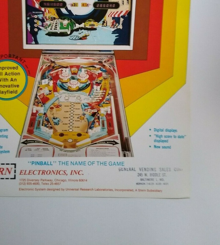 Stern Pinball FLYER 1977 Original Flipper Game Artwork Sheet Solid State Version Original paper promo sales flyer. Single page one sided artwork sheet. Has dealer stamp and light wrinkles. See photos. This is the flyer for the 1st Stern pinball machine produced! Flyers are paper promotional advertising sheets made for coin operated amusement arcade games. Also called a circular, brochure, pamphlet, or flier. All are single sheets unless noted otherwise. If there is artwork on the back side it will be shown. Size is 8.5" X 11". Perfect for framing. Makes great wall art for the man cave or a unique gift idea. Sheet protector included with each flyer sold. Orders are shipped with care. More pinball, jukebox, slot machine, and arcade game items for sale in our store. SHIPPING Bundle and save by using cart and making single payment. International buyers are responsible for any import fees/taxes. ABOUT US Seller of vintage collectibles, gifts, advertising, artwork, original pinball flyers, vinyl records, video arcade flyers, pinball machine translites, game manuals, score cards, magazines, antique Halloween and holiday postcards, Christmas items, super hero memorabilia, horror themed art.