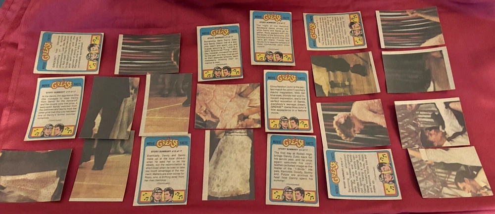 The product is a set of 1978 Topps Grease Movie Trading Cards featuring characters and scenes from the popular movie "Grease." This lot includes 22 cards from Series 2 in a green parallel/variety, with notable cast members such as John Travolta, Olivia Newton John, Stockard Channing, and more. These non-sport trading cards are made of card stock and are considered a first edition collectible item, ideal for fans of the music and romance genres depicted in the film. Each card is in standard size and offers a nostalgic look back at the iconic movie. Card#'s 132,131,130,129,128,127,126,125,124,122,121,120,119,117,115,114,113,112,111,110,109, and 108.