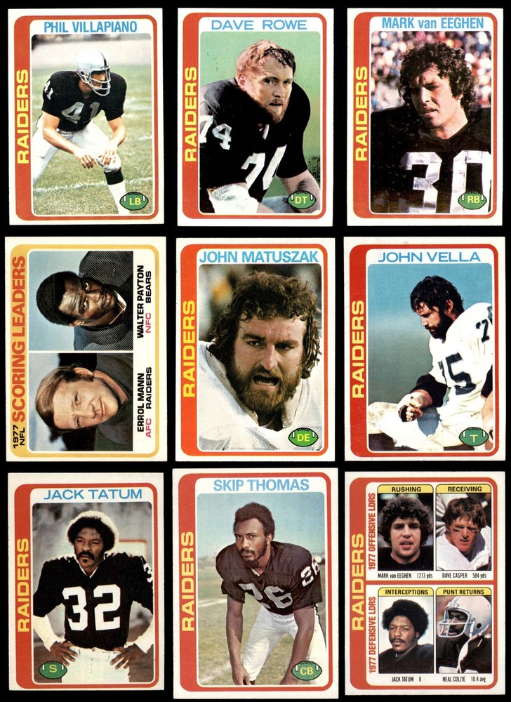 This set contains the following cards 1978 Topps #8 Skip Thomas 7 - NM Front Back 1978 Topps #28 Jack Tatum 5 - EX Front Back 1978 Topps #50 Dave Casper 7 - NM Front Back 1978 Topps #68 Ted Hendricks 6 - EX/MT Front Back 1978 Topps #90 Gene Upshaw 5 - EX Front Back 1978 Topps #108 Clarence Davis 6 - EX/MT Front Back 1978 Topps #128 Dave Dalby 6 - EX/MT Front Back 1978 Topps #149 Phil Villapiano 6 - EX/MT Front Back 1978 Topps #167 AFC Championship 6 - EX/MT Front Back 1978 Topps #169 Neal Colzie 5 - EX Front Back 1978 Topps #189 Otis Sistrunk 5 - EX Front Back 1978 Topps #210 Errol Mann 7 - NM Front Back 1978 Topps #235 Mark Van Eeghen 5 - EX Front Back 1978 Topps #260 Ray Guy 7 - NM Front Back 1978 Topps #282 Monte Johnson 5 - EX Front Back 1978 Topps #305 Cliff Branch 7 - NM Front Back 1978 Topps #326 John Vella 7 - NM Front Back 1978 Topps #333 - Walter Payton / Mark van Eeghen Rushing Leaders PSA 8 - NM/MT Front Back 1978 Topps #334 - Walter Payton / Errol Mann Scoring Leaders 7 - NM Front Back 1978 Topps #336 - Ray Guy / Tom Blanchard Punting Leaders 6 - EX/MT Front Back 1978 Topps #345 Willie Hall 5 - EX Front Back 1978 Topps #365 Ken Stabler 7 - NM Front Back 1978 Topps #392 George Buehler 6 - EX/MT Front Back 1978 Topps #415 Fred Biletnikoff 6 - EX/MT Front Back 1978 Topps #439 John Matuszak 6 - EX/MT Front Back 1978 Topps #460 Art Shell 5 - EX Front Back 1978 Topps #481 Dave Rowe 6 - EX/MT Front Back 1978 Topps #520 - Mark van Eeghen / Dave Casper / Jack tatum / Neal Colzie Raiders Leaders & Checklist 7 - NM Front Back This 1978 Topps Oakland Raiders Team Set contains the 1978 Topps Raiders football cards and makes a great gift for any Raiders fan. ?With an inventory of over 15,000 team sets, Dean's Cards has Team Sets & Near Team Sets for just about every team, in multiple conditions, for all sports, for most major sets issued between 1909 and 1979.