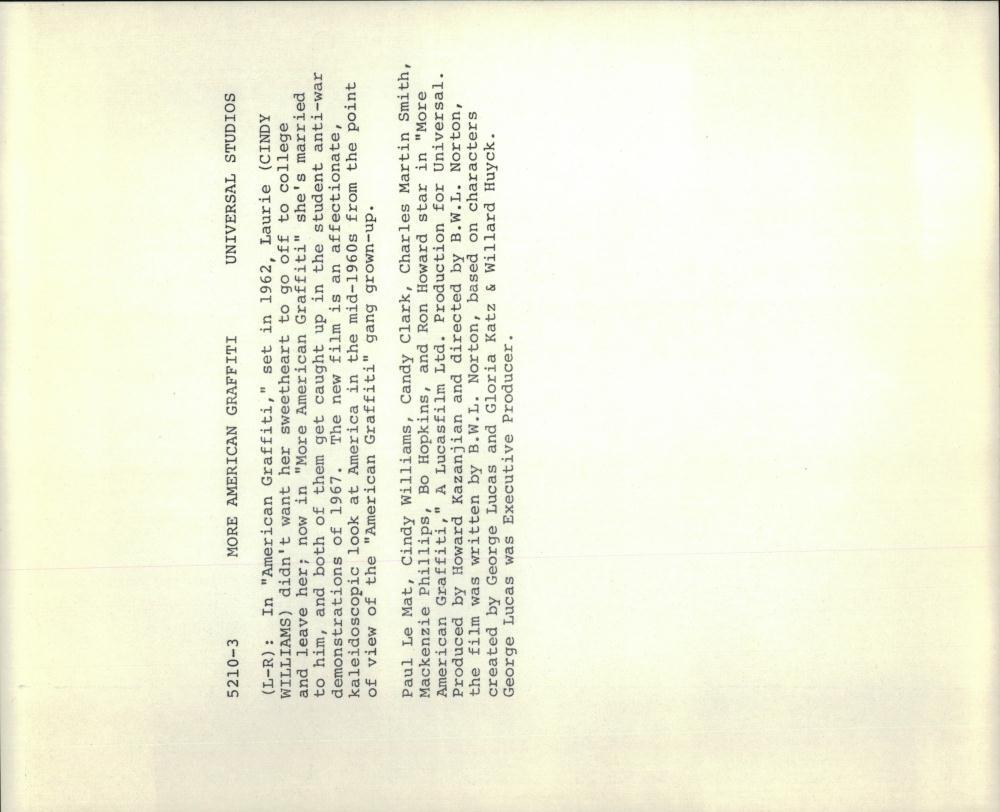ebay template Note: Please study the images carefully to determine the condition of this vintage photograph, as it may not be in perfect condition. It may contain wrinkles, cracks, and possibly even tears due to its age and how it was handled before it got to us. A scanner may interpret colors and contrast differently than human eyes will, so it is possible that the actual photograph may be slightly darker or lighter in person. This vintage photograph is offered for sale as a collectible item and conveys no transfer of copyright. 1979 Press Photo Cindy Williams in "American Graffiti" - DFPG39307 This is an original press photo. Photo measures 10 x 8inches. Photo is dated --1979. PHOTO FRONT PHOTO BACK Historic Images Part Number: DFPG39307 Sell Smarter with Kyozou. Inventory and Ecommerce Management