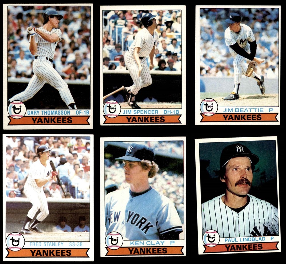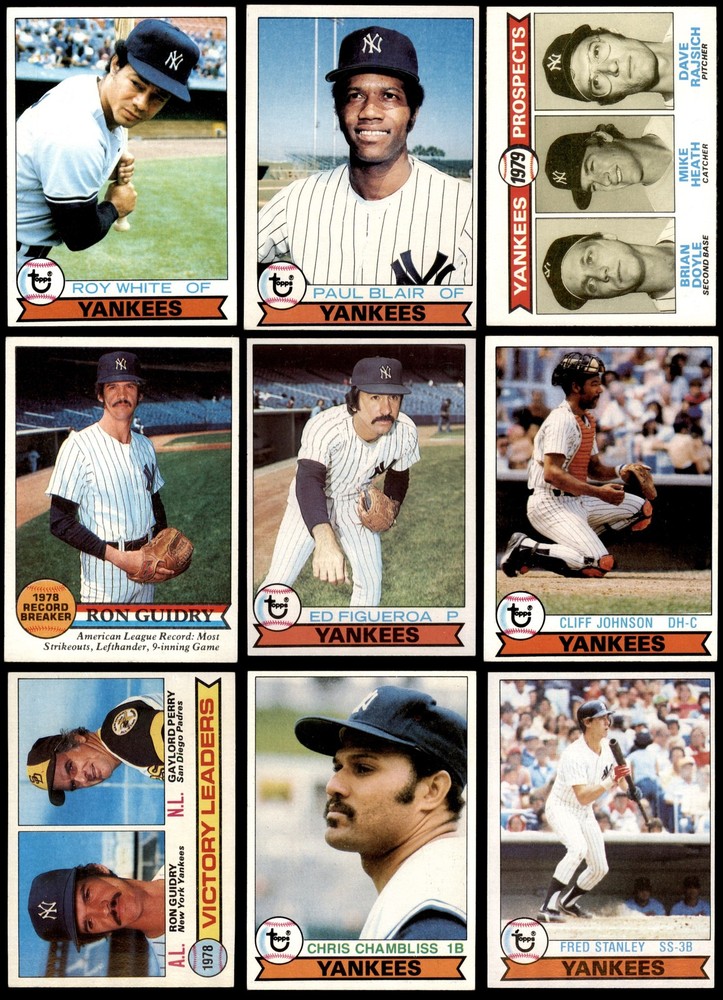 This set contains the following cards 1979 Topps #5 - Ron Guidry / Gaylord Perry Victory Leaders 5 - EX Front Back 1979 Topps #8 - Rollie Fingers / Goose Gossage Leading Firemen 6 - EX/MT Front Back 1979 Topps #16 Fred Stanley 6 - EX/MT Front Back 1979 Topps #35 Ed Figueroa 6 - EX/MT Front Back 1979 Topps #114 Cliff Johnson 6 - EX/MT Front Back 1979 Topps #159 Roy White 6 - EX/MT Front Back 1979 Topps #179 Jim Beattie 5 - EX Front Back 1979 Topps #202 - Ron Guidry Record Breaker 5 - EX Front Back 1979 Topps #335 Chris Chambliss 6 - EX/MT Front Back 1979 Topps #387 Gary Thomasson 5 - EX Front Back 1979 Topps #434 Ken Clay 5 - EX Front Back 1979 Topps #500 Ron Guidry 4 - VG/EX Front Back 1979 Topps #582 Paul Blair 5 - EX Front Back 1979 Topps #599 Jim Spencer 4 - VG/EX Front Back 1979 Topps #626 - Bob Lemon Yankees Team Checklist 6 - EX/MT Front Back 1979 Topps #634 Paul Lindblad 4 - VG/EX Front Back 1979 Topps #670 Catfish Hunter 4 - VG/EX Front Back 1979 Topps #700 Reggie Jackson 5 - EX Front Back 1979 Topps #710 - Brian Doyle / Mike Heath / Dave Rajsich Yankees Prospects 6 - EX/MT Front Back This is a 1979 Topps New York Yankees Near Team Set. Dean's Cards has designed our Near Complete Team Sets using the majority of cards for that team - leaving out the expensive super-star rookie cards, high numbers, short-prints, and multi-player rookie cards, reducing the price. the other cards can then be added, from our inventory of over a million cards, as your budget allows. For the exact cards contained in this set, as well as their front and back scans, please see the description below. Set breakdown by grade: Number of Cards in Set 19 Average Grade - Weighted by Value 5.52 - EX+ Average Grade - Unweighted 5.21 - EX Grade Breakdown 6 - EX/MT 8 5 - EX 7 4 - VG/EX 4 . This near team set contains 19 cards out of the possible 32 cards. This is not a complete set. This set does not include the following cards: #7 ERA Leaders - Ron Guidry / Craig Swan, #60 Mickey Rivers, #89 Dick Tidrow, #140 Don Gullett, #225 Goose Gossage, #250 Willie Randolph, #278 Andy Messersmith, #310 Thurman Munson, #365 Sparky Lyle, #460 Graig Nettles, #485 Bucky Dent, #558 Jay Johnstone, #648 Lou Piniella Dean's Cards offers a 100% Money Back Satisfaction Guarantee on all purchases. Just contact us within 10 days of the purchase date and we will refund your money or, when possible, replace the cards. 1979 Topps New York Yankees Near Team Set 5.5 - EX+ 6902158 (19 / 32 cards) If the scan in the listing says ACTUAL IMAGE, you will receive the card pictured. For cards issued after 1983, we will often use representative images and you will not receive the exact card pictured. Shipping Policy You only pay shipping on the first item. If you order multiple items on the same order, you will only be charged once for shipping. We do not combine shipping on multiple orders. To avoid multiple shipping charges we recommend using eBay's "Add to Cart" feature to check out multiple items in one transaction, or please request and allow for us to send an invoice to reflect the combined shipping charges. Canadian customers - We send all of our Canadian/International packages with tracking and cannot make any exceptions to this policy. Negotiating Prices All prices are final and we do not negotiate. This policy is to ensure that everyone knows that they are getting our best possible price. So please do not ask us to negotiate on price. Return Policy Dean's Cards has a 100% Money Back Satisfaction Guarantee on all purchases, as long as the product is returned within 30 days of receiving the product. Card Grading Each card is first reviewed by a member of our team, in order to detect any flaws that may not be visible on a scan, such as wrinkles, creases, print spots, or light stains. The vast majority of our vintage cards are professionally graded by the Dean's Cards Grading Software and include a 100% satisfaction guarantee. Our grading is on par with PSA standards when it comes to corners, centering and flaws - and tends to grade a bit tougher than PSA, on cards with a tilted image or rough edges. This grading software was developed to provide far better grading and consistency than can be achieved using the human eye. Determining the card's grade The sharpness of the corners and the degree to which a card was cut off-center determines the maximum possible grade that the card can receive. The card's grade is further reduced by any flaws or blemishes that it may have. Each card is evaluated on the following characteristics and assigned a score. Corners - Each corner of a card is individually analyzed, and then assigned a score on how square, sharp, and flawless it appears. Centering - The borders are measured, at multiple points along the edge, to determine the horizontal and vertical centering and tilt. Defects - The card is examined for imperfections, such as: size, print flaws, dings, stains, creases, or other wear which could lower its grade. Bonus for Perfect Centering - A vintage card, with near perfect centering, is given a one-half grade bonus. So when you buy one of our cards with a half-grade (e.g. 3.5 or 6.5) it will appear perfectly centered, both vertically and horizontally. Grading Criteria Worst Corner - A card can grade only as high as the worst corner will allow. Average Corner Tilt - The difference in width of a card border near the top, compared to the bottom. OCT - The sum of how far a card is Off-Center, plus its Tilt. Minimum Centering Requirements Eye Appeal - The combination of a card's centering, corners and tilt. Well-Centered - Cards that appear perfectly centered receive a bonus of one-half grade. Flaws, defects and other imperfections - can lower a card's grade. Card Backs - the above criteria is also considered, for the back of the cards, but does not inflict as severe of a penalty to its grade. Packaging Once scanned, the cards are placed in "soft" sleeves, which have an open top for easy removal. The Dean's Card