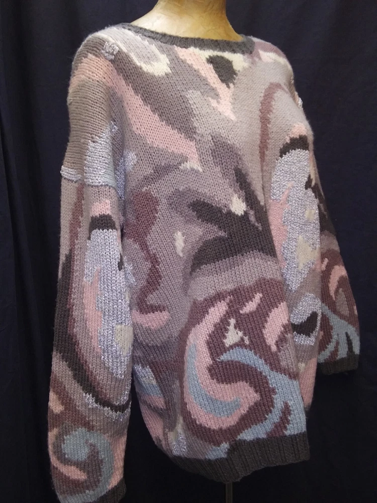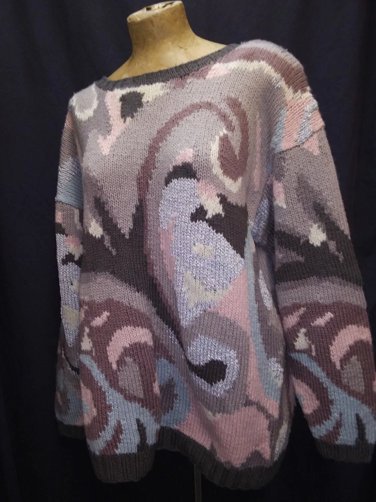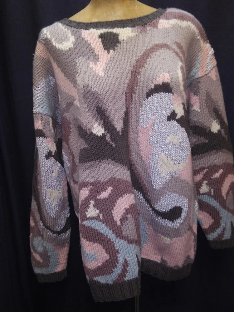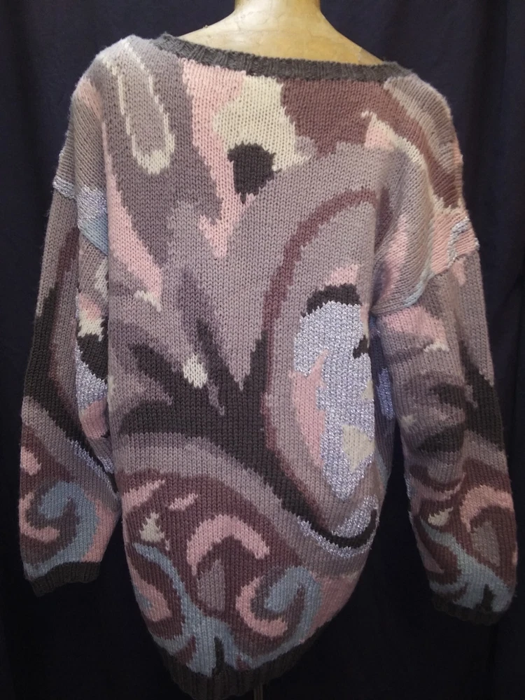 This is an adorable vintage 1980's oversize sweater by Carole Little. Browns, cream white, pink, blue and silver. Shoulder pads. Nice condition size large. bust about 44 inches. shoulder to hem 27 inches. please contact me if you have any questions.