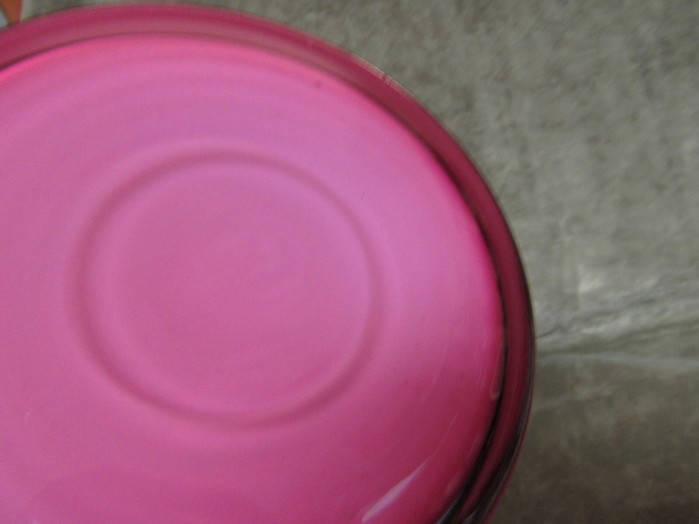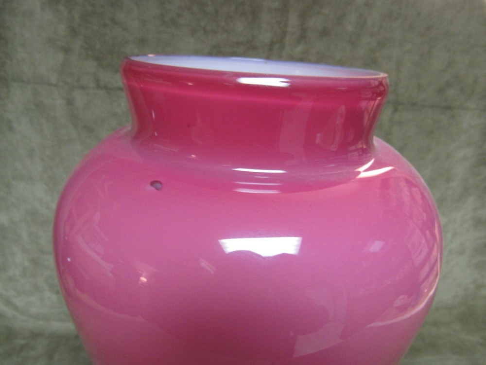This vase has NO MARKING, it cased white on the inside, pink and then clear on the outside. Made by Fenton in 1983, it is a factory second that has an air bubble at the shoulder, see photos, can be felt as open on the inside. This was the mold blown piece and has a polished/ground top edge. This measures 7" at the widest and is 11-1/4" tall. Good condition, no damage or issues-just the bubble at the shoulder.