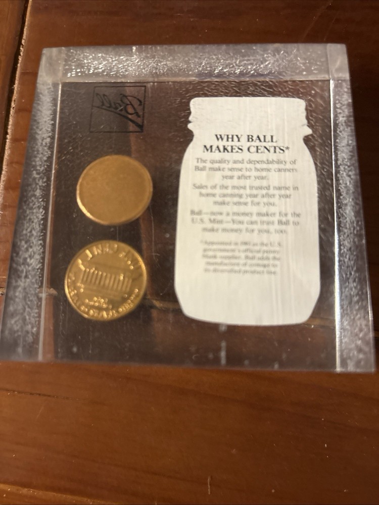 The product is a 1982 D Penny and Planchet Ball Jar Promotional Paperweight made of clear acrylic material. This unique item features a transparent ball jar filled with pennies and planchets, making it a decorative and collectible piece. The brand associated with this item is Ball, adding to its appeal for collectors of vintage and promotional items.