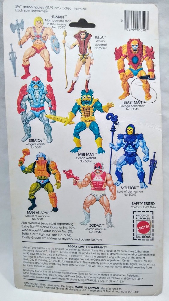 UPC:Does not applyBrand:Mattelgtin13:Does not applyYear Manufactured:1982Year:1982Era:1980-2001Packaging:Original (Opened)Franchise:Masters of the UniverseSeller Notes:“Card back is torn where bubble and price sticker were removed.”TV Show:He ManCharacter Family:Masters of the UniverseTime Period Manufactured:1980-1989Character:TeelaVintage:YesType:Action FigureTheme:TV, Movie & Video Games