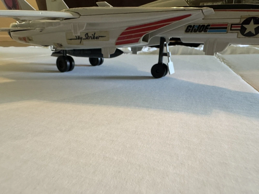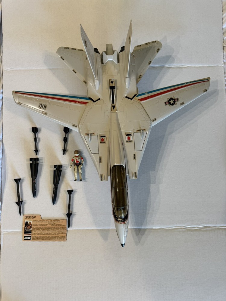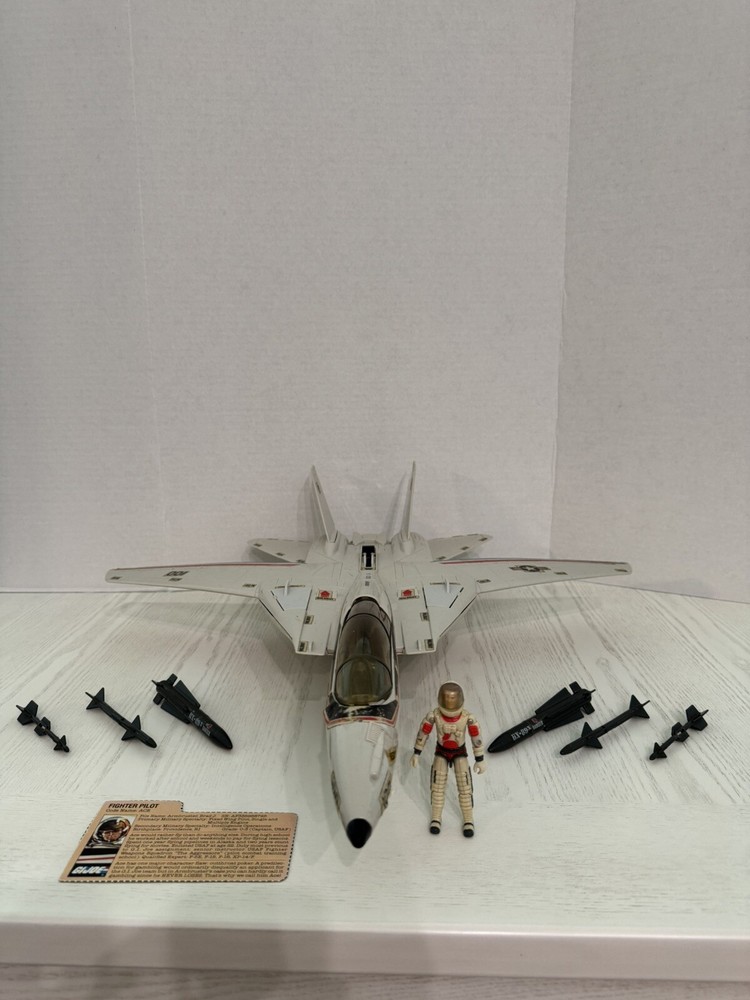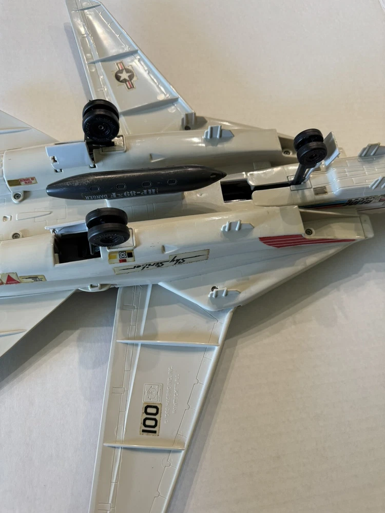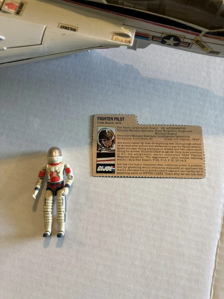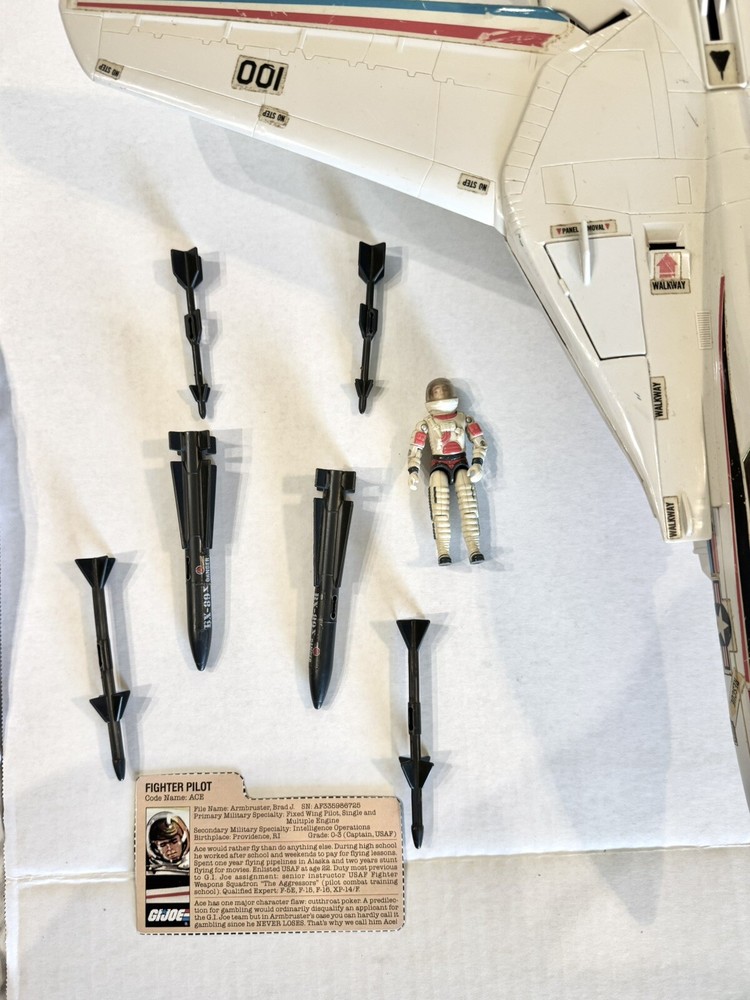 The GI Joe Combat Jet Skystriker (XP-14F) with Ace from 1983 is a vintage action figure toy manufactured by Hasbro. Ace is in nice condition complete with helmet and includes the card. The Skystriker Jet has missing parts and is not complete and has some wear in the stickers.