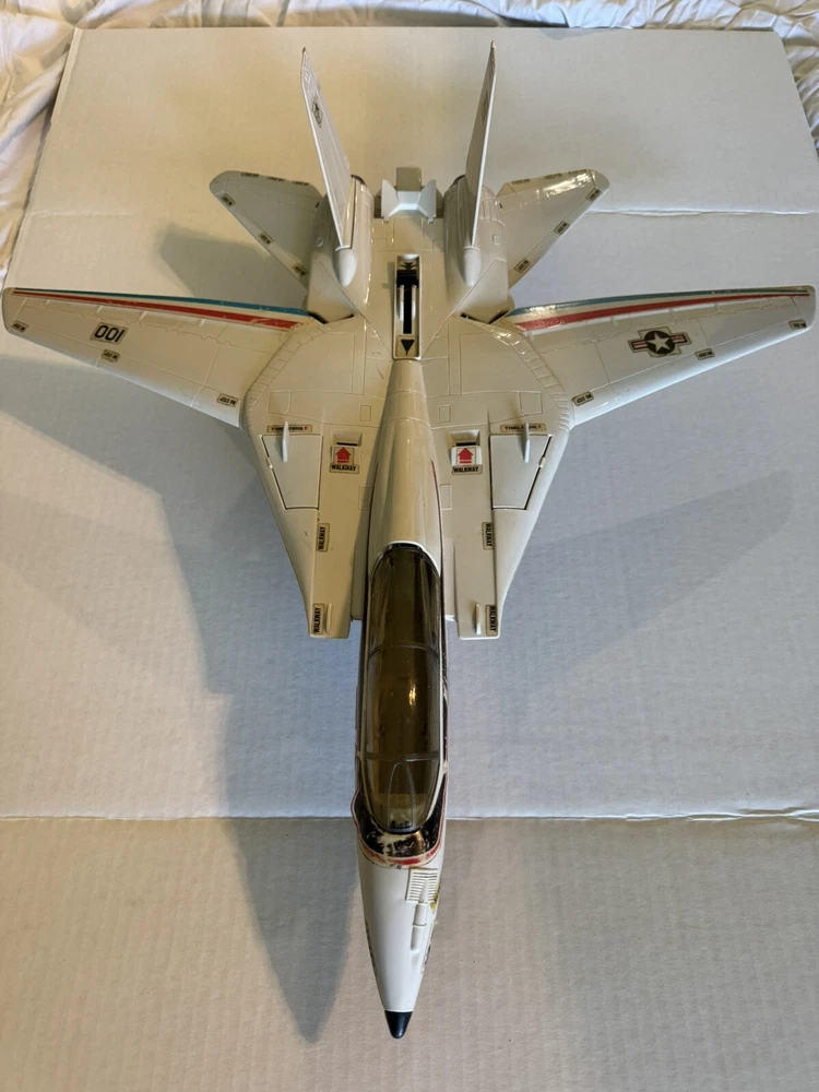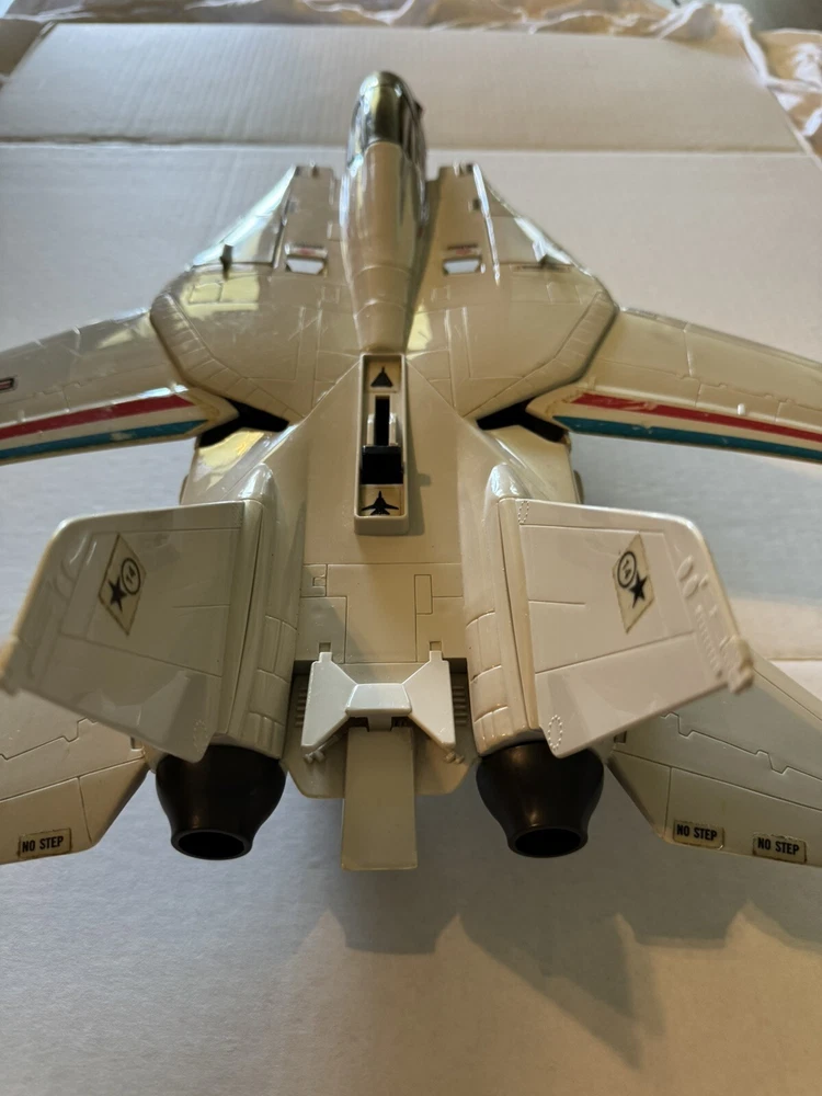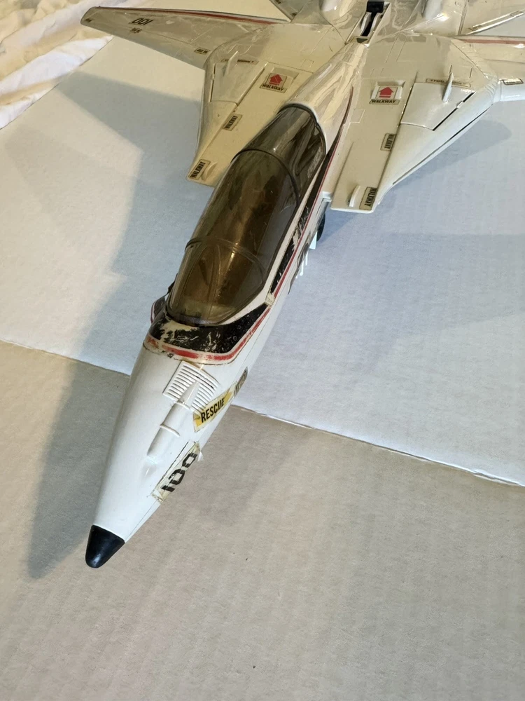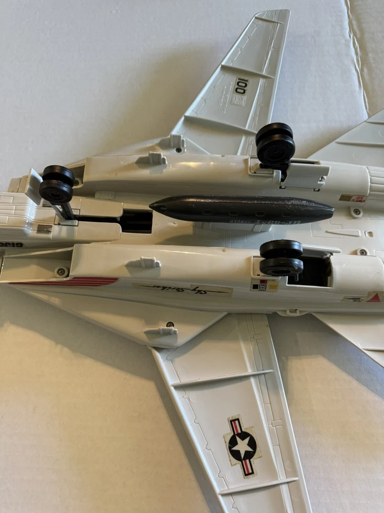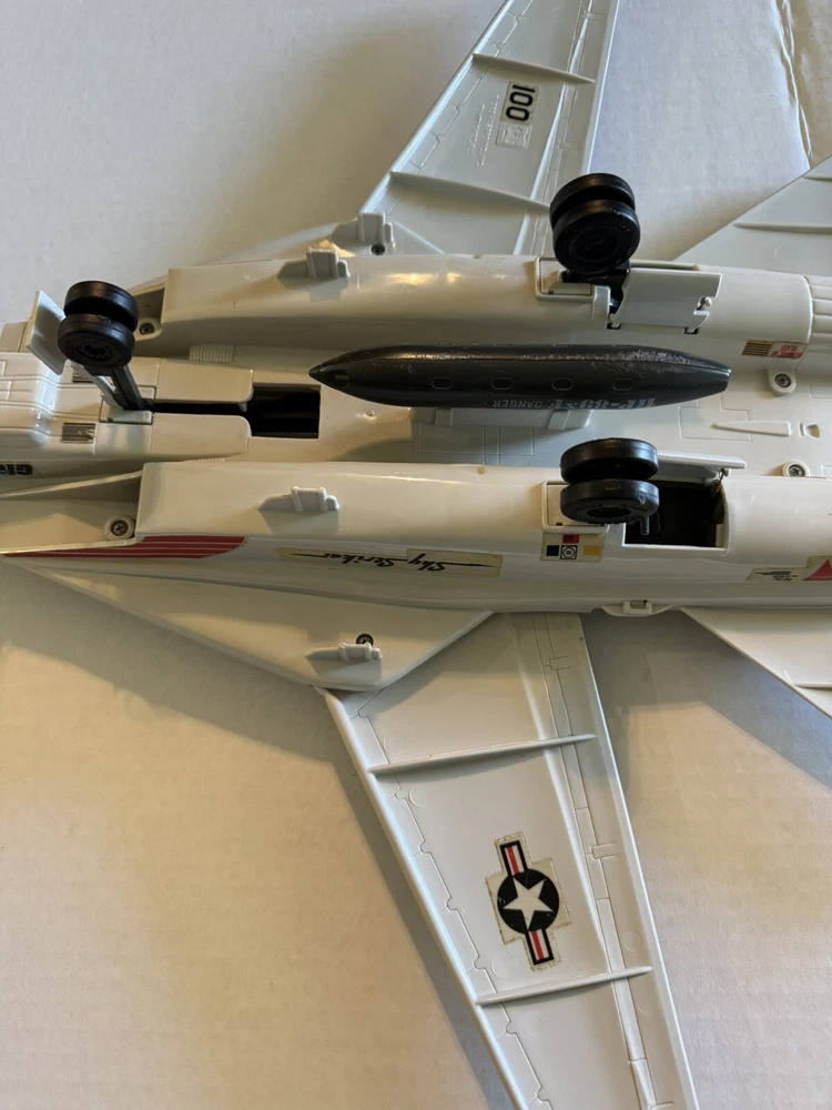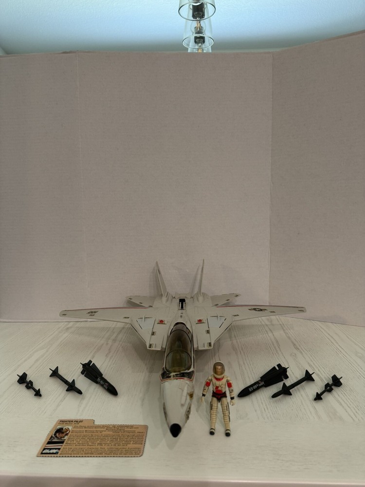 The GI Joe Combat Jet Skystriker (XP-14F) with Ace from 1983 is a vintage action figure toy manufactured by Hasbro. Ace is in nice condition complete with helmet and includes the card. The Skystriker Jet has missing parts and is not complete and has some wear in the stickers.
