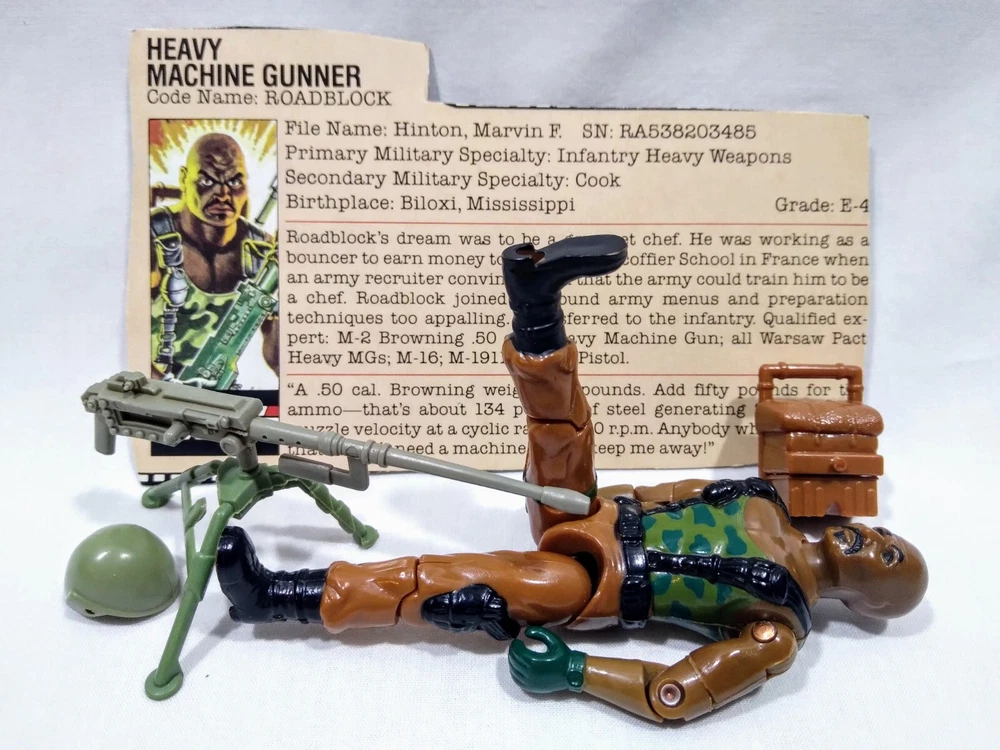 Original/Licensed Reproduction:Originalgtin13:Does not applyCharacter:Roadblock v1Time Period Manufactured:1980-1989Scale:1:18Type:Action FigureFranchise:G.I. JoeUPC:Does not applySeries:G.I. JoePackaging:Original (Opened)Year Manufactured:1984Vintage:YesBrand:HasbroSeller Notes:“Good condition. New O-Ring. One leg of tripod is bent.”Theme:Military & Adventure