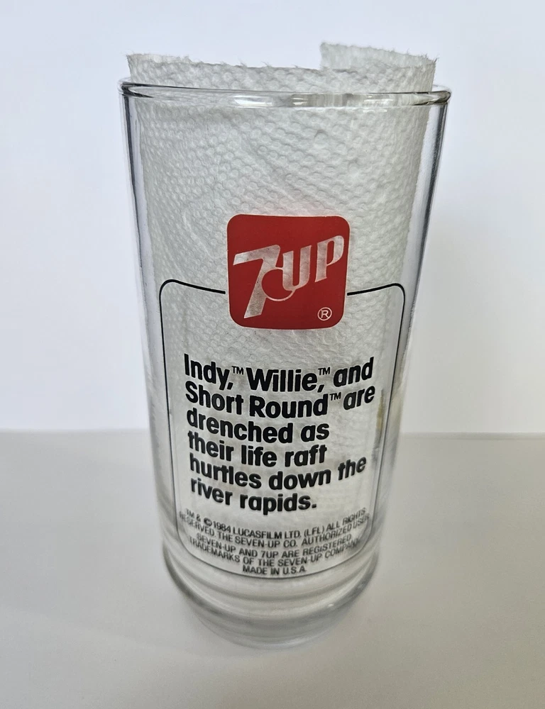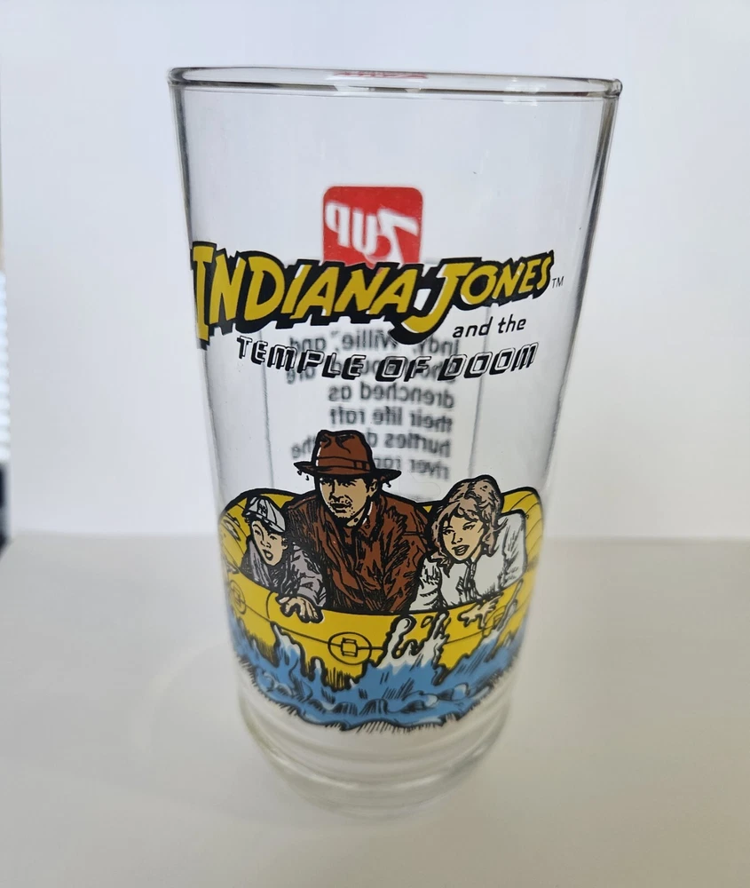 This 1984 Indiana Jones Temple of Doom glass features Indy, Willie, and Short Round enjoying a refreshing 7-UP. The clear glass adds a touch of elegance to any collection or kitchen. Made of high-quality glass, this piece is durable and perfect for daily use. The Indiana Jones franchise is known for its iconic characters and this glass is no exception. Whether you're a fan of the movies or simply appreciate collectibles, this glass is a must-have. Add it to your collection or gift it to a fellow Indiana Jones enthusiast.