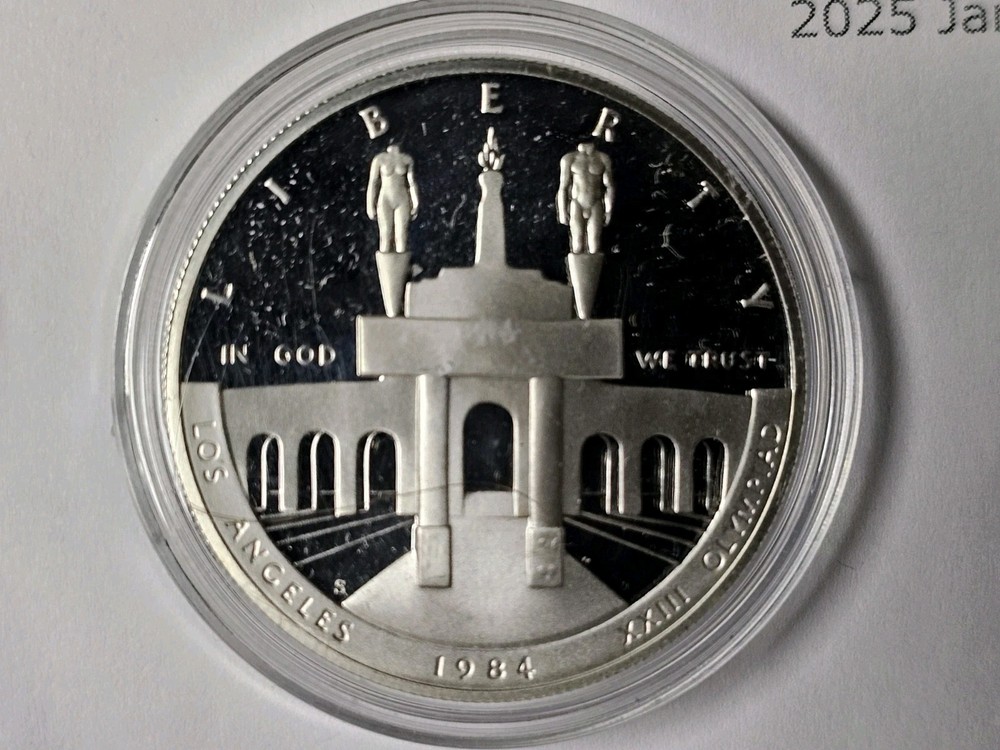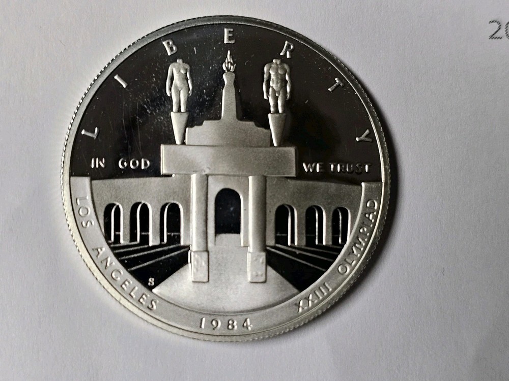 YOU WILL RECIEVE THE EXACT COIN PICTURED, THE PHOTO IN THE CAPSULE SHOWS THE CAPSULES CLOUDINESS NOT THE COINS.This is a proof 1984 Los Angeles Olympics silver commemorative coin from the United States. The coin features a modern silver/clad composition and is ungraded. It was struck in San Francisco and has not been circulated. The denomination is $1 and it is uncertified. The coin was released to commemorate the 1984 Los Angeles Olympics.