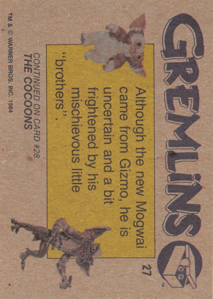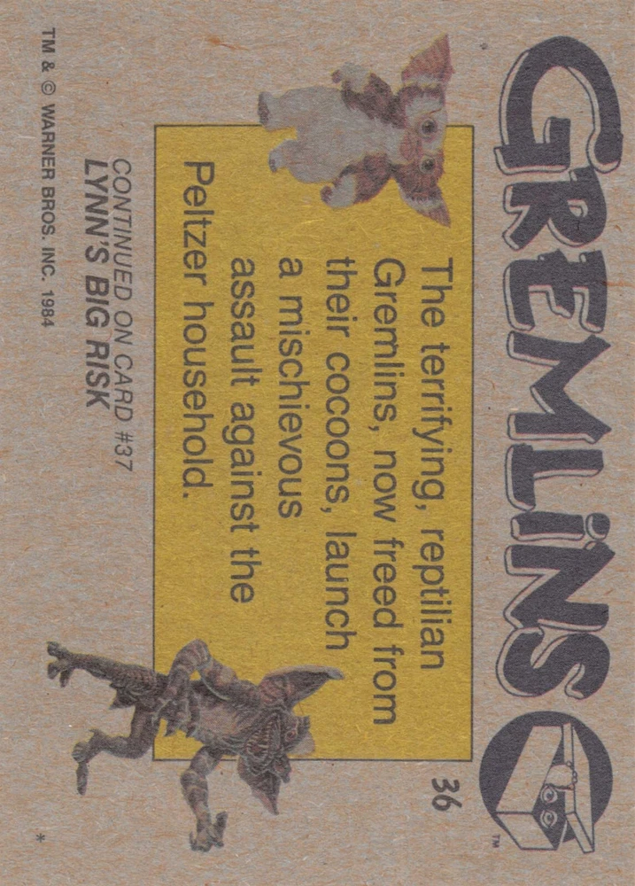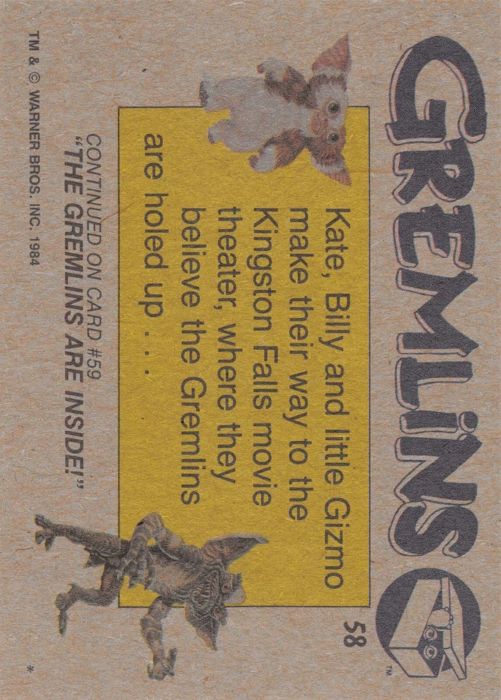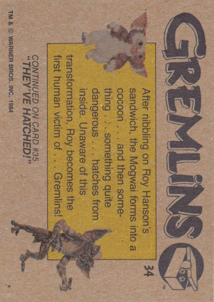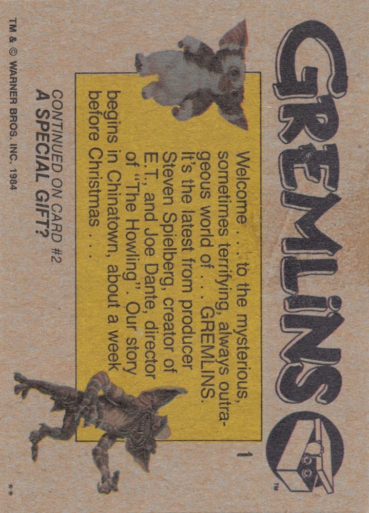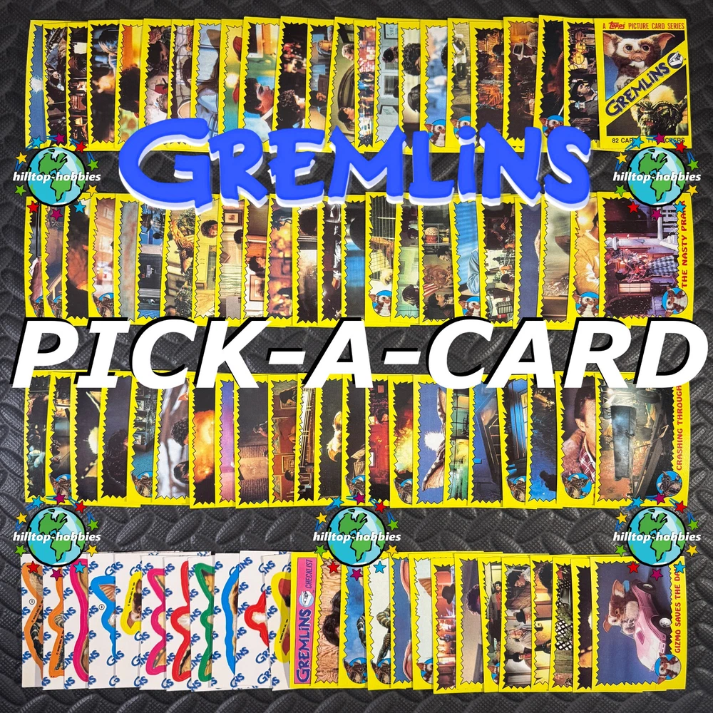 This listing is for your choice of any available 1984 Topps Gremlins card, sticker or wrapper from the drop-down menu above. Photos show front and backside of each card, be sure to scroll sideways to view front and backside photos! Any questions? Please ask before buying. International "USPS First Class Mail" will not include a tracking number for this item, if you would like a tracking number please choose the "eBay International Standard Shipping" option when you check out. As with all of my "pick-a-card" listings, I will be shipping with "eBay Standard Envelope". The rules of this envelope state that it cannot be too thick, so please expect your order to be packaged as follows: 1 to 6 cards will be slid into a single sleeve, the sleeve will then be slid inside of a semi-rigid Card-Saver. 7 to 12 cards will be slid into a double sleeve, 13 to 18 cards into a triple sleeve, 19 to 24 cards into a quadruple sleeve(up to six cards per sleeve). The double, triple and quadruple sleeve shipping will not have the Card-Saver. If you buy more than 1 card and want it packaged with more than 1 Card-Saver(or 1 sleeve per card), I kindly ask that you contact me before purchasing to be sure that this is possible to have it done with the stated shipping charge, or if additional shipping would be required. If you do not contact me, then you can expect to receive your order packaged as I have explained here. Please do not expect rigid top-loaders to be included, I don't normally keep a lot of them in stock, but if you message me prior to ordering I will be able to see if I have any that can be included with your order - additional shipping may be required. In order to get free combined shipping from this and any of my other "pick-a-card" listings, you must add all of your cards to the cart and check out when you are done shopping. If you do not use the cart you will be overpaying on shipping and I cannot refund you on over-payed shipping. So please use the cart and get your FREE COMBINED SHIPPING!
