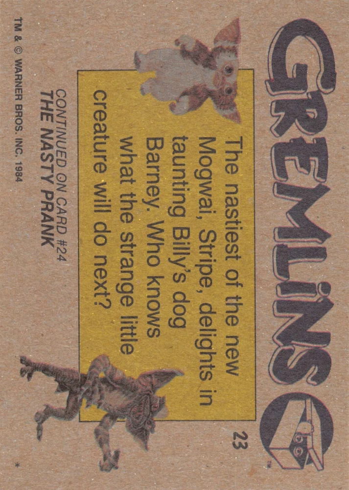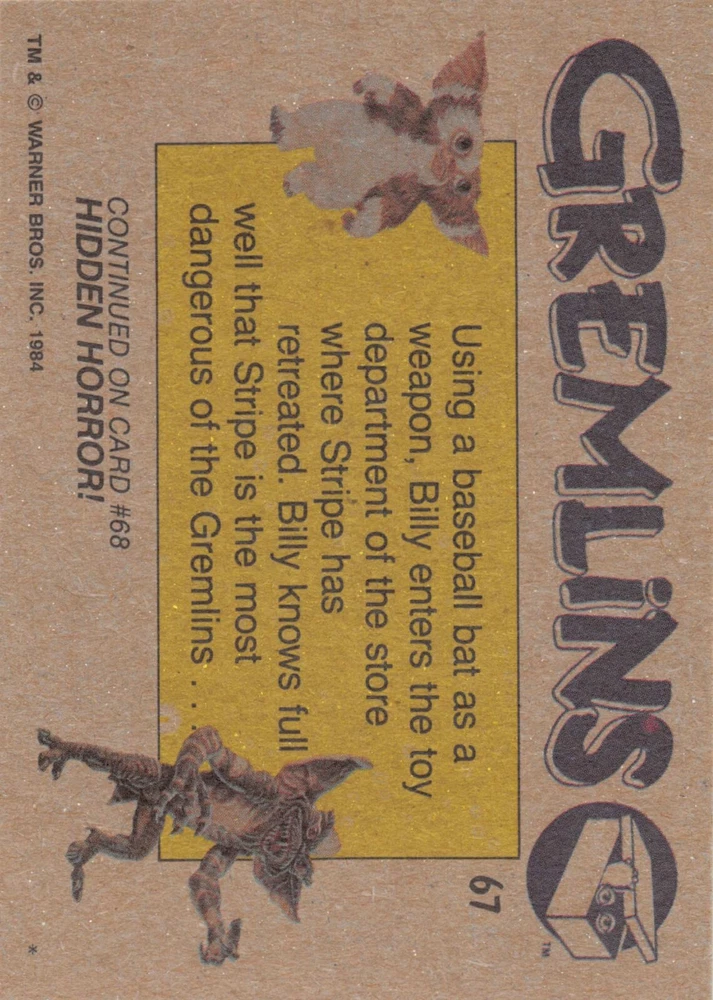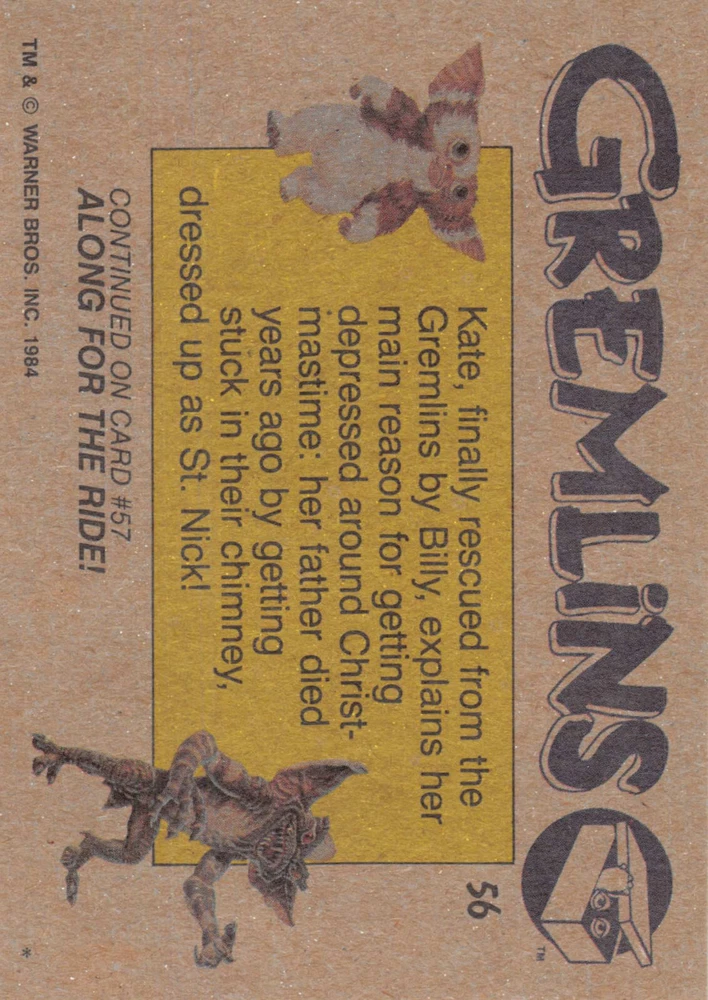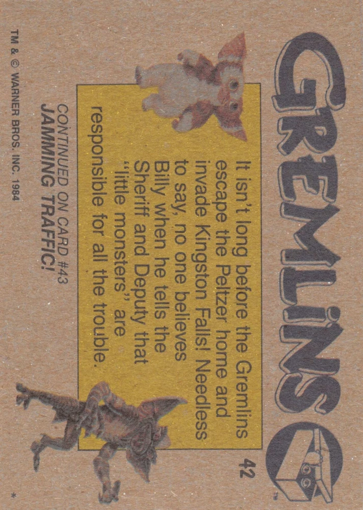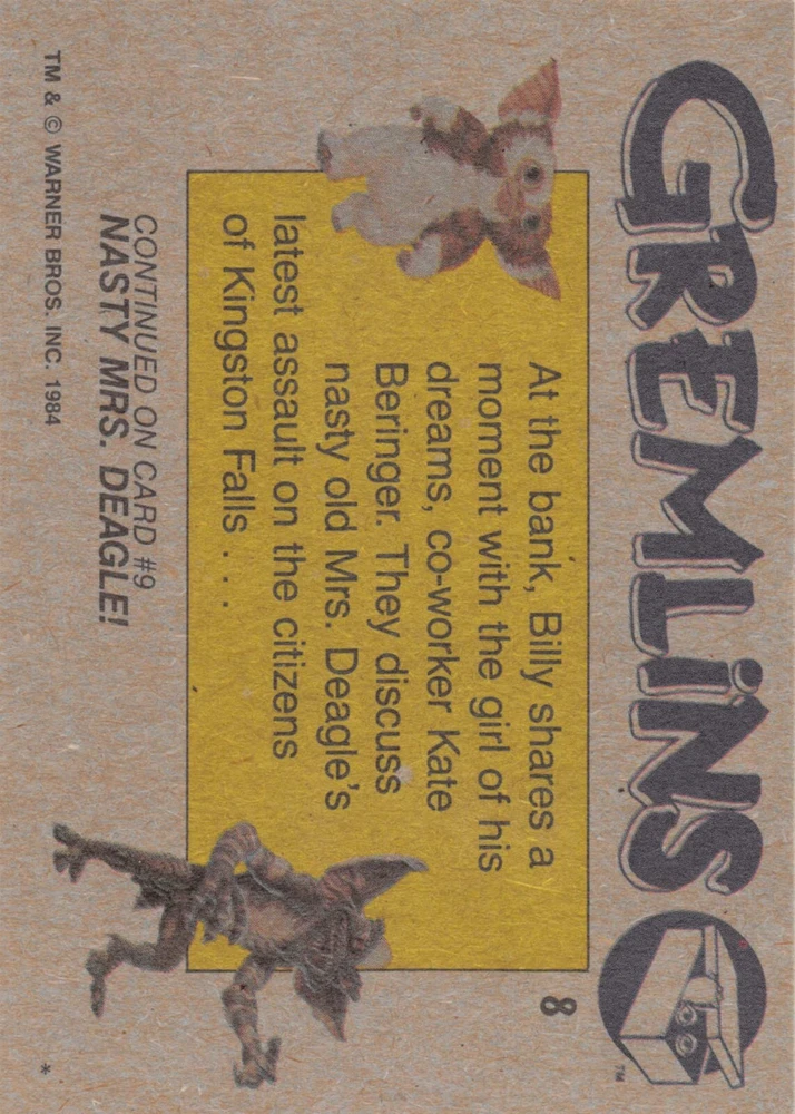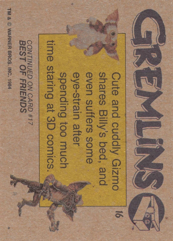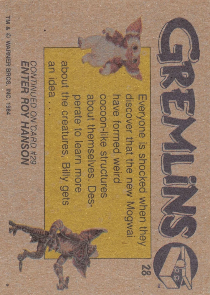 This listing is for your choice of any available 1984 Topps Gremlins card, sticker or wrapper from the drop-down menu above. Photos show front and backside of each card, be sure to scroll sideways to view front and backside photos! Any questions? Please ask before buying. International "USPS First Class Mail" will not include a tracking number for this item, if you would like a tracking number please choose the "eBay International Standard Shipping" option when you check out. As with all of my "pick-a-card" listings, I will be shipping with "eBay Standard Envelope". The rules of this envelope state that it cannot be too thick, so please expect your order to be packaged as follows: 1 to 6 cards will be slid into a single sleeve, the sleeve will then be slid inside of a semi-rigid Card-Saver. 7 to 12 cards will be slid into a double sleeve, 13 to 18 cards into a triple sleeve, 19 to 24 cards into a quadruple sleeve(up to six cards per sleeve). The double, triple and quadruple sleeve shipping will not have the Card-Saver. If you buy more than 1 card and want it packaged with more than 1 Card-Saver(or 1 sleeve per card), I kindly ask that you contact me before purchasing to be sure that this is possible to have it done with the stated shipping charge, or if additional shipping would be required. If you do not contact me, then you can expect to receive your order packaged as I have explained here. Please do not expect rigid top-loaders to be included, I don't normally keep a lot of them in stock, but if you message me prior to ordering I will be able to see if I have any that can be included with your order - additional shipping may be required. In order to get free combined shipping from this and any of my other "pick-a-card" listings, you must add all of your cards to the cart and check out when you are done shopping. If you do not use the cart you will be overpaying on shipping and I cannot refund you on over-payed shipping. So please use the cart and get your FREE COMBINED SHIPPING!