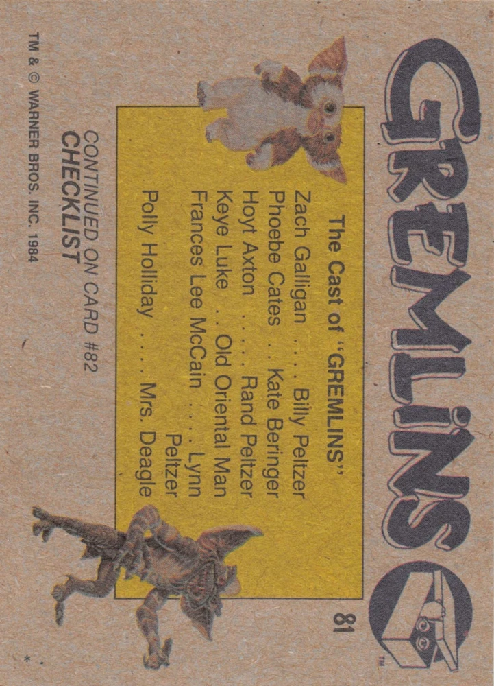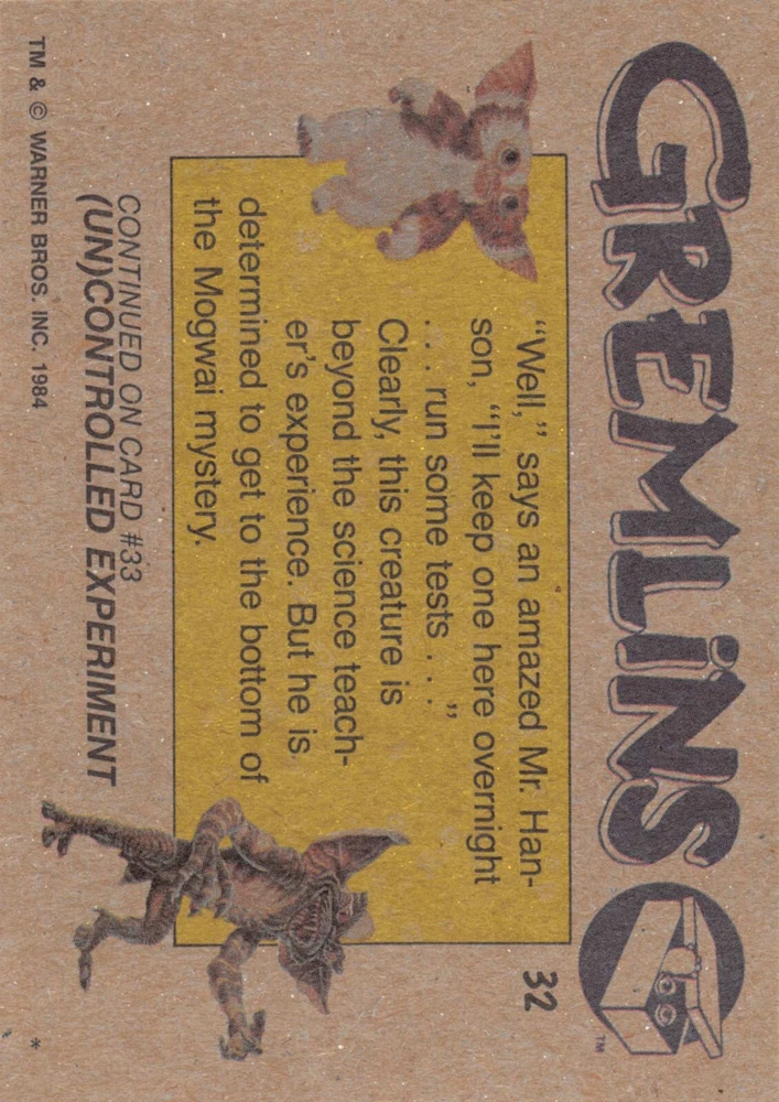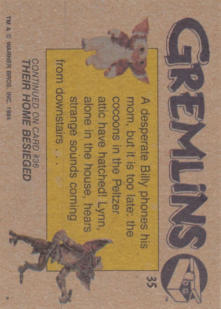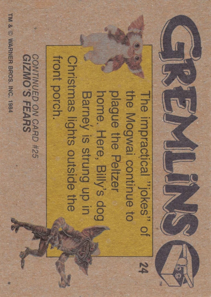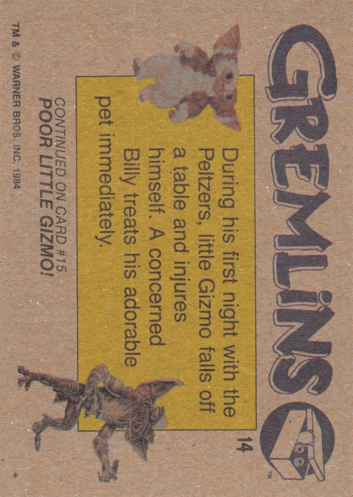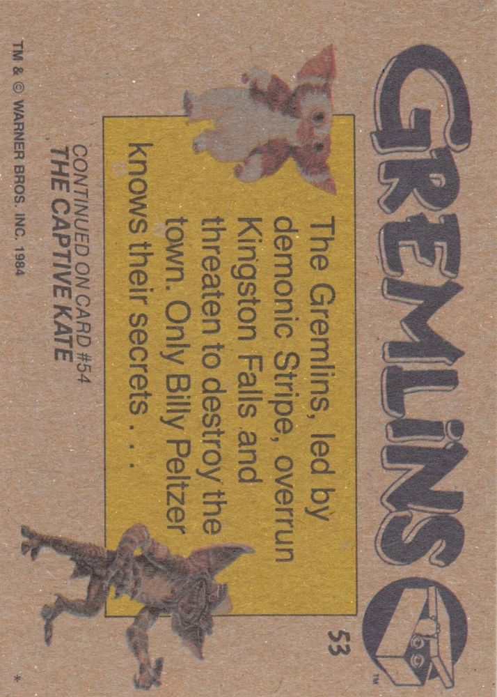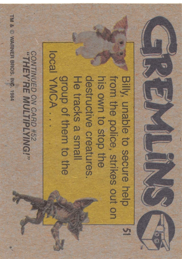 This listing is for your choice of any available 1984 Topps Gremlins card, sticker or wrapper from the drop-down menu above. Photos show front and backside of each card, be sure to scroll sideways to view front and backside photos! Any questions? Please ask before buying. International "USPS First Class Mail" will not include a tracking number for this item, if you would like a tracking number please choose the "eBay International Standard Shipping" option when you check out. As with all of my "pick-a-card" listings, I will be shipping with "eBay Standard Envelope". The rules of this envelope state that it cannot be too thick, so please expect your order to be packaged as follows: 1 to 6 cards will be slid into a single sleeve, the sleeve will then be slid inside of a semi-rigid Card-Saver. 7 to 12 cards will be slid into a double sleeve, 13 to 18 cards into a triple sleeve, 19 to 24 cards into a quadruple sleeve(up to six cards per sleeve). The double, triple and quadruple sleeve shipping will not have the Card-Saver. If you buy more than 1 card and want it packaged with more than 1 Card-Saver(or 1 sleeve per card), I kindly ask that you contact me before purchasing to be sure that this is possible to have it done with the stated shipping charge, or if additional shipping would be required. If you do not contact me, then you can expect to receive your order packaged as I have explained here. Please do not expect rigid top-loaders to be included, I don't normally keep a lot of them in stock, but if you message me prior to ordering I will be able to see if I have any that can be included with your order - additional shipping may be required. In order to get free combined shipping from this and any of my other "pick-a-card" listings, you must add all of your cards to the cart and check out when you are done shopping. If you do not use the cart you will be overpaying on shipping and I cannot refund you on over-payed shipping. So please use the cart and get your FREE COMBINED SHIPPING!