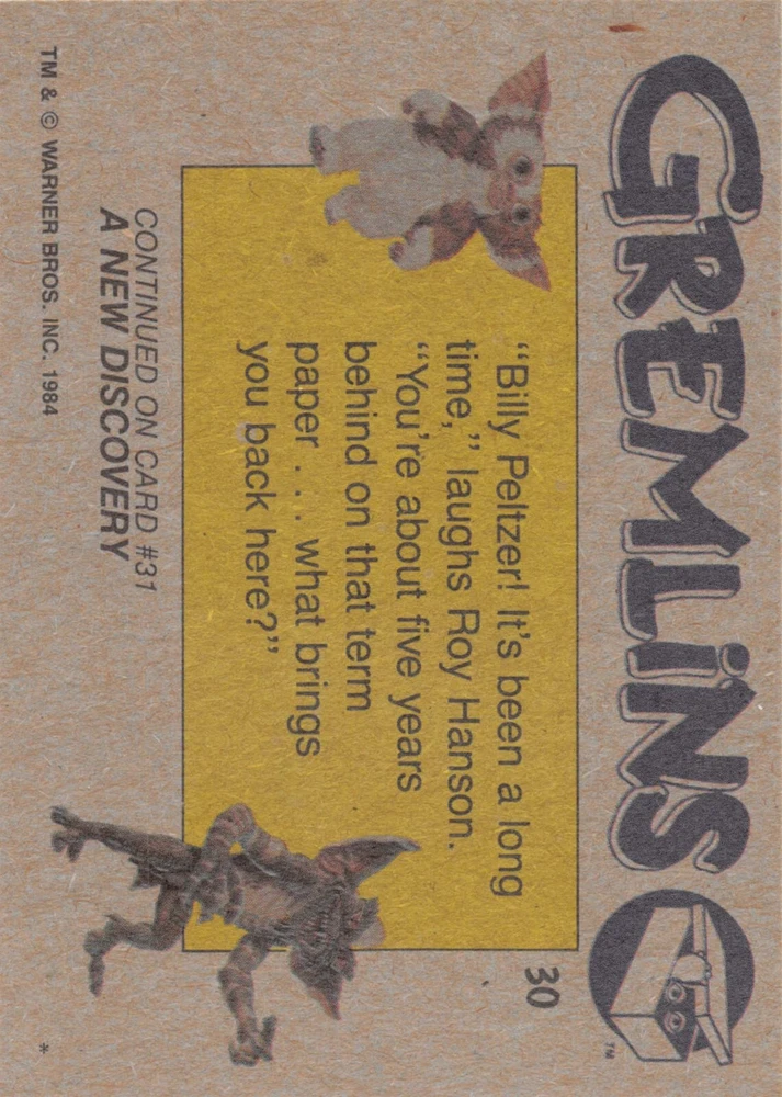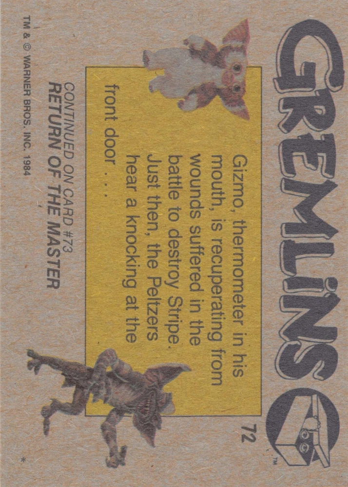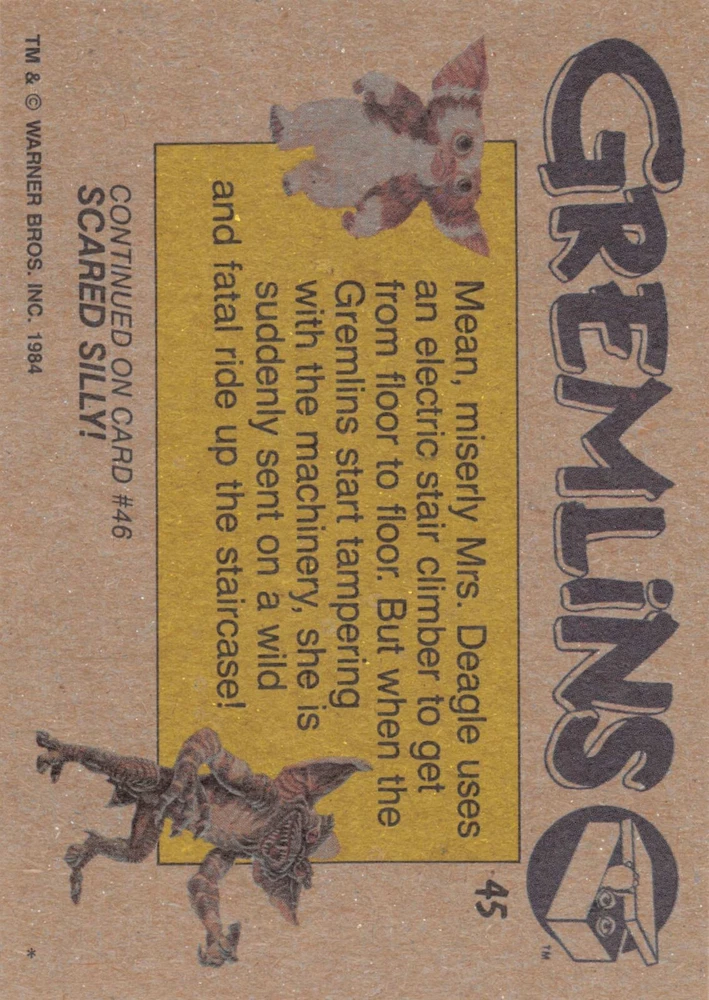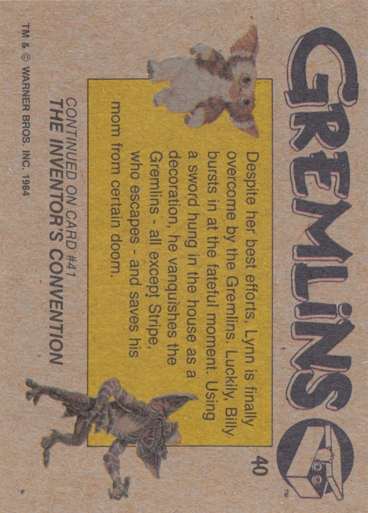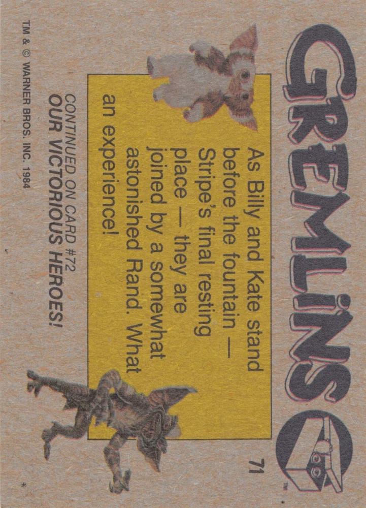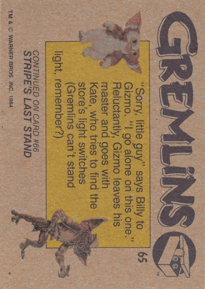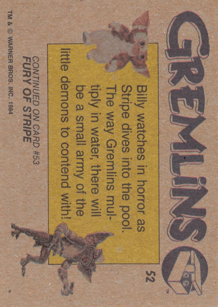 This listing is for your choice of any available 1984 Topps Gremlins card, sticker or wrapper from the drop-down menu above. Photos show front and backside of each card, be sure to scroll sideways to view front and backside photos! Any questions? Please ask before buying. International "USPS First Class Mail" will not include a tracking number for this item, if you would like a tracking number please choose the "eBay International Standard Shipping" option when you check out. As with all of my "pick-a-card" listings, I will be shipping with "eBay Standard Envelope". The rules of this envelope state that it cannot be too thick, so please expect your order to be packaged as follows: 1 to 6 cards will be slid into a single sleeve, the sleeve will then be slid inside of a semi-rigid Card-Saver. 7 to 12 cards will be slid into a double sleeve, 13 to 18 cards into a triple sleeve, 19 to 24 cards into a quadruple sleeve(up to six cards per sleeve). The double, triple and quadruple sleeve shipping will not have the Card-Saver. If you buy more than 1 card and want it packaged with more than 1 Card-Saver(or 1 sleeve per card), I kindly ask that you contact me before purchasing to be sure that this is possible to have it done with the stated shipping charge, or if additional shipping would be required. If you do not contact me, then you can expect to receive your order packaged as I have explained here. Please do not expect rigid top-loaders to be included, I don't normally keep a lot of them in stock, but if you message me prior to ordering I will be able to see if I have any that can be included with your order - additional shipping may be required. In order to get free combined shipping from this and any of my other "pick-a-card" listings, you must add all of your cards to the cart and check out when you are done shopping. If you do not use the cart you will be overpaying on shipping and I cannot refund you on over-payed shipping. So please use the cart and get your FREE COMBINED SHIPPING!