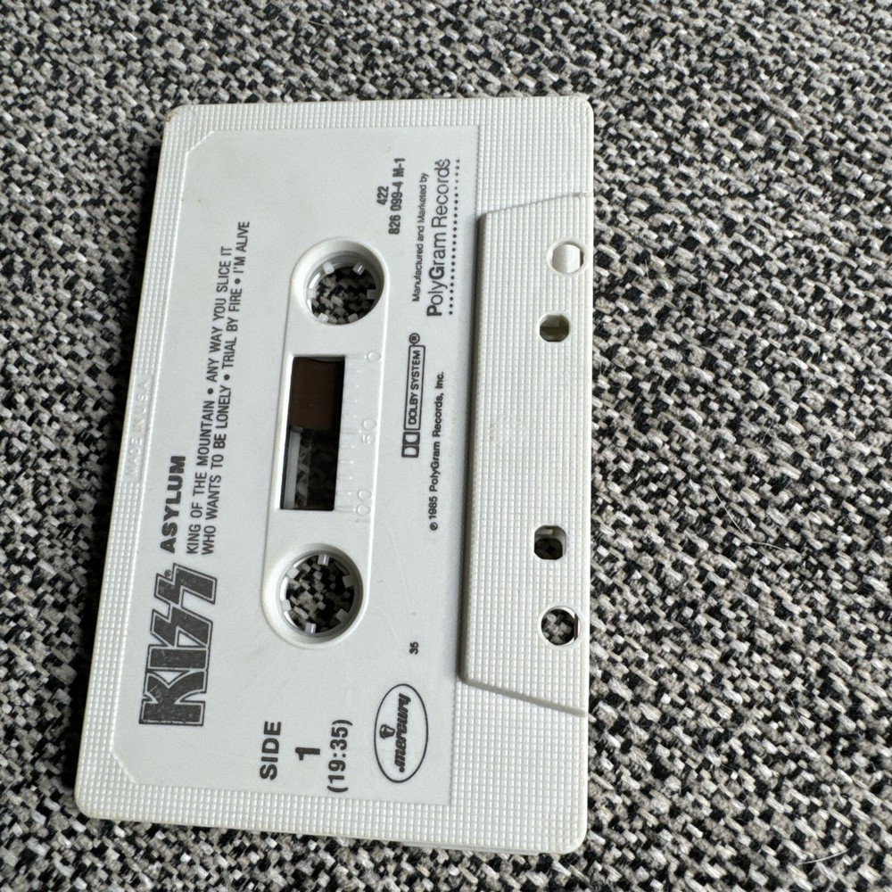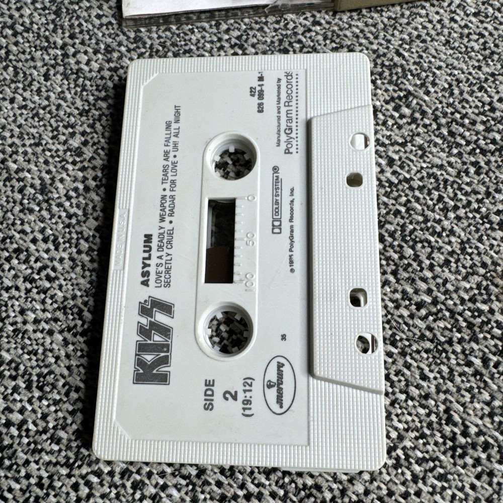 This Kiss Asylum cassette tape from 1985 is a must-have for any hard rock fan. Released by PolyGram Records, this first edition album features the iconic rock band at their best. The beige color of the jewel case and the excellent (EX) case condition make it a great addition to any collection. The cassette format and the very good (VG) inlay and recorder instrument make it a unique listening experience. With tracks like "Asylum" and "Gun for Hire," this album is sure to impress. This is a rare find for any Kiss collector and is a perfect addition to your music library.