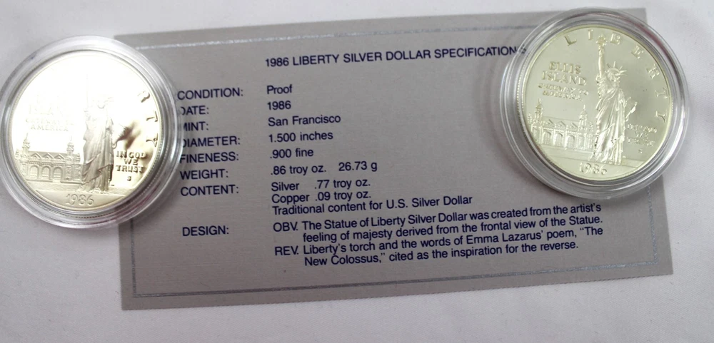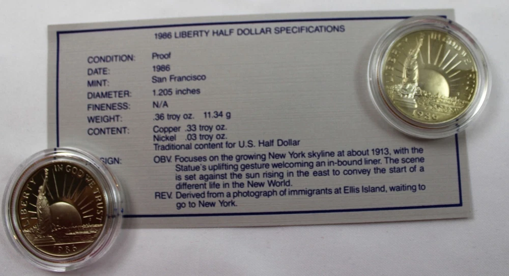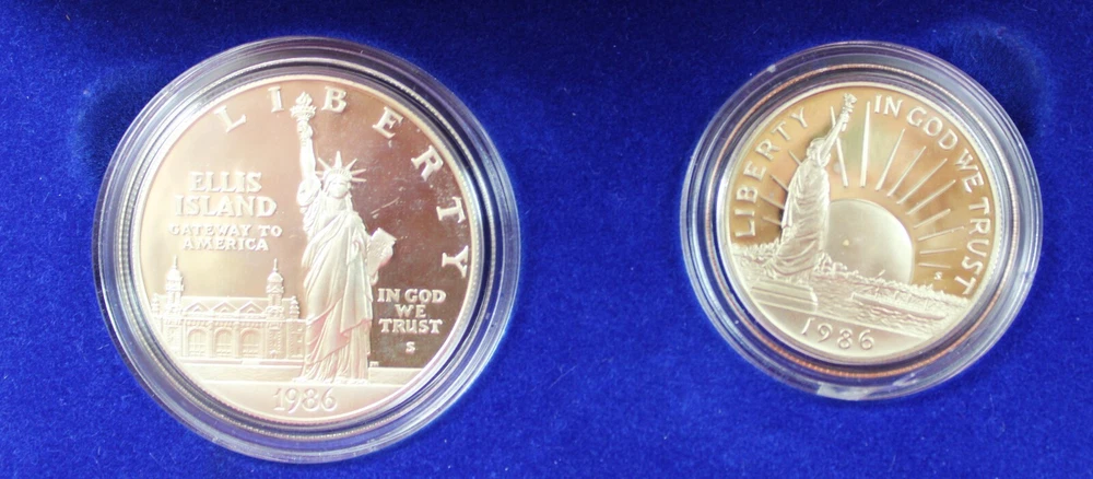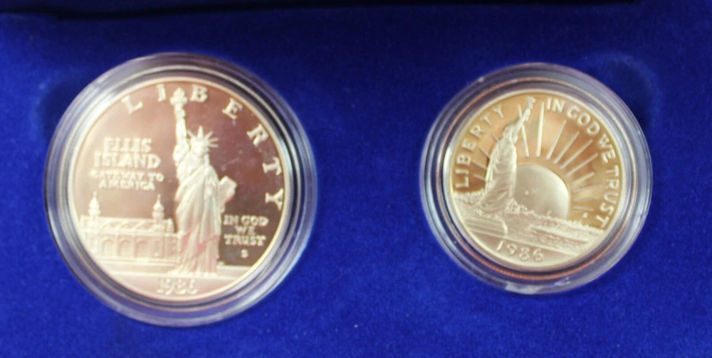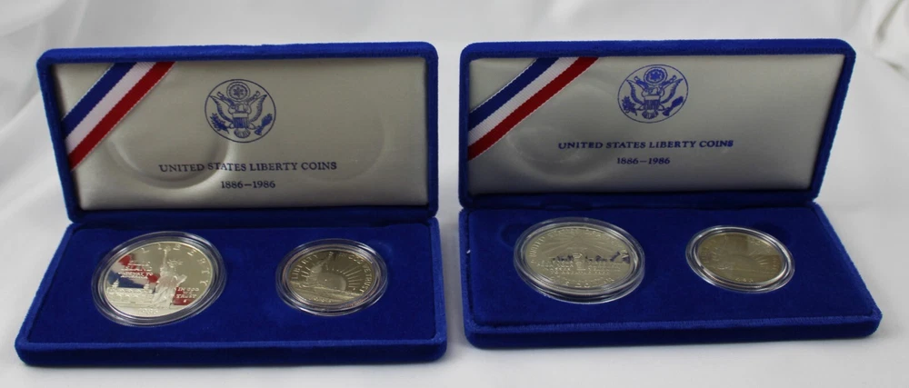 Total Weight of both boxes & coins: 12.86 oz Condition: These are from a collection we purchased. These two US Mint Liberty Coins Commemorative Proof Set is in lightly aged condition - the four coins have some slight toning. Each Box is from the San Francisco Mint & Features a 90% silver content 1 Dollar Proof Coin & a nickel & copper content 50c proof coin. Please view all photos. If you are a resident of the State of Indiana, there will be a 7% sales tax on your invoice. **There are some States that have started charging sales tax for online purchases, ebay will automatically add the tax to your invoice. We cannot remove this tax. We are only authorized to ship to the confirmed address supplied from Ebay Items or combined items over $75.00 US will be shipped USPS Priority. Items over $1000.00 US will be shipped USPS Express. We ship from the Midwest, Monday through Thursday, 8:00AM to 11:00 AM Eastern Standard Time. Purchases made after business hours, weekends, and holidays will be processed the following business day. A tracking number will only be uploaded to ebay once the item has shipped. No changes can be made once payment is received. If a mistake occurs, we MUST cancel and refund the payment. You will have to repurchase the item (s) with the correct information on for your address and payment method. Multiple orders paid with multiple transactions will be shipped separately and will not qualify for the discounted shipping fees Payment is expected within 3 days of winning an item. If you are having a problem with payment, please contact us. We are happy to combine shipping on items - just wait to pay until you are done shopping and then we will send you a final invoice with a combined shipping discount. We require payment within 7 days after your first item was won. On any international packages valued at $50.00 or over, I will now only ship by Priority International Mail or Fed EX. A tracking number is provided for those services. Even if the package weighs less than 4 lbs, which qualifies for First Class International Mail shipping, I will ONLY ship via Priority International or Priority Flat Rate International mail. Ebay uses the tracking number to prove the item has been delivered. ***International Buyers Please check with your country's customs office to determine what these additional costs will be before bidding. These charges are normally collected by the delivering freight (shipping) company or when you pick the item up- do not confuse them for additional shipping charges. We do not mark merchandise values below value or mark items as "gifts" - US and International government regulations prohibit such behavior. Import duties, taxes and charges are not included in the item price or shipping charges. These charges are the buyer's responsibility .
