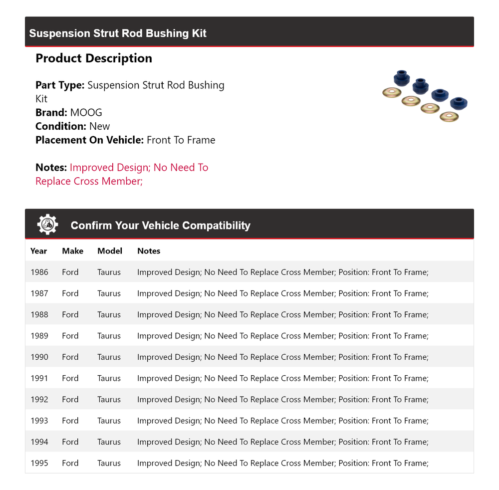 Document For 1986-1995 Ford Taurus Suspension Strut Rod Bushing Kit Front To Frame MOOG Notes: Improved Design; No Need To Replace Cross Member; Placement on Vehicle: Front To Frame Product Description Description Brand: MOOG Warranty: 12 Month Warranty Part Type: Suspension Strut Rod Bushing Kit Compatible Years: 1986 1987 1988 1989 1990 1991 1992 1993 1994 1995 Description Strt Rod Bushing Kit Front To Frame Suspension Strut Rod Bushing Kit Easy to install. Restores like-new steering and handling. Engineered to meet or exceed OE requirements. Construction and design validated by MOOG engineers. Incorporates proven design and engineering features. Item Specifics Bushing Inside Diameter: 0.800 IN Bushing Length: 1.830 IN Bushing Material: Polyurethane Meets/Exceeds OE Manufacturer Specs: Yes Bushing Outside Diameter: 2.240 IN Confirm Your Vehicle Compatibility Year Make Model Notes 1986 Ford Taurus Improved Design|No Need To Replace Cross Member| Position: Front To Frame; 1987 Ford Taurus Improved Design|No Need To Replace Cross Member| Position: Front To Frame; 1988 Ford Taurus Improved Design|No Need To Replace Cross Member| Position: Front To Frame; 1989 Ford Taurus Improved Design|No Need To Replace Cross Member| Position: Front To Frame; 1990 Ford Taurus Improved Design|No Need To Replace Cross Member| Position: Front To Frame; 1991 Ford Taurus Improved Design|No Need To Replace Cross Member| Position: Front To Frame; 1992 Ford Taurus Improved Design|No Need To Replace Cross Member| Position: Front To Frame; 1993 Ford Taurus Improved Design|No Need To Replace Cross Member| Position: Front To Frame; 1994 Ford Taurus Improved Design|No Need To Replace Cross Member| Position: Front To Frame; 1995 Ford Taurus Improved Design|No Need To Replace Cross Member| Position: Front To Frame; Please read before purchasing Shipping and Cancellation Policy We utilize UPS, FedEx, and USPS for shipping, selecting the nearest available location to expedite delivery. Tracking numbers will be uploaded on eBay upon shipment. Most items are shipped on the same business day. Please note that interchange tables are intended for American Market Vehicles only. All orders are processed automatically. Before placing your order, please: Ensure that this part fits your vehicle by entering your vehicle's Year, Make, Model, Trim, and Engine in the Compatibility Table. Additionally, review the notes section in the compatibility chart for additional specifications about this part. If you're still unsure whether the part fits your car, please contact us for assistance. Verify that the item you're about to purchase will solve the problem with your car. Double-check that the delivery address provided during checkout is accurate. Return Policy We offer free returns for domestic purchases. However, please note that we are not responsible for the cost of international return shipping. Before returning items or leaving anything other than positive feedback, please contact us. For further details regarding returns, please refer to the "Shipping and Payments" tab. Additionally, it is important to understand that manufacturers reserve the right to modify the appearance or material of their items. They may even discontinue an item and replace it with an updated version. Consequently, the picture displayed may not always reflect the most recent changes, though this occurs rarely. We source our pictures directly from the manufacturer and may not immediately receive updated photos if changes are made. California Proposition 65 WARNING: This product may contain chemicals known to the State of California to cause cancer and birth defects or other reproductive harm. For more info go to www.p65warnings.ca.gov 2024 DTautoparts All Rights Reserved