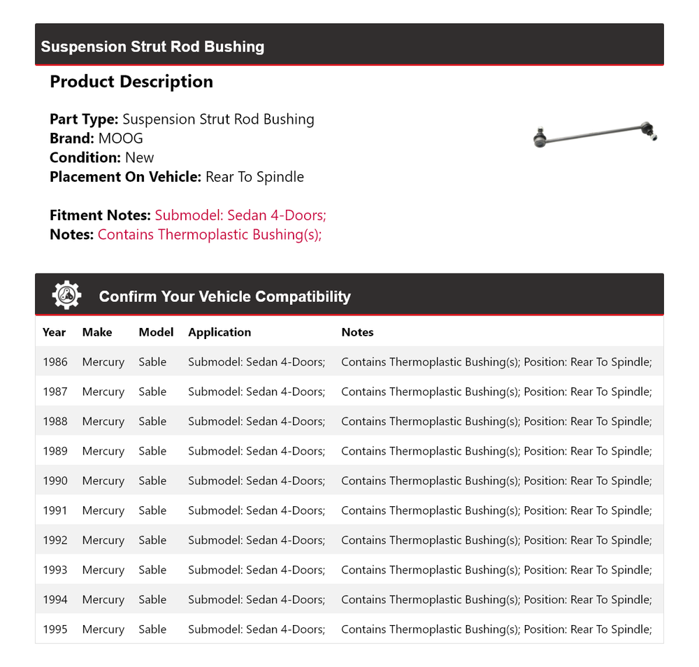 Document For 1986-1995 Mercury Sable Suspension Strut Rod Bushing Rear To Spindle MOOG Fitment Notes: Submodel: Sedan 4-Doors; Notes: Contains Thermoplastic Bushing(s); Placement on Vehicle: Rear To Spindle Product Description Description Brand: MOOG Warranty: 12 Month Warranty Part Type: Suspension Strut Rod Bushing Compatible Years: 1986 1987 1988 1989 1990 1991 1992 1993 1994 1995 Description Strut Rod Bushing Suspension Strut Rod Bushing Easy to install. Restores like-new steering and handling. Engineered to meet or exceed OE requirements. Construction and design validated by MOOG engineers. Incorporates proven design and engineering features. Item Specifics Inside Diameter: 0.670 IN Outside Diameter: 1.600 IN Length: 1.250 IN Material: Polyurethane Meets/Exceeds OE Manufacturer Specs: Yes Confirm Your Vehicle Compatibility Year Make Model Application Notes 1986 Mercury Sable Submodel: Sedan 4-Doors; Contains Thermoplastic Bushing(s)| Position: Rear To Spindle; 1987 Mercury Sable Submodel: Sedan 4-Doors; Contains Thermoplastic Bushing(s)| Position: Rear To Spindle; 1988 Mercury Sable Submodel: Sedan 4-Doors; Contains Thermoplastic Bushing(s)| Position: Rear To Spindle; 1989 Mercury Sable Submodel: Sedan 4-Doors; Contains Thermoplastic Bushing(s)| Position: Rear To Spindle; 1990 Mercury Sable Submodel: Sedan 4-Doors; Contains Thermoplastic Bushing(s)| Position: Rear To Spindle; 1991 Mercury Sable Submodel: Sedan 4-Doors; Contains Thermoplastic Bushing(s)| Position: Rear To Spindle; 1992 Mercury Sable Submodel: Sedan 4-Doors; Contains Thermoplastic Bushing(s)| Position: Rear To Spindle; 1993 Mercury Sable Submodel: Sedan 4-Doors; Contains Thermoplastic Bushing(s)| Position: Rear To Spindle; 1994 Mercury Sable Submodel: Sedan 4-Doors; Contains Thermoplastic Bushing(s)| Position: Rear To Spindle; 1995 Mercury Sable Submodel: Sedan 4-Doors; Contains Thermoplastic Bushing(s)| Position: Rear To Spindle; Please read before purchasing Shipping and Cancellation Policy We utilize UPS, FedEx, and USPS for shipping, selecting the nearest available location to expedite delivery. Tracking numbers will be uploaded on eBay upon shipment. Most items are shipped on the same business day. Please note that interchange tables are intended for American Market Vehicles only. All orders are processed automatically. Before placing your order, please: Ensure that this part fits your vehicle by entering your vehicle's Year, Make, Model, Trim, and Engine in the Compatibility Table. Additionally, review the notes section in the compatibility chart for additional specifications about this part. If you're still unsure whether the part fits your car, please contact us for assistance. Verify that the item you're about to purchase will solve the problem with your car. Double-check that the delivery address provided during checkout is accurate. Return Policy We offer free returns for domestic purchases. However, please note that we are not responsible for the cost of international return shipping. Before returning items or leaving anything other than positive feedback, please contact us. For further details regarding returns, please refer to the "Shipping and Payments" tab. Additionally, it is important to understand that manufacturers reserve the right to modify the appearance or material of their items. They may even discontinue an item and replace it with an updated version. Consequently, the picture displayed may not always reflect the most recent changes, though this occurs rarely. We source our pictures directly from the manufacturer and may not immediately receive updated photos if changes are made. California Proposition 65 WARNING: This product may contain chemicals known to the State of California to cause cancer and birth defects or other reproductive harm. For more info go to www.p65warnings.ca.gov 2024 DTautoparts All Rights Reserved