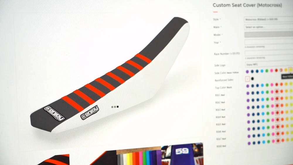 Specifications Handcrafted for the world fastest racers. Three die cut panels. Six die cut traction ribs. Die Cut for an exact fit. Triple stitch seams. Moto tech gripper material. Raised PVC rubber Enjoy MFG Logo. Enjoy MFG seat covers are used by the following Supercross/Motocross teams: Yoshimura Suzuki Troy Lee Design Honda Monster Energy Kawasaki JDR KTM Star Racing Yamaha *If you are looking for graphics kit please visit our Ebay Store. For more products c lick here and go to our Ebay Store Click here for matching Graphics Kit ****** IMPORT TAXES AND DUTIES MAY BE CHARGED BY YOUR COUNTRY. THIS IS AN EXTRA CHARGE NOT INCLUDED IN THE COST OF THE ITEM, OR THE SHIPPING CHARGES. THIS IS A TAX YOUR COUNTRY'S GOVERNMENT MAY, OR MAY NOT CHARGE WHICH IS BASED ON THE VALUE OF THE ITEM BEING IMPORTED INTO THE COUNTRY ******