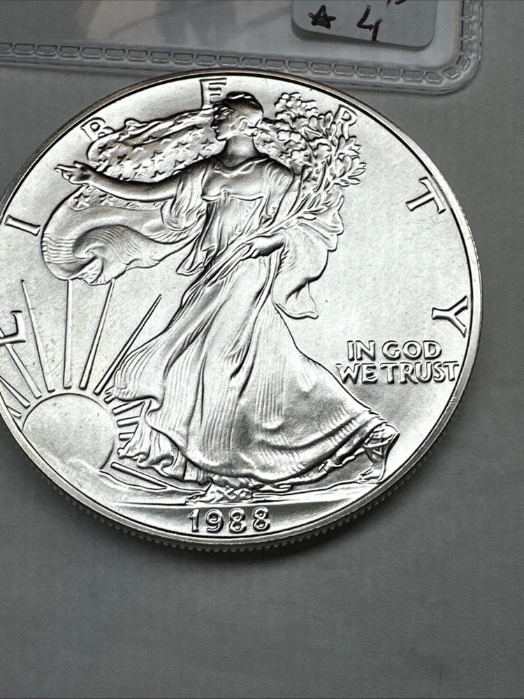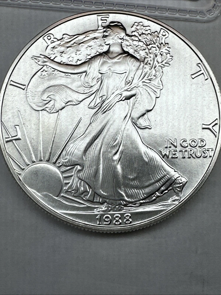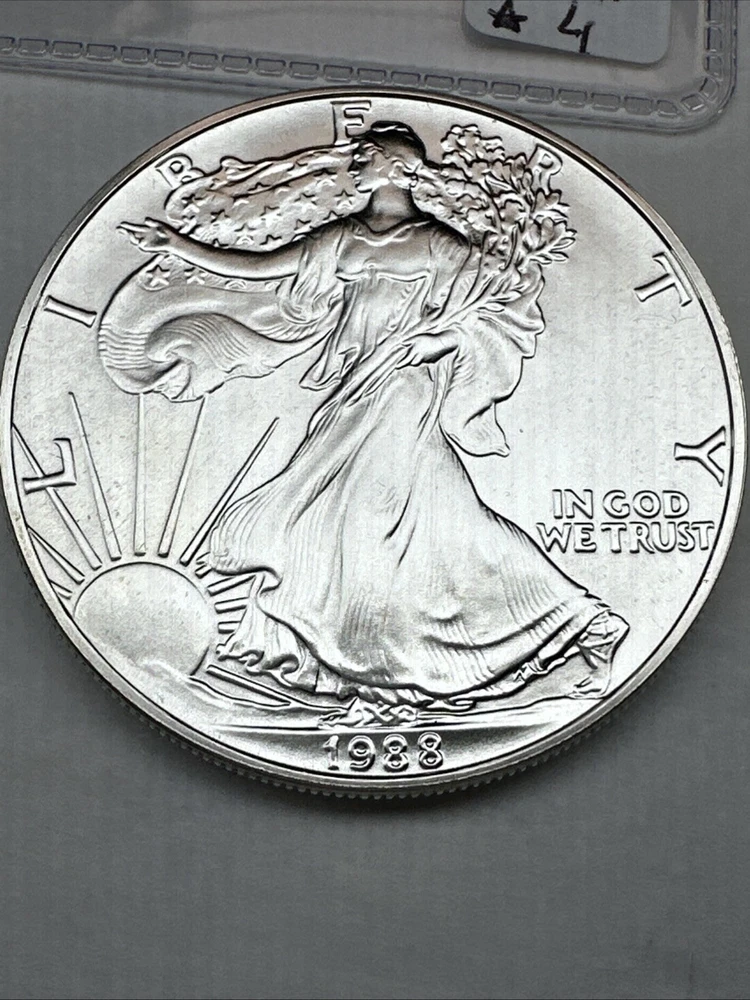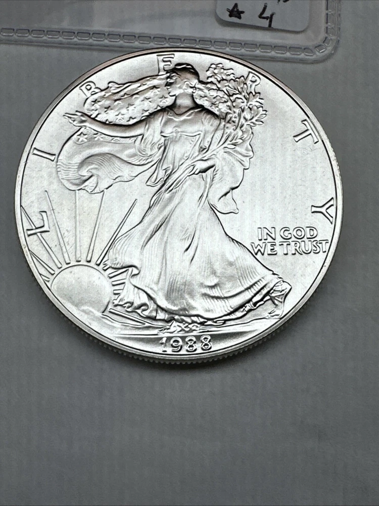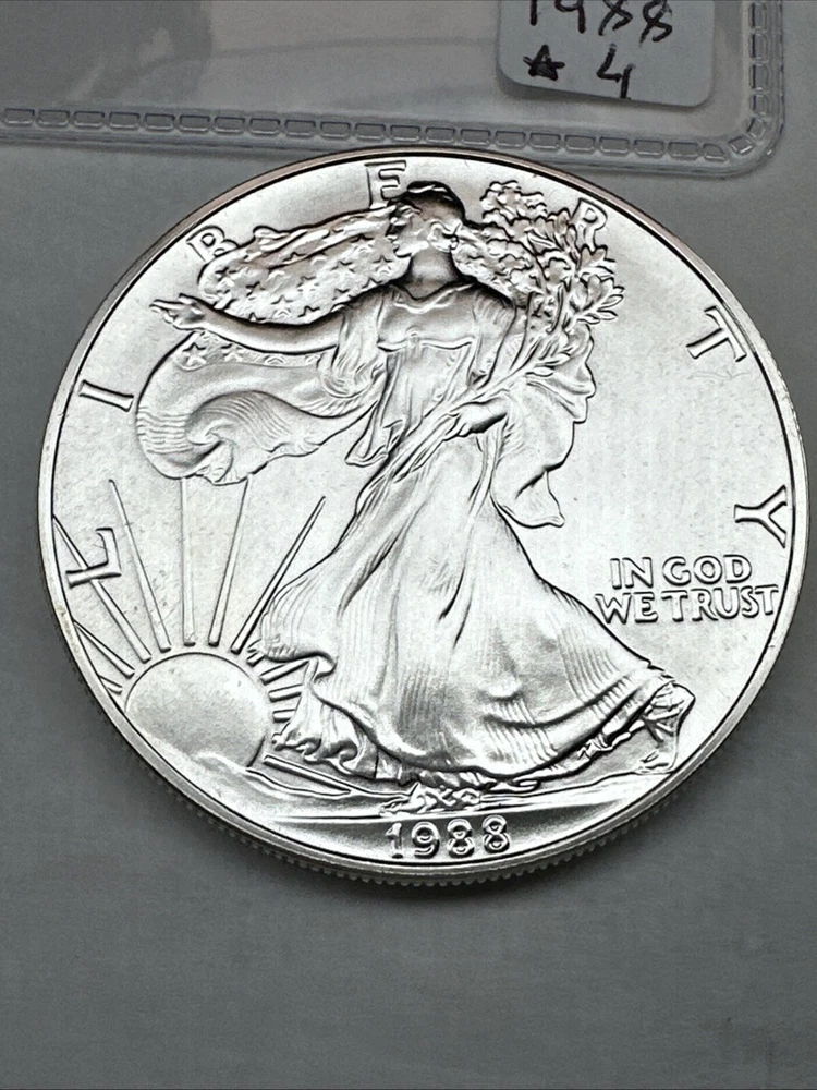 Fineness: 0.999 Certification: Uncertified Grade: Ungraded Coin: American Eagle Strike Type: Business Precious Metal Content per Unit: 1 oz Composition: Silver Brand/Mint: U.S. Mint Year: 1988 Brand: Silver Eagle Total Precious Metal Content: 1oz Country/Region of Manufacture: United States