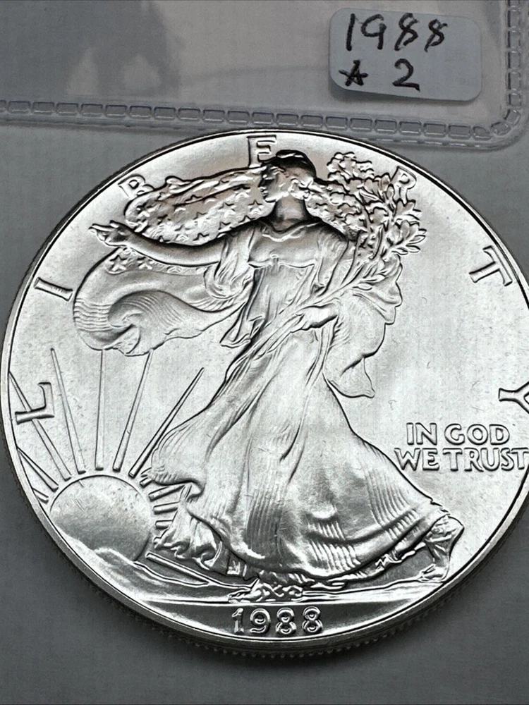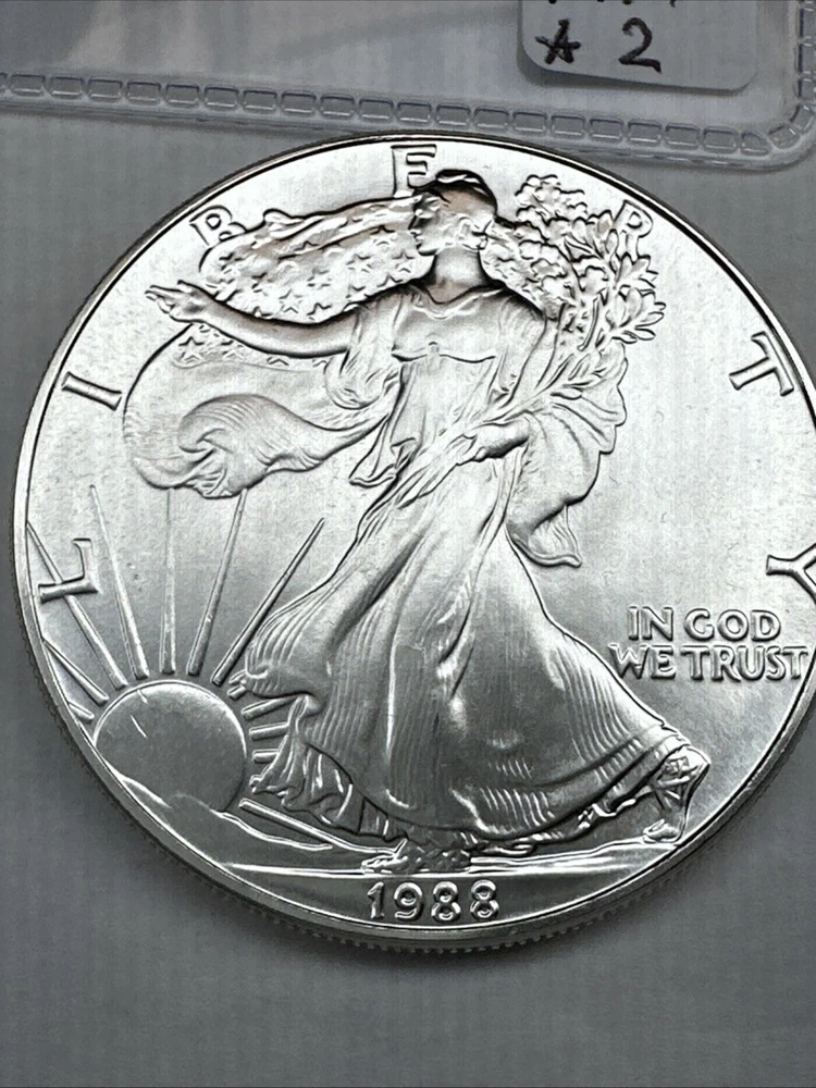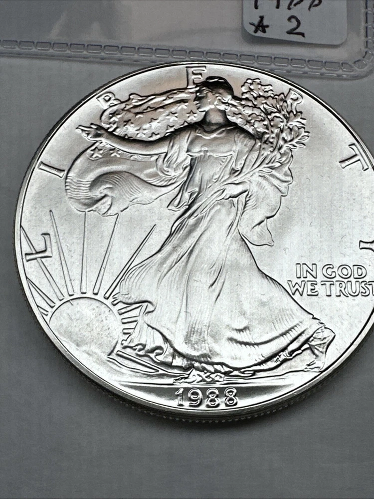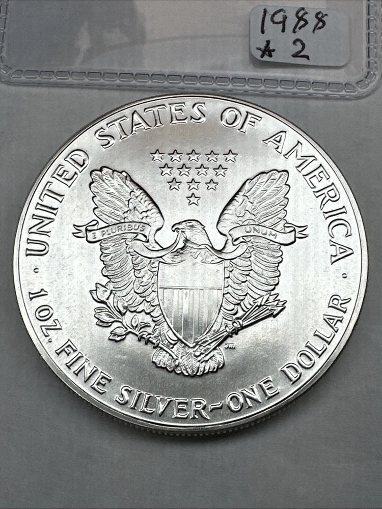 The product is a 1988 American Silver Eagle coin, minted by the U.S. Mint. It contains 1 oz of .999 fine silver, marked with a business strike type. The coin features the iconic Silver Eagle design and is certified as Brilliant Uncirculated.
