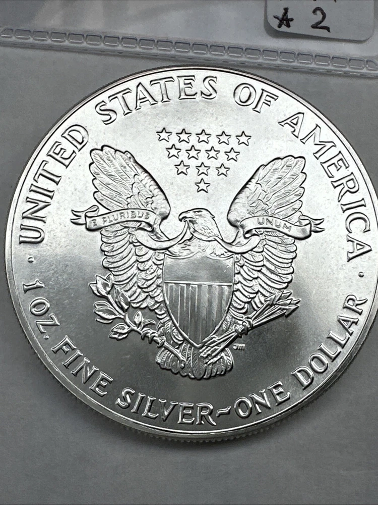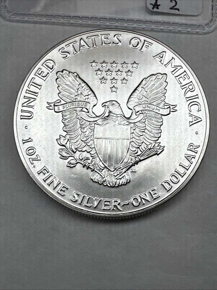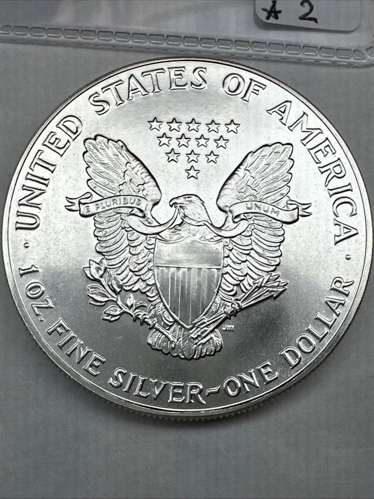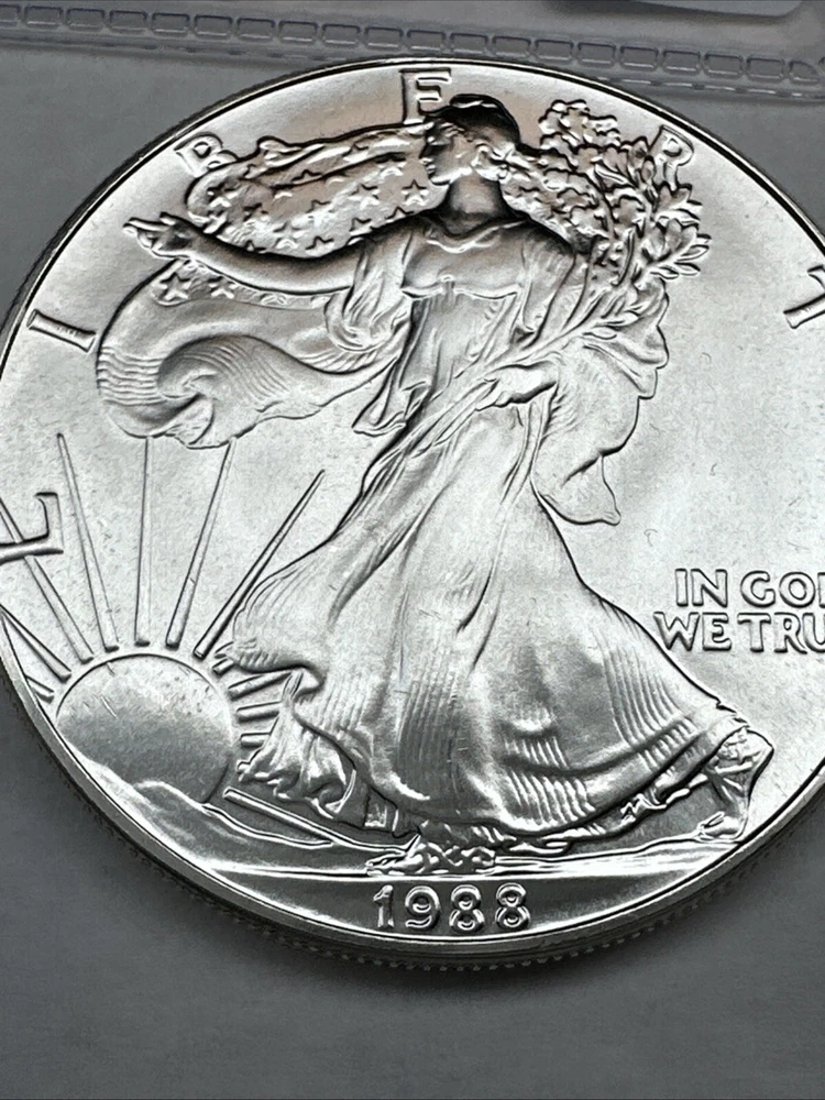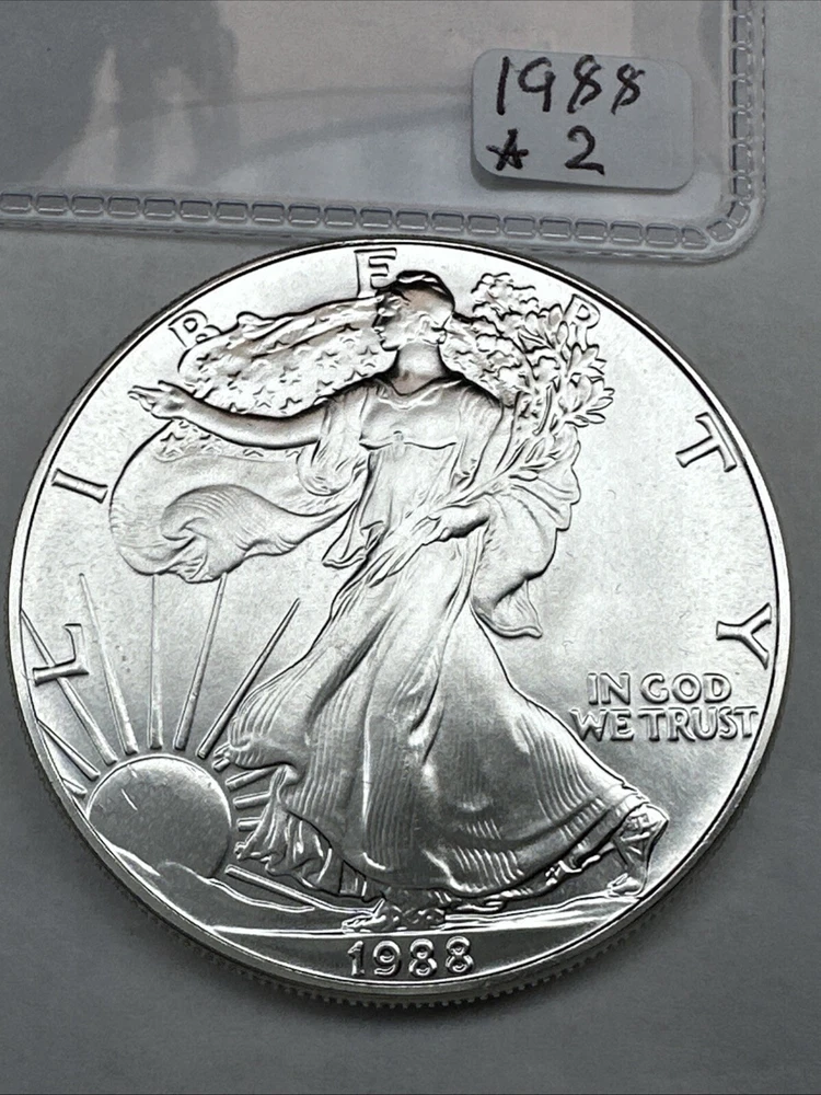 The product is a 1988 American Silver Eagle coin, minted by the U.S. Mint. It contains 1 oz of .999 fine silver, marked with a business strike type. The coin features the iconic Silver Eagle design and is certified as Brilliant Uncirculated.