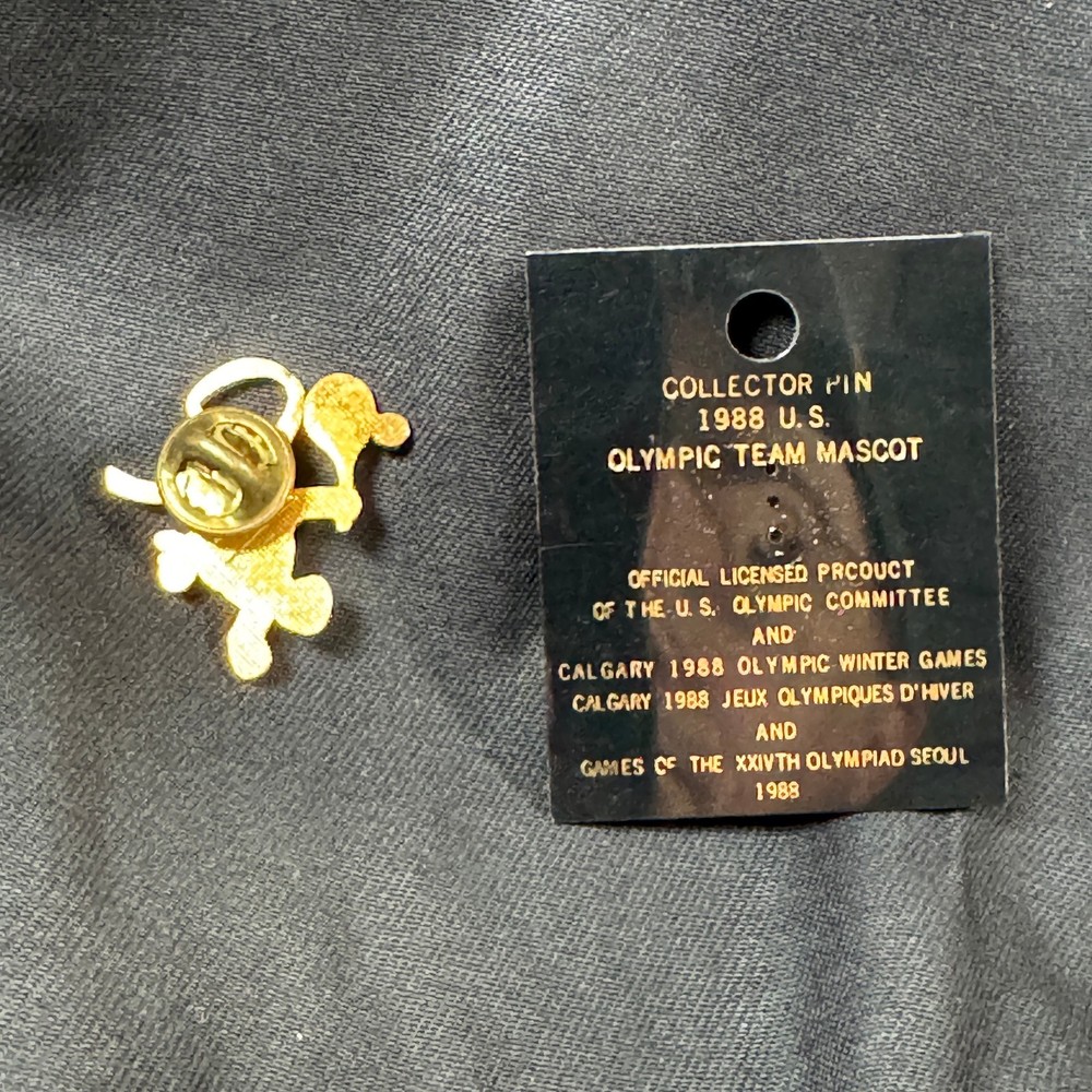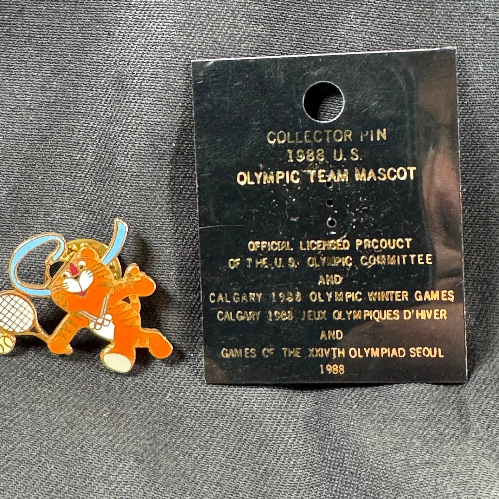 Event/Mascot: Hodori — 1988 Seoul Summer Olympics Type: Hard-enamel lapel pin; single post with butterfly clutch Theme: Tennis / U.S. Olympic Team Mascot (official licensed product) Size: Approx 1" (25 mm) wide (estimate from photos) Included: Pin + original card Notes: Vintage item; minor storage wear consistent with age
