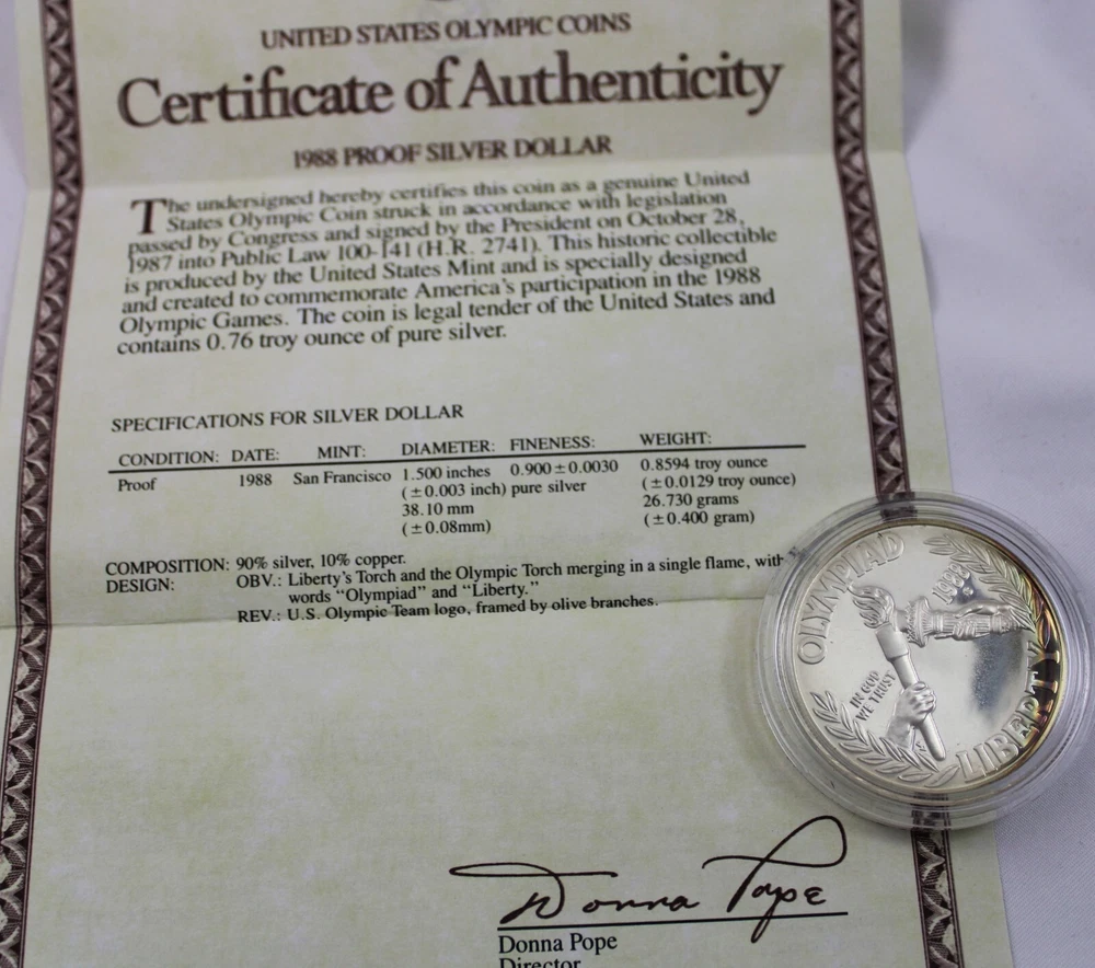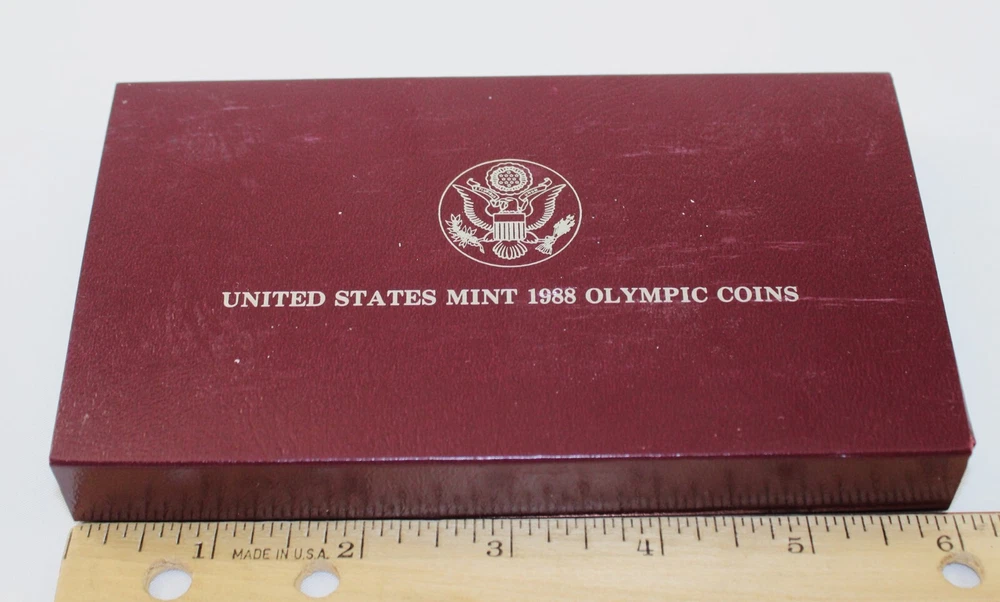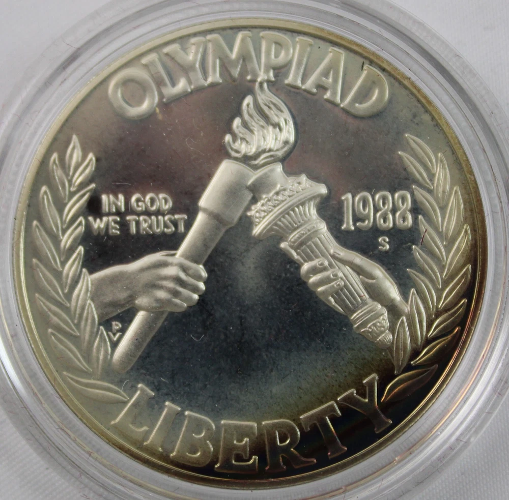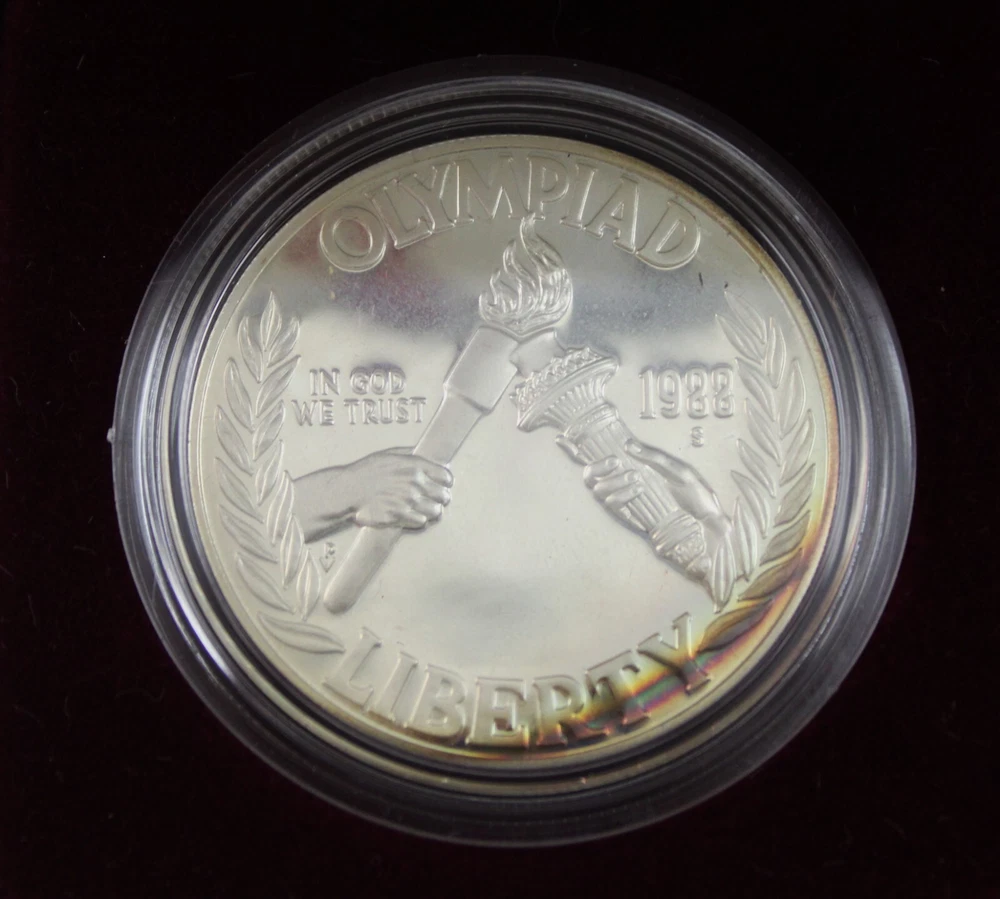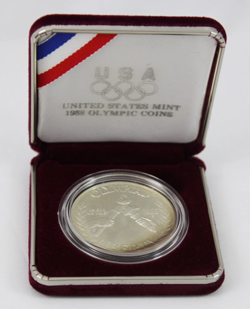 Weight of Coin in box: 4.82 oz Condition: This is from a collection we purchased. This 1988 S US Mint Olympics Proof Coin is in aged condition - the coin has heavy toning on both sides and milky fading on it. The one dollar proof coin is in the original Box & has a COA. The coin was minted at San Francisco mint. The coin is 90% Silver content. Please view all photos. If you are a resident of the State of Indiana, there will be a 7% sales tax on your invoice. **There are some States that have started charging sales tax for online purchases, ebay will automatically add the tax to your invoice. We cannot remove this tax. We are only authorized to ship to the confirmed address supplied from Ebay Items or combined items over $75.00 US will be shipped USPS Priority. Items over $1000.00 US will be shipped USPS Express. We ship from the Midwest, Monday through Thursday, 8:00AM to 11:00 AM Eastern Standard Time. Purchases made after business hours, weekends, and holidays will be processed the following business day. A tracking number will only be uploaded to ebay once the item has shipped. No changes can be made once payment is received. If a mistake occurs, we MUST cancel and refund the payment. You will have to repurchase the item (s) with the correct information on for your address and payment method. Multiple orders paid with multiple transactions will be shipped separately and will not qualify for the discounted shipping fees Payment is expected within 3 days of winning an item. If you are having a problem with payment, please contact us. We are happy to combine shipping on items - just wait to pay until you are done shopping and then we will send you a final invoice with a combined shipping discount. We require payment within 7 days after your first item was won. On any international packages valued at $50.00 or over, I will now only ship by Priority International Mail or Fed EX. A tracking number is provided for those services. Even if the package weighs less than 4 lbs, which qualifies for First Class International Mail shipping, I will ONLY ship via Priority International or Priority Flat Rate International mail. Ebay uses the tracking number to prove the item has been delivered. ***International Buyers Please check with your country's customs office to determine what these additional costs will be before bidding. These charges are normally collected by the delivering freight (shipping) company or when you pick the item up- do not confuse them for additional shipping charges. We do not mark merchandise values below value or mark items as "gifts" - US and International government regulations prohibit such behavior. Import duties, taxes and charges are not included in the item price or shipping charges. These charges are the buyer's responsibility .