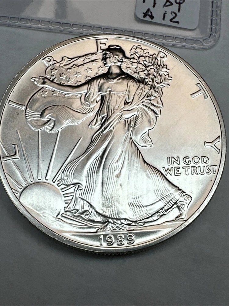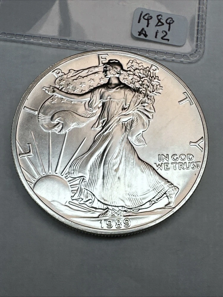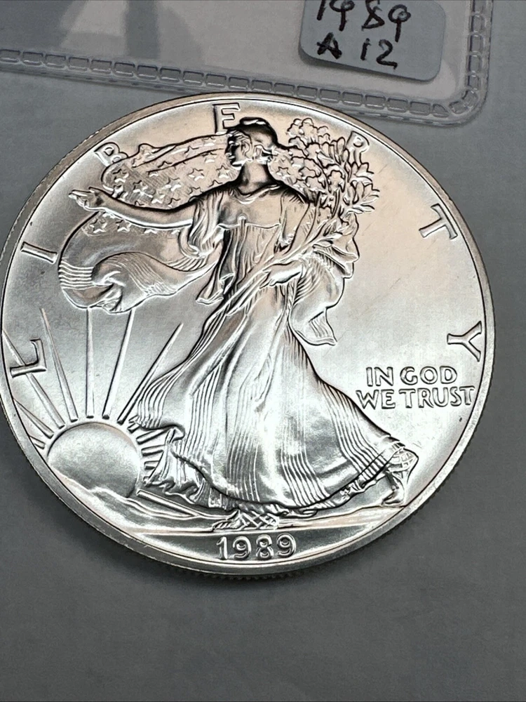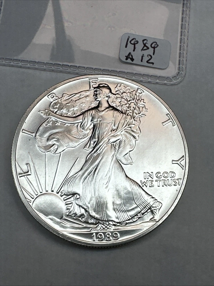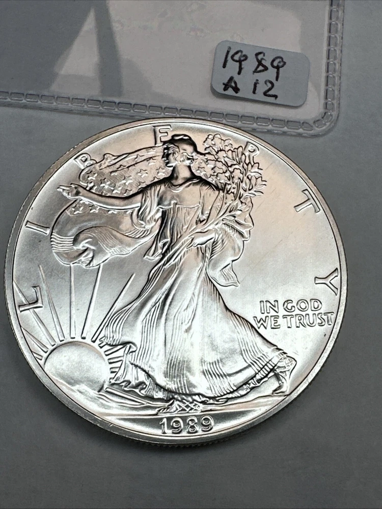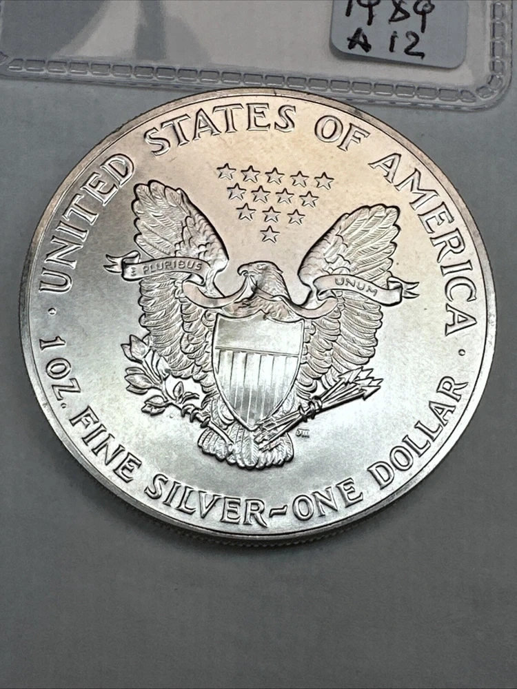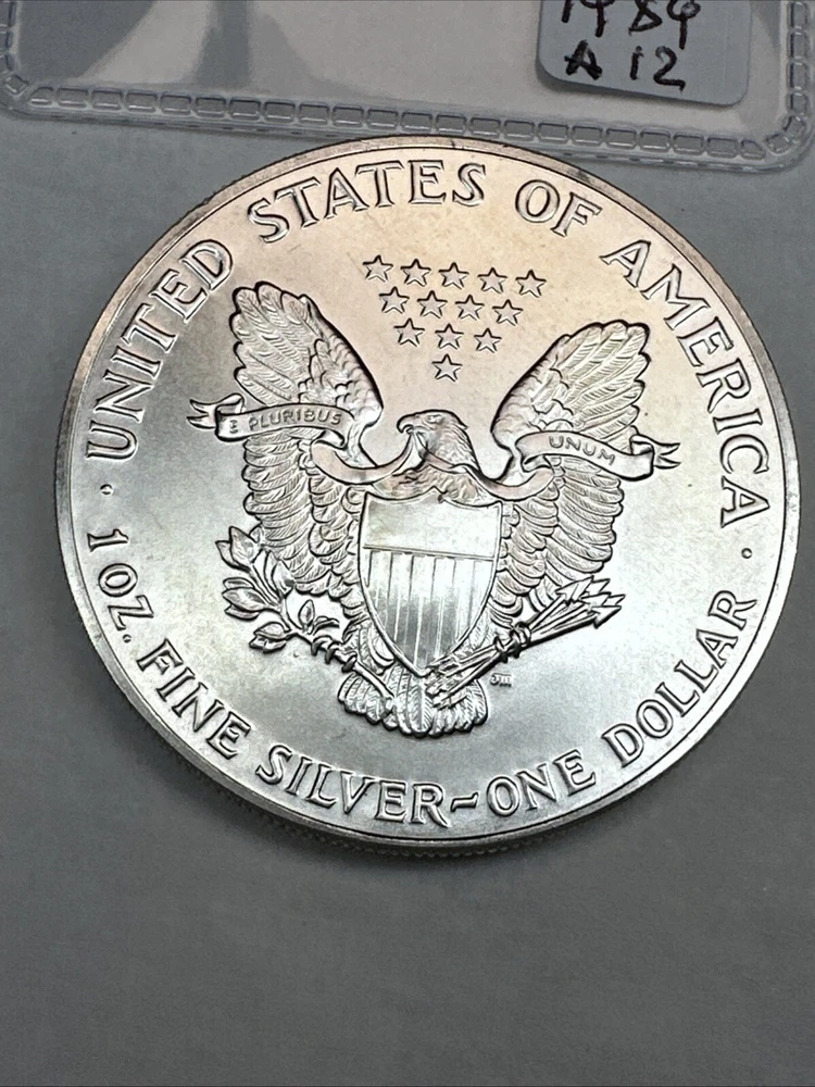 Coin: American Eagle Certification: Uncertified Country/Region of Manufacture: United States Precious Metal Content per Unit: 1 oz Total Precious Metal Content: 1oz Year: 1989 Strike Type: Business Grade: Ungraded Fineness: 0.999 Brand/Mint: U.S. Mint Brand: Silver Eagle Composition: Silver