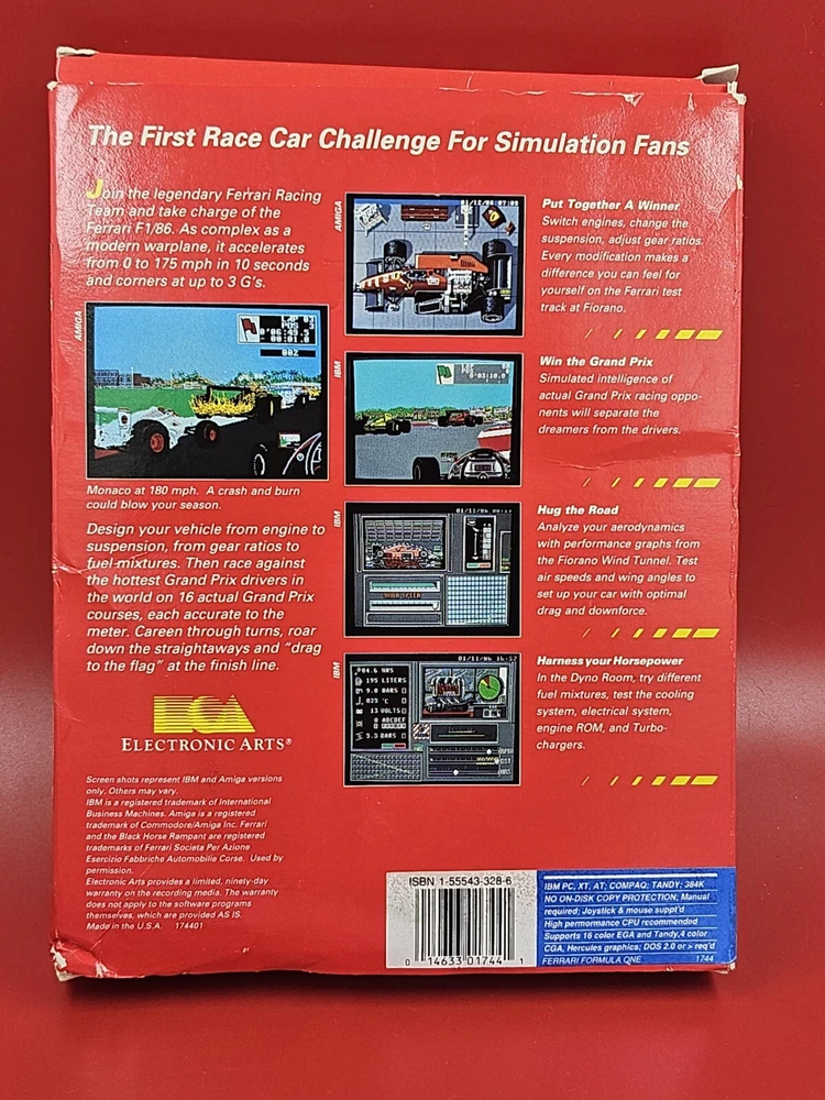 Will come as pictured. Fast shipping. Experience the thrill of Ferrari Formula One Grand Prix racing with this IBM PC simulation game. Developed by Electronic Arts, this game offers a realistic representation of the sport, with challenging courses, realistic graphics, and customizable cars. You can choose from a variety of computers, including IBM, to run this game. This game is perfect for anyone who loves racing and wants to experience the excitement of Formula One racing. With its realistic simulation of the sport, it's sure to satisfy even the most demanding racing enthusiasts. So why wait? Get your hands on this classic game today and start your engines!