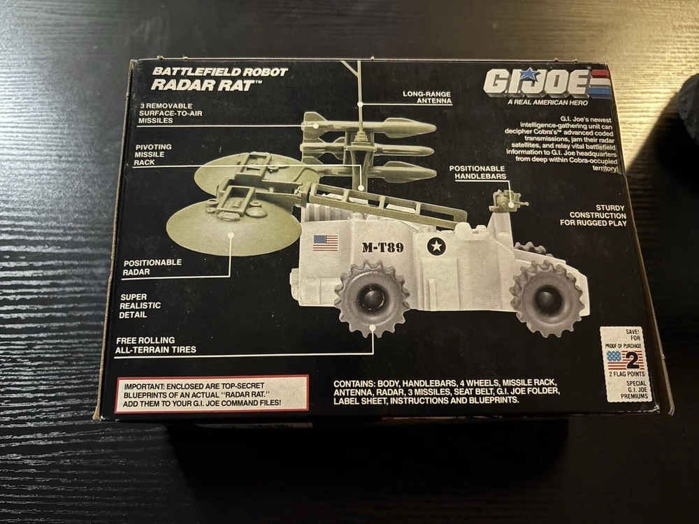This is a vintage 1989 Hasbro G.I. Joe Battlefield Robot Radar Rat action figure accessory. It is an original, sealed item and is part of the G.I. Joe franchise. The figure is made of plastic and is colored in a multicolor scheme. It stands at 3.75 inches tall and is in a 1:18 scale. The item is boxed and has been graded by the Action Figure Authority (AFA). It features details such as signed/unsigned and personalization, and is an excellent addition to any G.I. Joe collection.