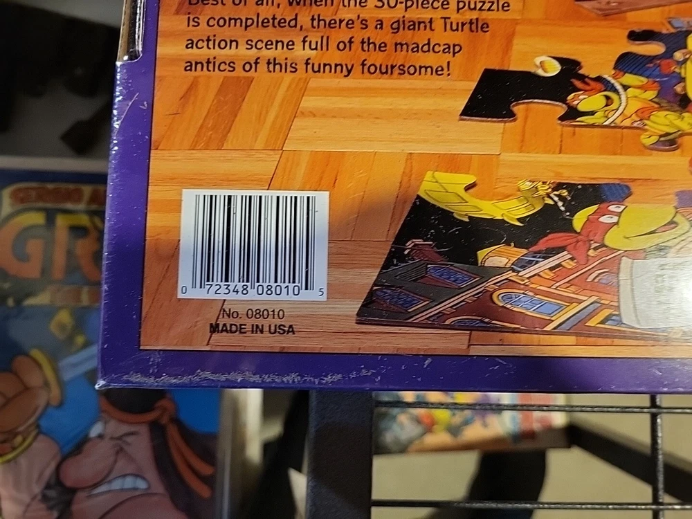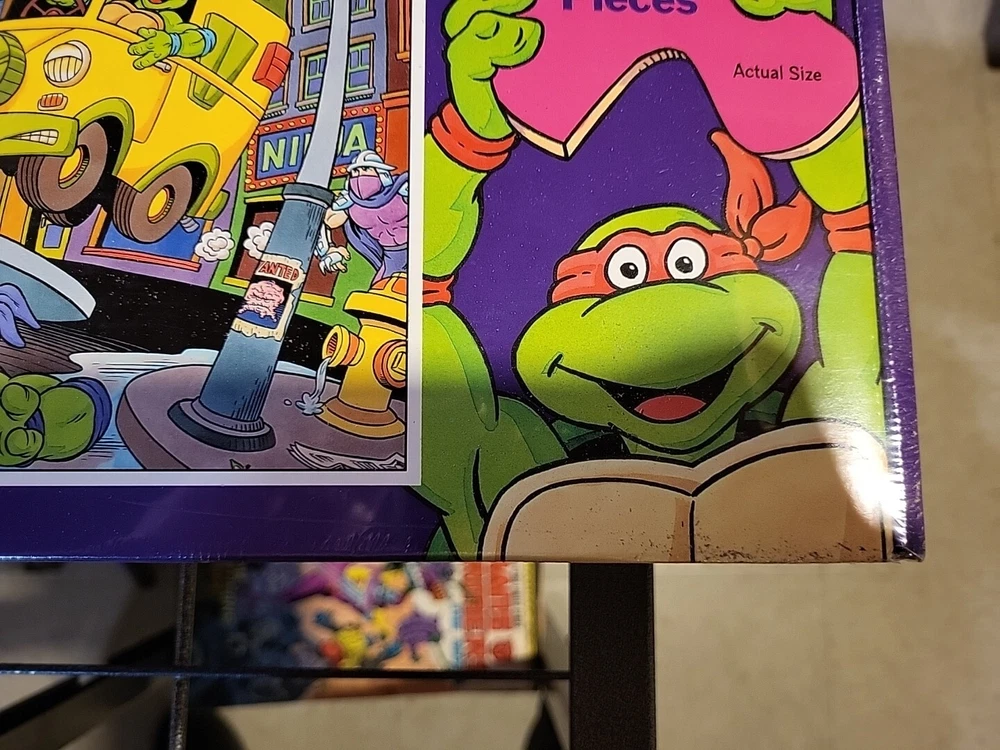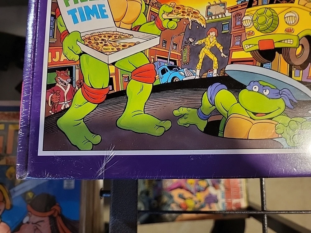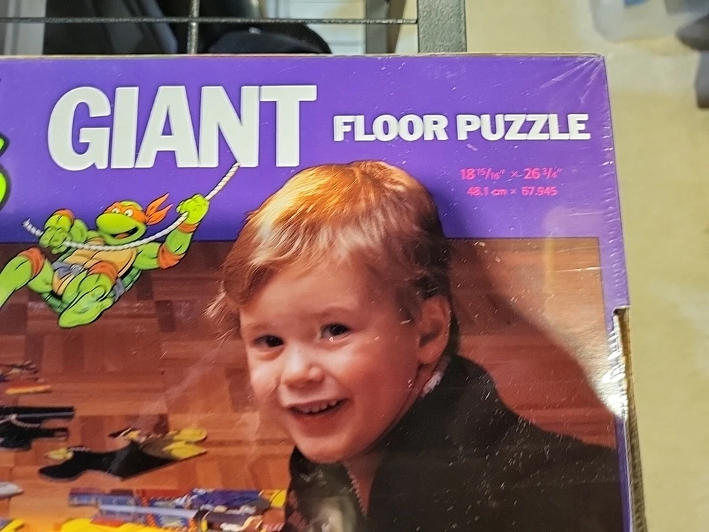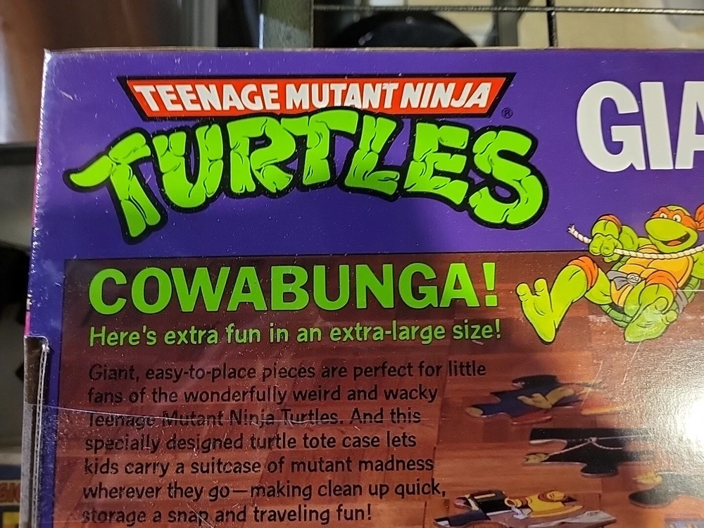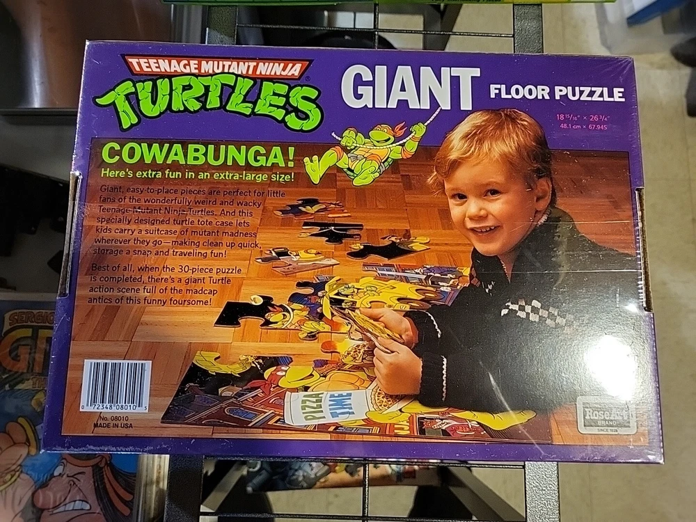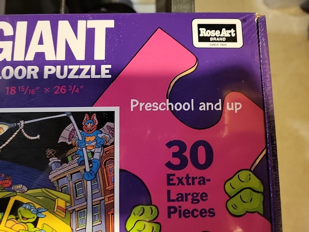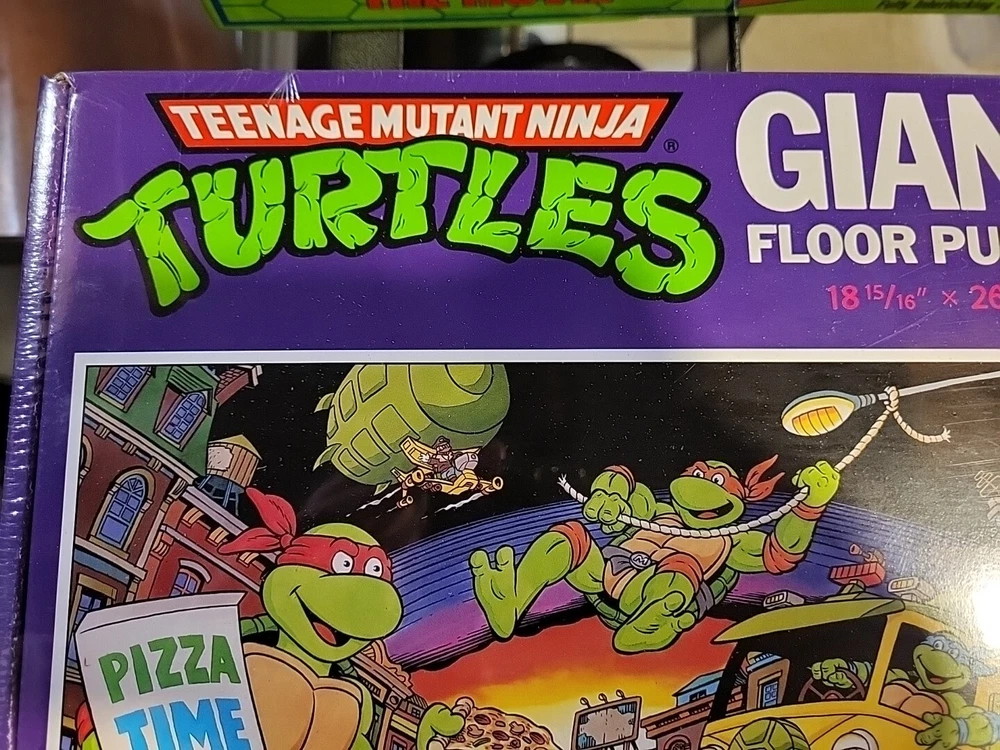 This 1989 Teenage Mutant Ninja Turtles Giant Floor Puzzle is perfect for any fan of the popular cartoon. With 30 extra large pieces, this puzzle is sure to provide hours of fun for kids and adults alike. The colorful and detailed artwork features the beloved characters in action-packed scenes, making it a great addition to any puzzle collection. Made from sturdy cardboard, this puzzle is built to last and can be proudly displayed once completed. The puzzle is new and still sealed, ensuring that all pieces are accounted for. Don't miss out on the opportunity to own this piece of TMNT memorabilia. Brand new factory sealed in cellophane.