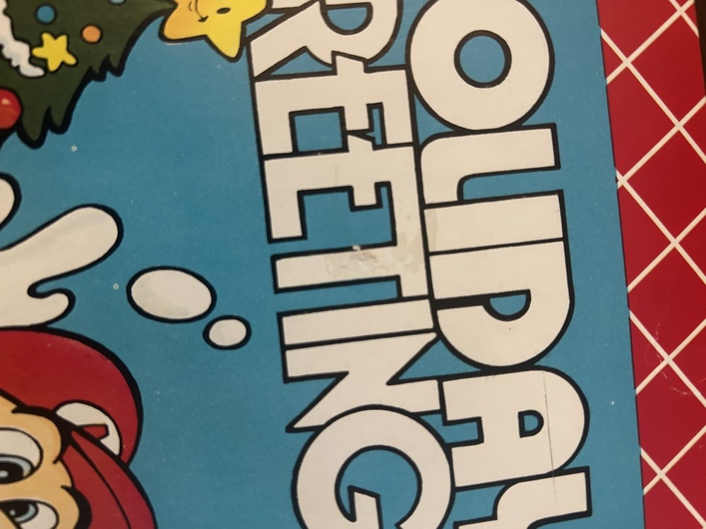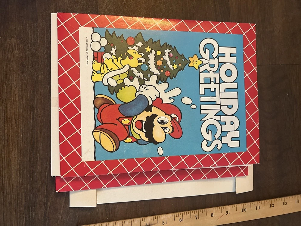 A set of 2 gift boxes from 1989 both are exactly the same. Both used with minor damage from tape use. (Damages shown in pictures) Size is 11x8 size box The product is a rare 1989 Nintendo Super Mario Bros Holiday Greetings Christmas Gift Box set featuring two sets of holiday greeting cards with images of the popular character Mario from the Super Mario Bros. video game series. This nostalgic collectible is sure to delight fans of the iconic franchise and serves as a unique and special gift for any Nintendo enthusiast.
