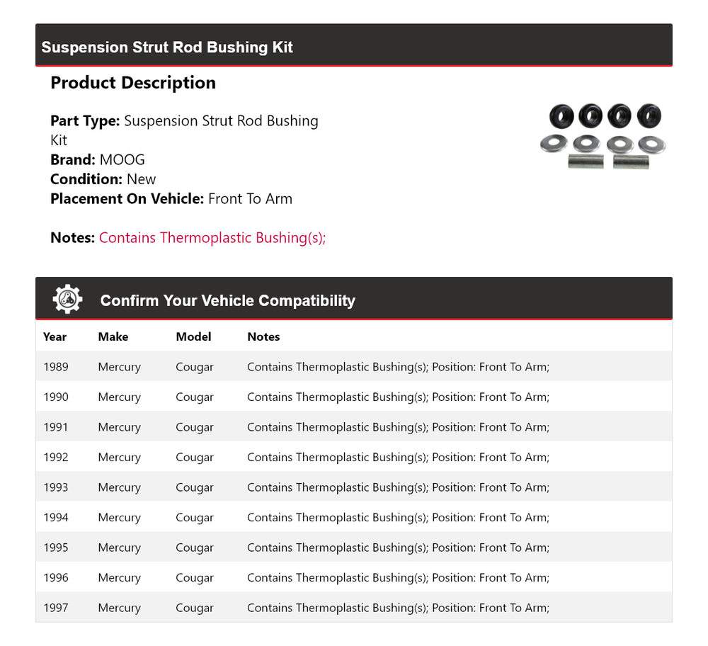 Document For 1989-1997 Mercury Cougar Suspension Strut Rod Bushing Kit Front To Arm MOOG Notes: Contains Thermoplastic Bushing(s); Placement on Vehicle: Front To Arm Product Description Description Brand: MOOG Warranty: 12 Month Warranty Part Type: Suspension Strut Rod Bushing Kit Compatible Years: 1989 1990 1991 1992 1993 1994 1995 1996 1997 Description Strt Rod Bushing Kit Front To Arm Suspension Strut Rod Bushing Kit Easy to install. Restores like-new steering and handling. Engineered to meet or exceed OE requirements. Construction and design validated by MOOG engineers. Incorporates proven design and engineering features. Item Specifics Bushing Inside Diameter: 0.910 IN Bushing Length: 1.190 IN Bushing Material: Polyurethane Meets/Exceeds OE Manufacturer Specs: Yes Bushing Outside Diameter: 1.930 IN Confirm Your Vehicle Compatibility Year Make Model Notes 1989 Mercury Cougar Contains Thermoplastic Bushing(s)| Position: Front To Arm; 1990 Mercury Cougar Contains Thermoplastic Bushing(s)| Position: Front To Arm; 1991 Mercury Cougar Contains Thermoplastic Bushing(s)| Position: Front To Arm; 1992 Mercury Cougar Contains Thermoplastic Bushing(s)| Position: Front To Arm; 1993 Mercury Cougar Contains Thermoplastic Bushing(s)| Position: Front To Arm; 1994 Mercury Cougar Contains Thermoplastic Bushing(s)| Position: Front To Arm; 1995 Mercury Cougar Contains Thermoplastic Bushing(s)| Position: Front To Arm; 1996 Mercury Cougar Contains Thermoplastic Bushing(s)| Position: Front To Arm; 1997 Mercury Cougar Contains Thermoplastic Bushing(s)| Position: Front To Arm; Please read before purchasing Shipping and Cancellation Policy We utilize UPS, FedEx, and USPS for shipping, selecting the nearest available location to expedite delivery. Tracking numbers will be uploaded on eBay upon shipment. Most items are shipped on the same business day. Please note that interchange tables are intended for American Market Vehicles only. All orders are processed automatically. Before placing your order, please: Ensure that this part fits your vehicle by entering your vehicle's Year, Make, Model, Trim, and Engine in the Compatibility Table. Additionally, review the notes section in the compatibility chart for additional specifications about this part. If you're still unsure whether the part fits your car, please contact us for assistance. Verify that the item you're about to purchase will solve the problem with your car. Double-check that the delivery address provided during checkout is accurate. Return Policy We offer free returns for domestic purchases. However, please note that we are not responsible for the cost of international return shipping. Before returning items or leaving anything other than positive feedback, please contact us. For further details regarding returns, please refer to the "Shipping and Payments" tab. Additionally, it is important to understand that manufacturers reserve the right to modify the appearance or material of their items. They may even discontinue an item and replace it with an updated version. Consequently, the picture displayed may not always reflect the most recent changes, though this occurs rarely. We source our pictures directly from the manufacturer and may not immediately receive updated photos if changes are made. California Proposition 65 WARNING: This product may contain chemicals known to the State of California to cause cancer and birth defects or other reproductive harm. For more info go to www.p65warnings.ca.gov 2024 DTautoparts All Rights Reserved